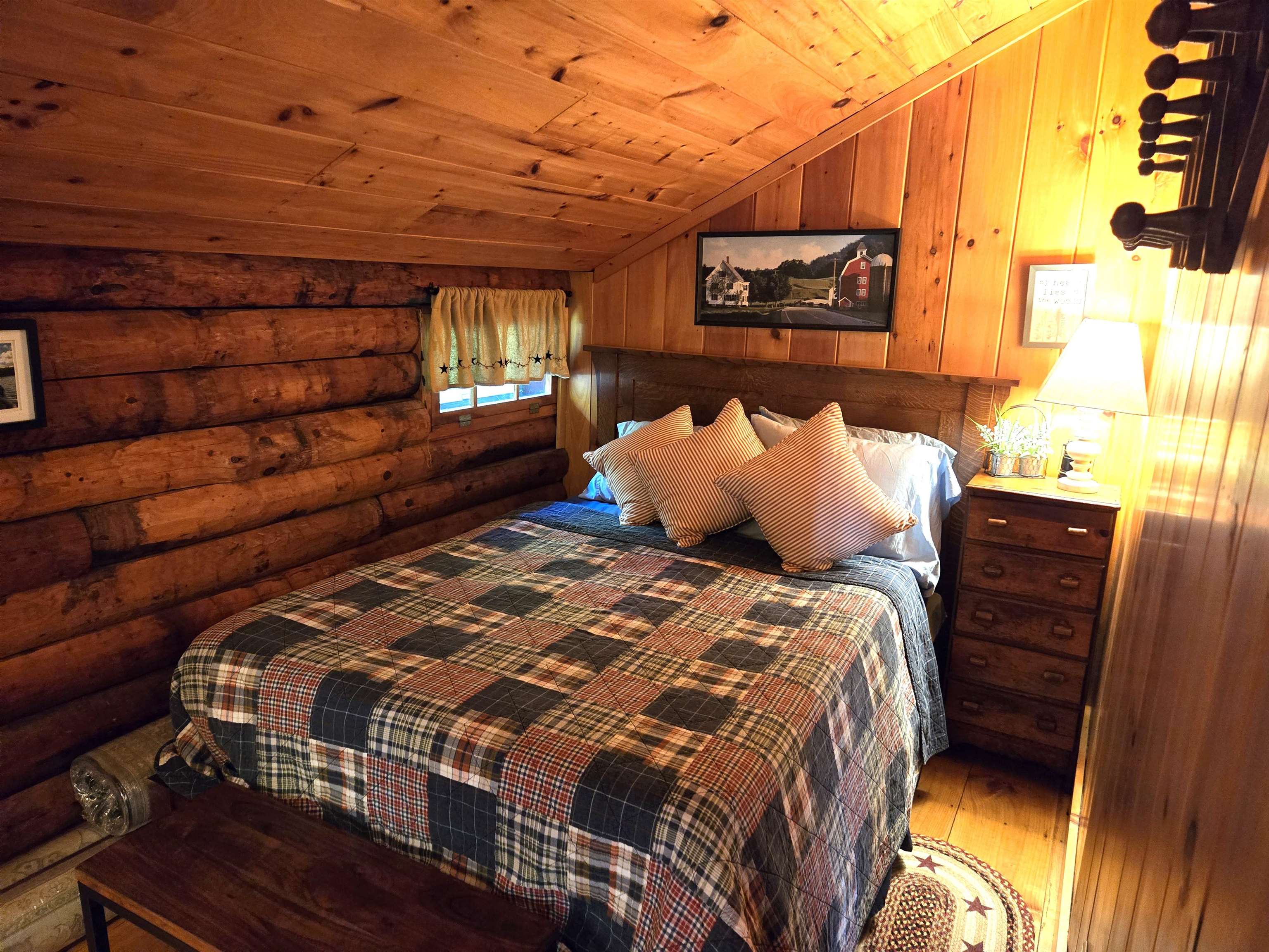 If you were to imagine the idyllic Vermont log cabin, this is it. Privately situated on 6.7 acres surrounded by manicured lawns, woods and a small pond, all at the end of a beautiful wooded lane. Sit on the front porch overlooking the serene setting or cozy up to the firepit on a chilly fall evening. The cabin has been upgraded to perfection with all new Anderson windows and doors, new appliances, new gas stove, insulated walkout basement, a new water pump and new underground electric service. In addition there is a relatively new propane powered standby generator plus super high speed fiber optic broadband. A three bay barn/garage with EV charger is located just a few steps from the house. With just a few exceptions, the high quality furnishings shown in the pictures, right down to the dishes, are included in the sale. Currently formatted to sleep six. Close to Woodstock, Barnard General Store, Silver Lake and Silver Lake State Park and beach. Moving in just involves you bringing your suitcase!