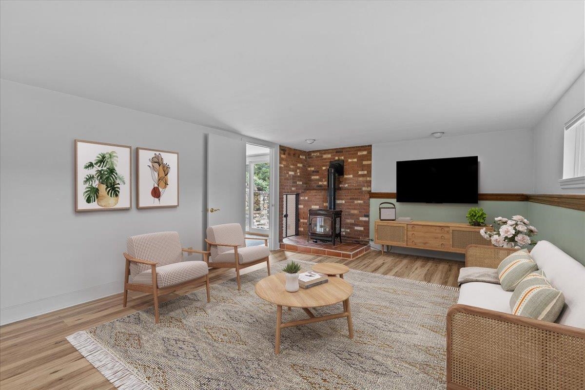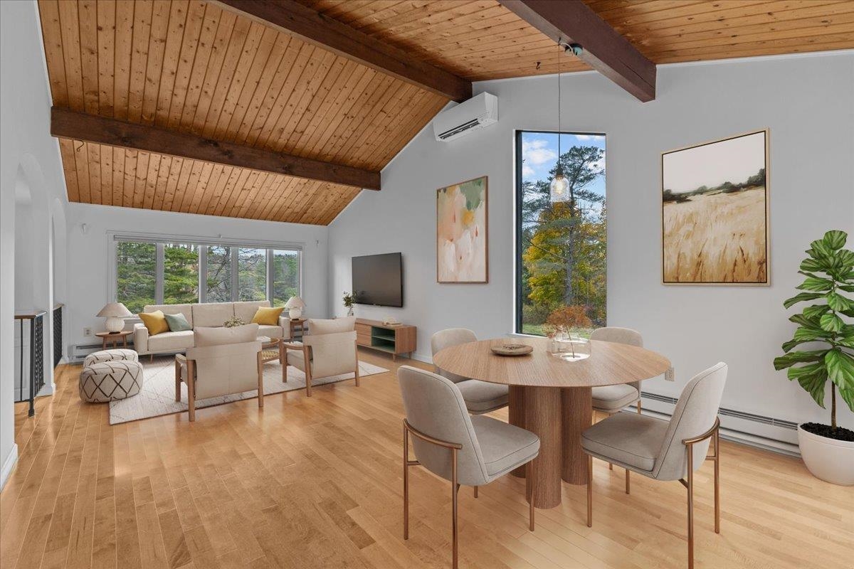Cathedral Ceiling, Dining Area, Wood Fireplace, Living/Dining, Natural Light, Natural Woodwork, Vaulted Ceiling, 1st Floor Laundry