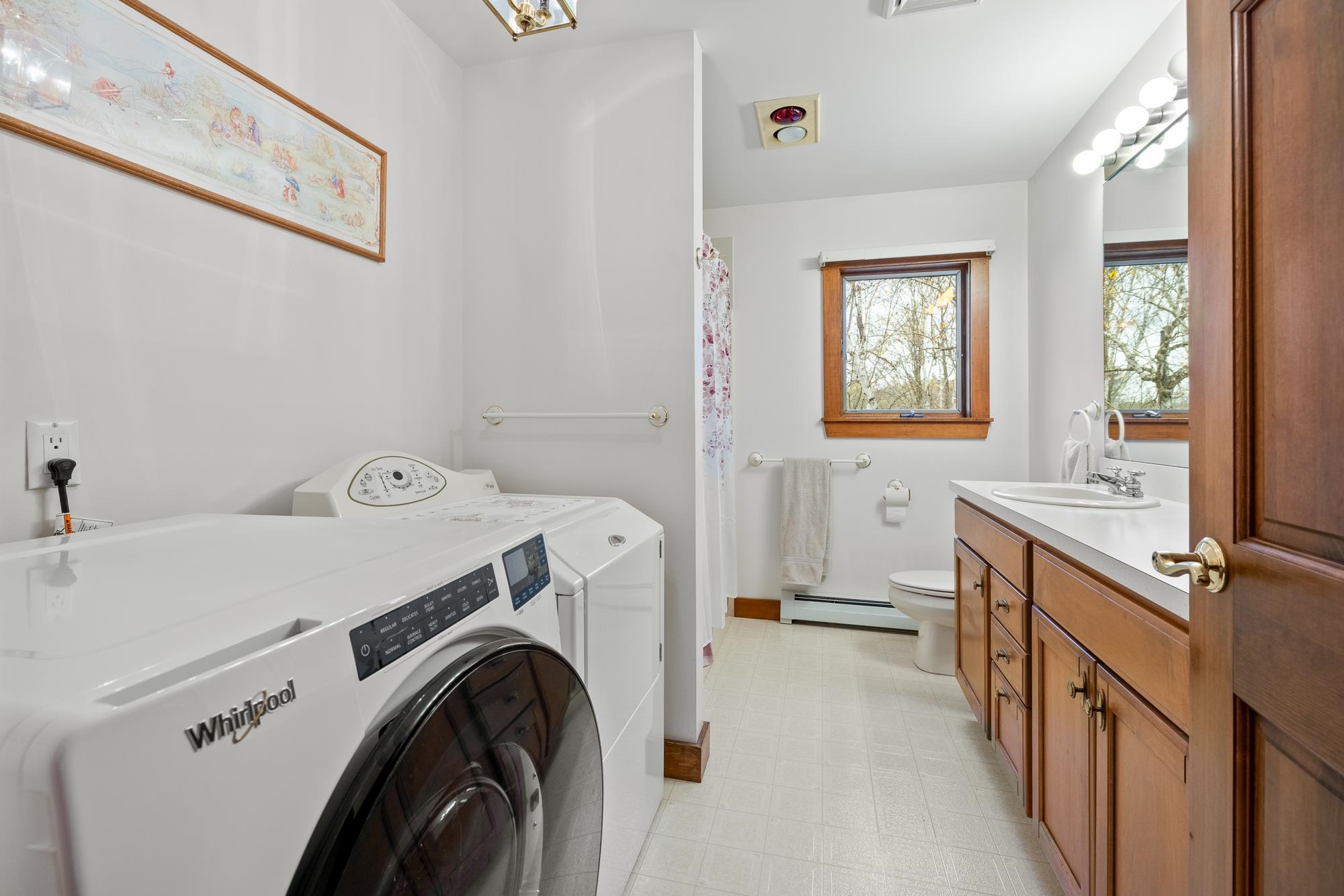 - Cathedral Ceiling, Ceiling Fan, Dining Area, Wood Fireplace, 1 Fireplace, Primary BR w/ BA, Natural Light, Natural Woodwork, Indoor Storage, 2nd Floor Laundry