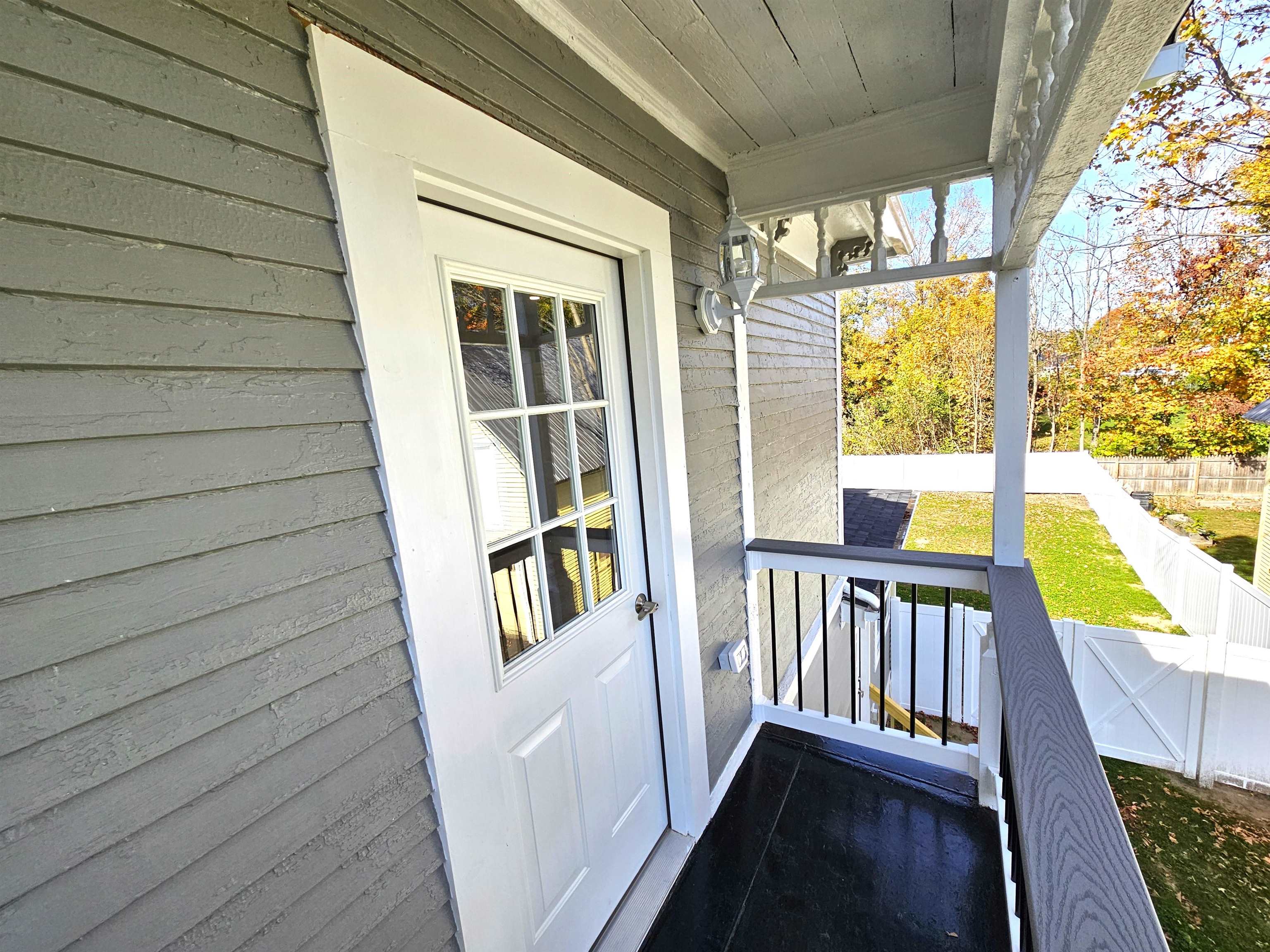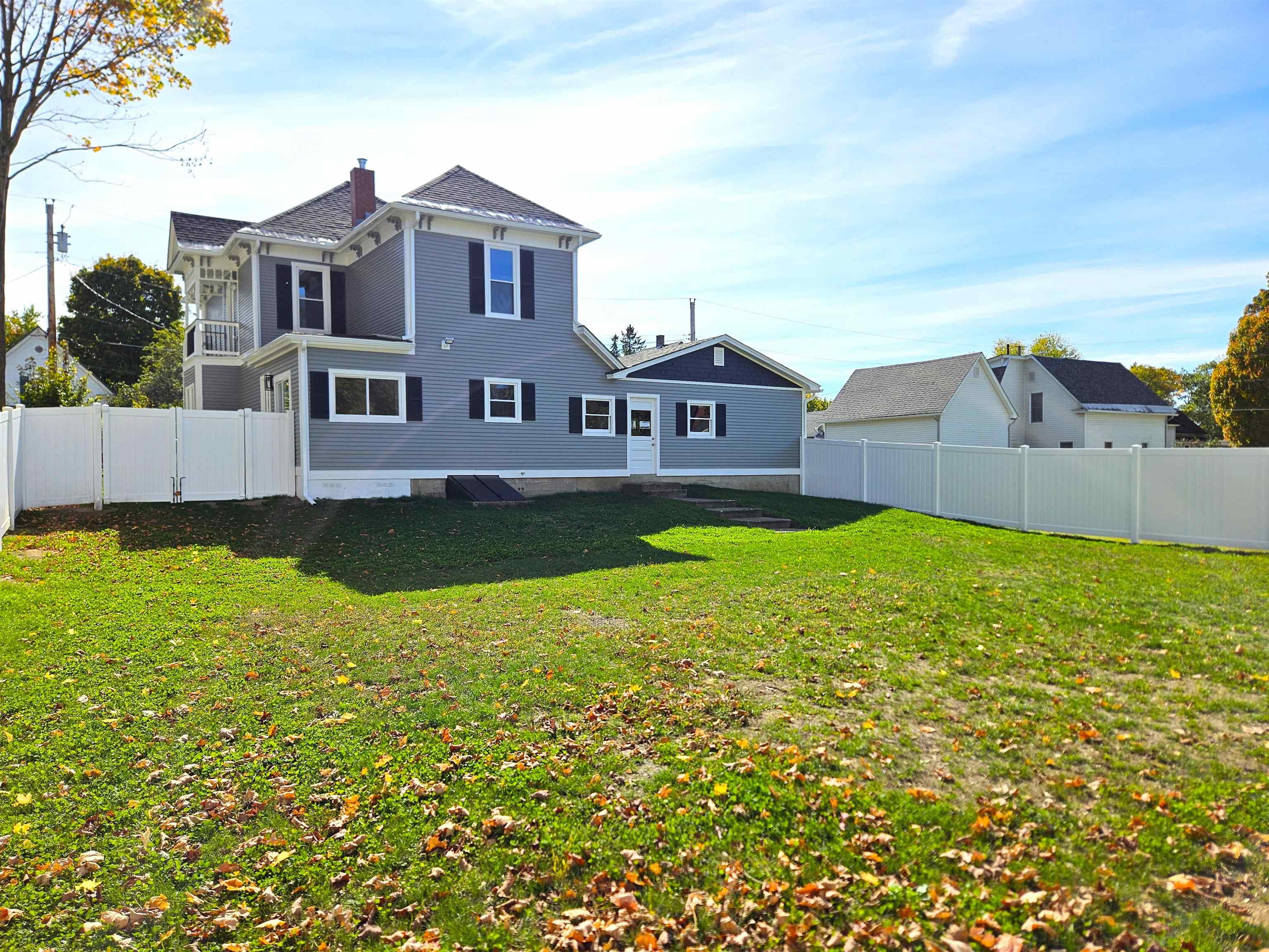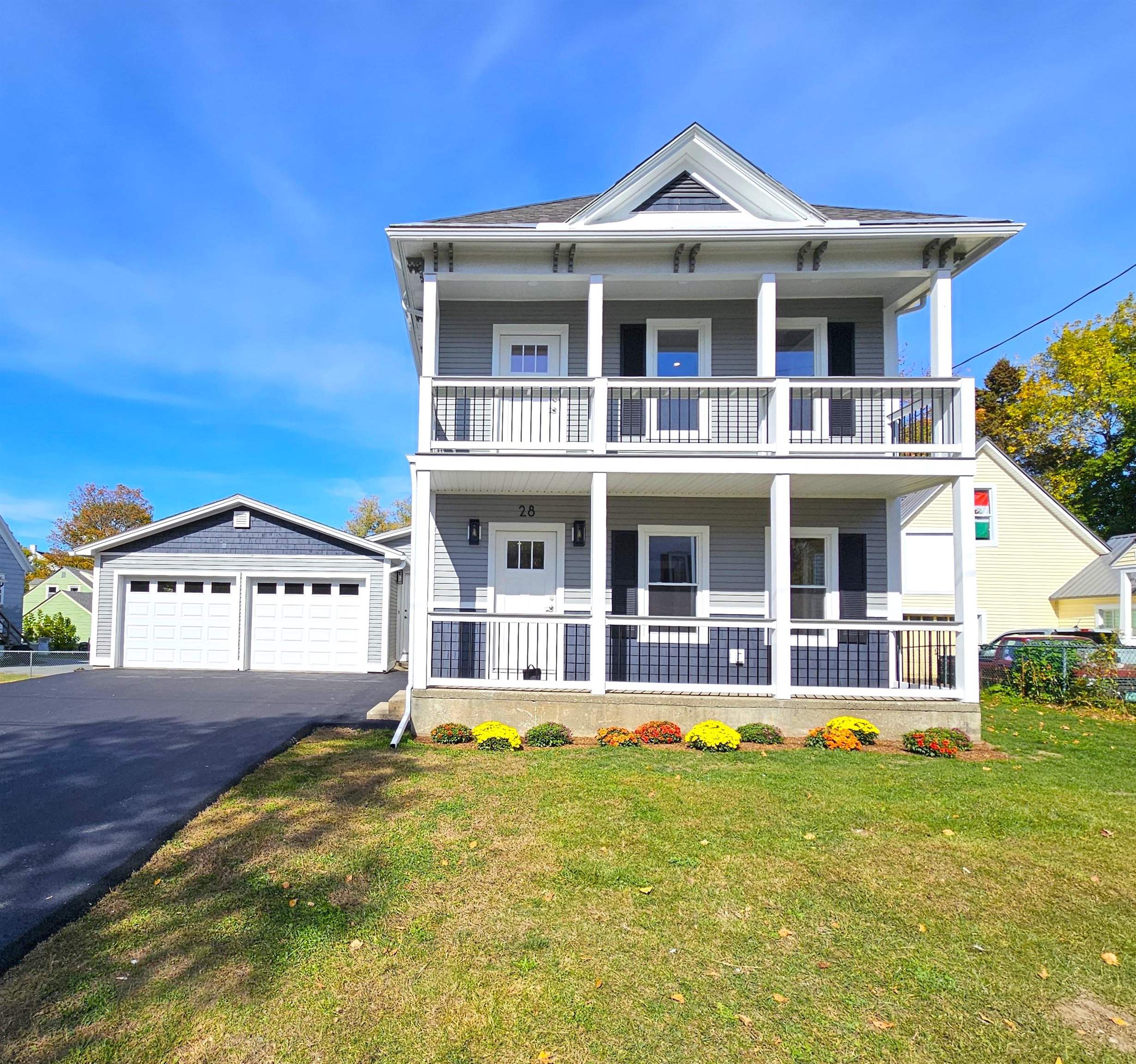 This stunning 1910 Colonial has been completely transformed, blending timeless charm with modern comfort, with every upgrade already completed. Offering approximately 1, 800 square feet of finished living area, the main level features a gorgeous new kitchen with stainless appliances open to the dining area, a spacious living room with a striking hearth, gleaming hardwood floors, and a ¾ bath with laundry and a custom tiled shower. Upstairs, you’ll find four bedrooms, a full bath, and access to both a covered second-story porch in front and a covered side balcony—ideal for relaxing outdoors. The ground-level covered porch makes a perfect formal entry, welcoming you into a home that truly shows like new with quality craftsmanship and finishes throughout. Enjoy a huge fenced backyard in a quiet neighborhood setting, plus the convenience of a 2-car attached garage. Recent updates include a new roof, Harvey windows, wiring, plumbing, boiler, hot water heater, spray foam insulation, garage doors, lighting, trim, and more. Fully insulated and extremely energy efficient, this home is also served by public water/sewer, offers access to high-speed internet, and is within walking distance to schools, the bike path, and in-town amenities. Move right in and enjoy quality living with every modern upgrade already in place.