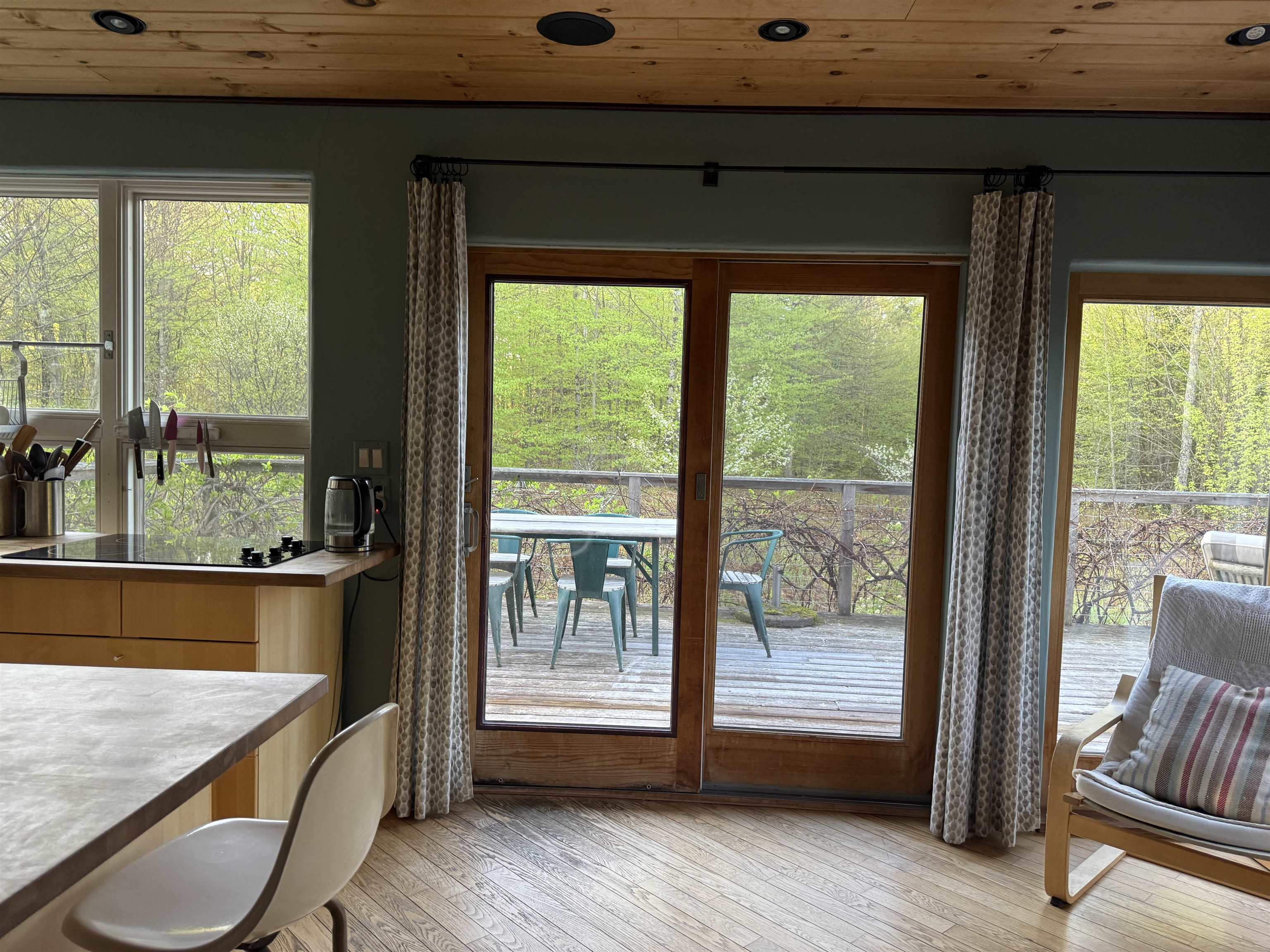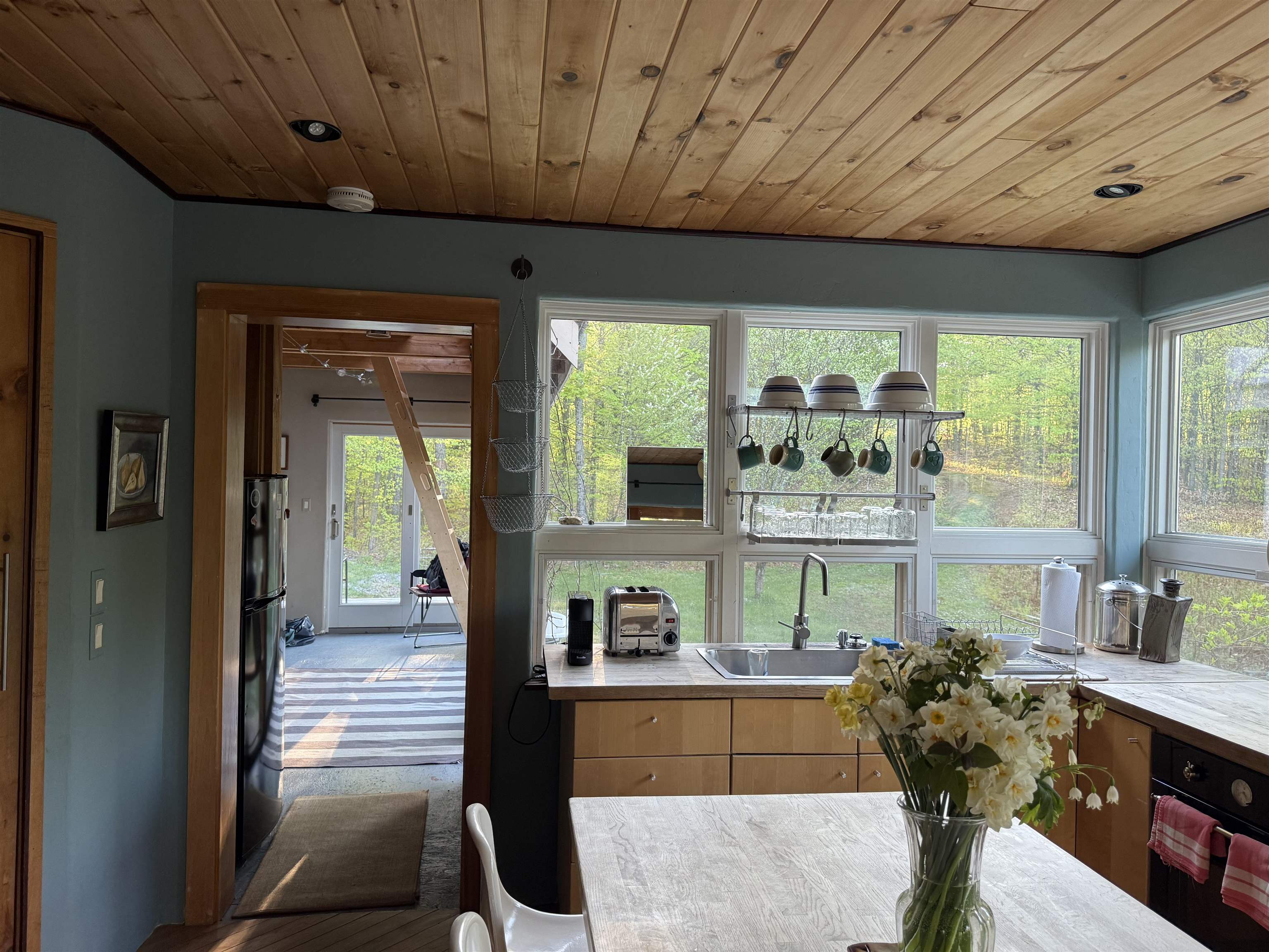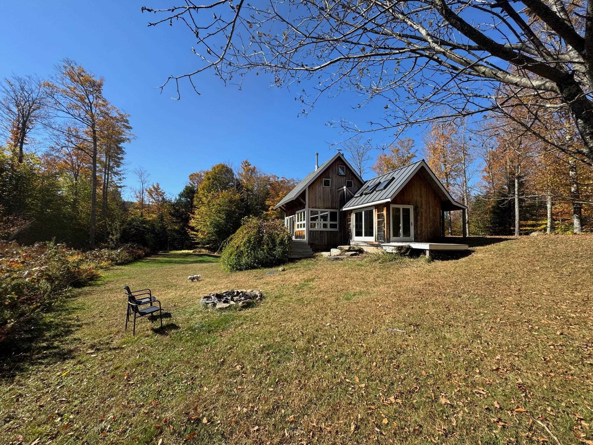 This lovingly designed and maintained, energy efficient modern cottage is perched on a private, forested knoll and features incredible light filled interior spaces, wrap around deck, cozy bedrooms, two skylit lofts, and an airy living room. The 9-acre lot offers complete privacy, peace & quiet and includes a brook, nice open yard surrounded by mature woods, perennial gardens, fruit trees, and berries. Wrap around windows in living area makes inside and outside blend, bringing nature into your living space year-round. With high-speed internet/Wi-Fi and easy access to Plainfield, Montpelier & Barre, it’s a perfect blend of nature and convenience. Large deck allows for 3 season indoor/outdoor living. Passive Solar design, EV car charger set up at driveway, high efficiency space heater and on-demand water heater create a perfect base for a low carbon footprint lifestyle. Clear skies are perfect for stargazing from your stone fire pit. Come take a look at this Gem nestled in the rolling hills of Central Vermont before somebody else snaps it up. Showings start Friday, 10/10 with Open House Saturday, 10/11, 10am-1pm.