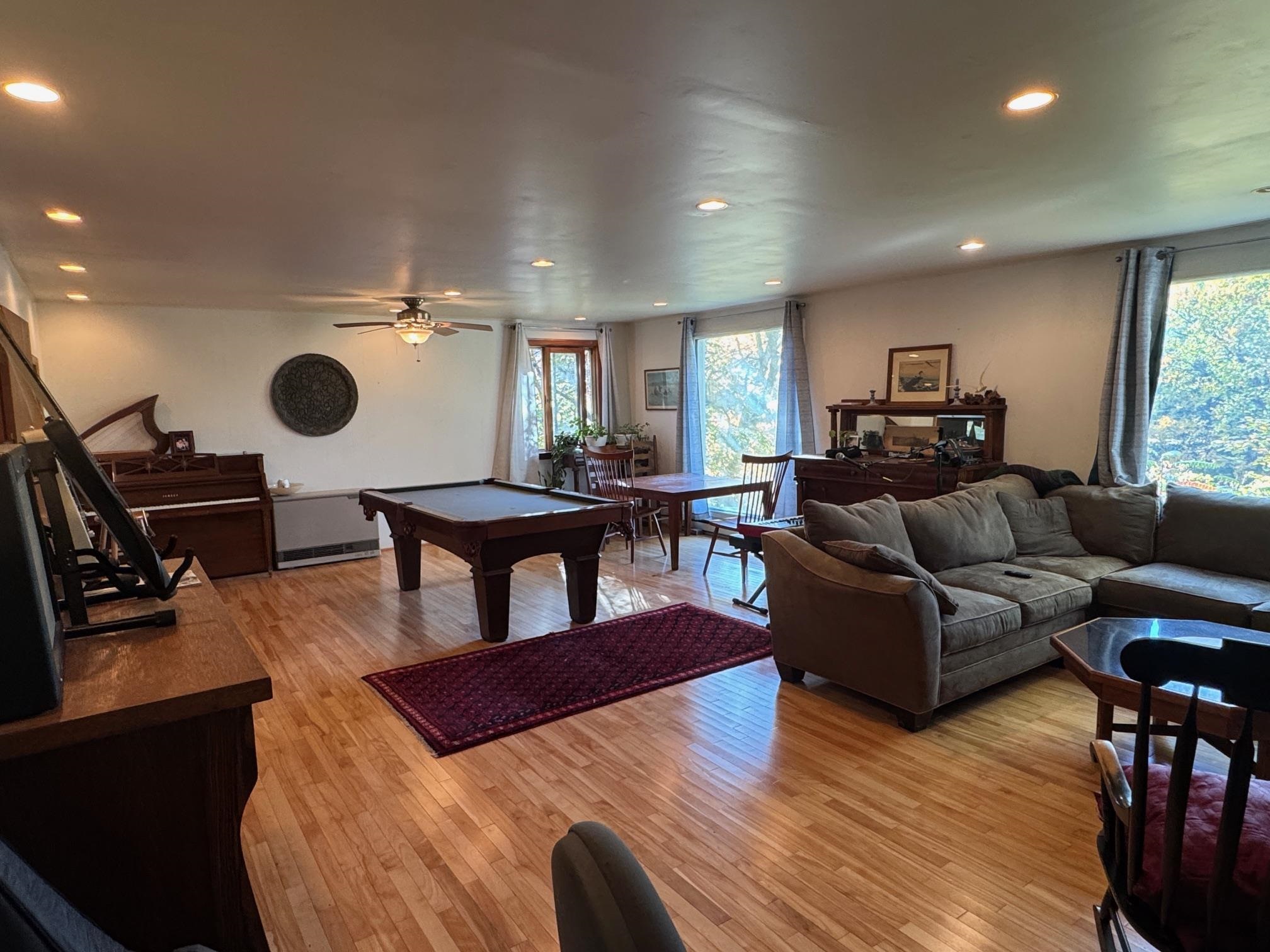 - Ceiling Fan, Dining Area, 1 Fireplace, Hearth, Living/Dining, Natural Light, Basement Laundry
