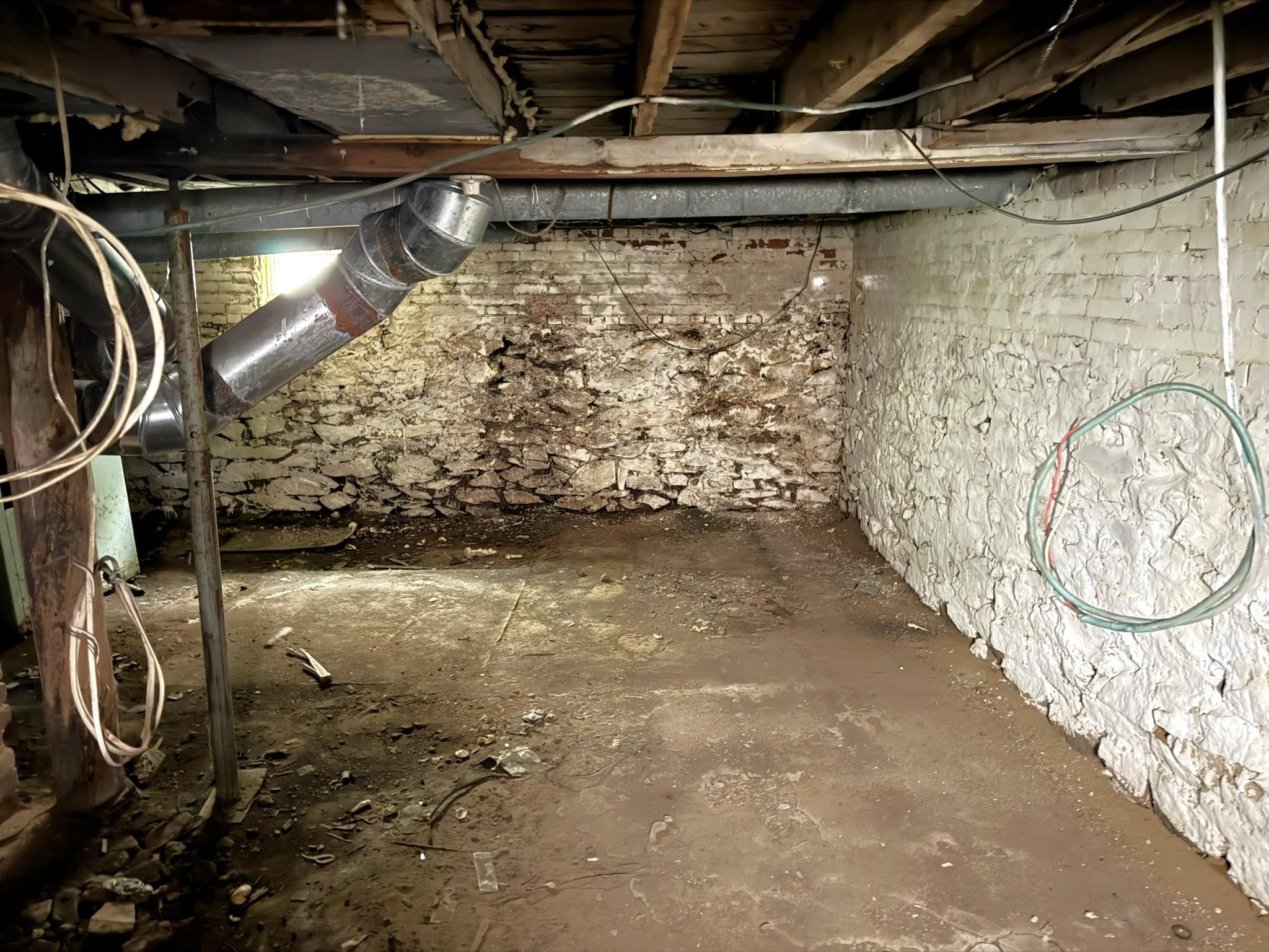 - Concrete, Dirt Floor, Full, Interior Stairs, Unfinished, Interior Access, Basement Stairs