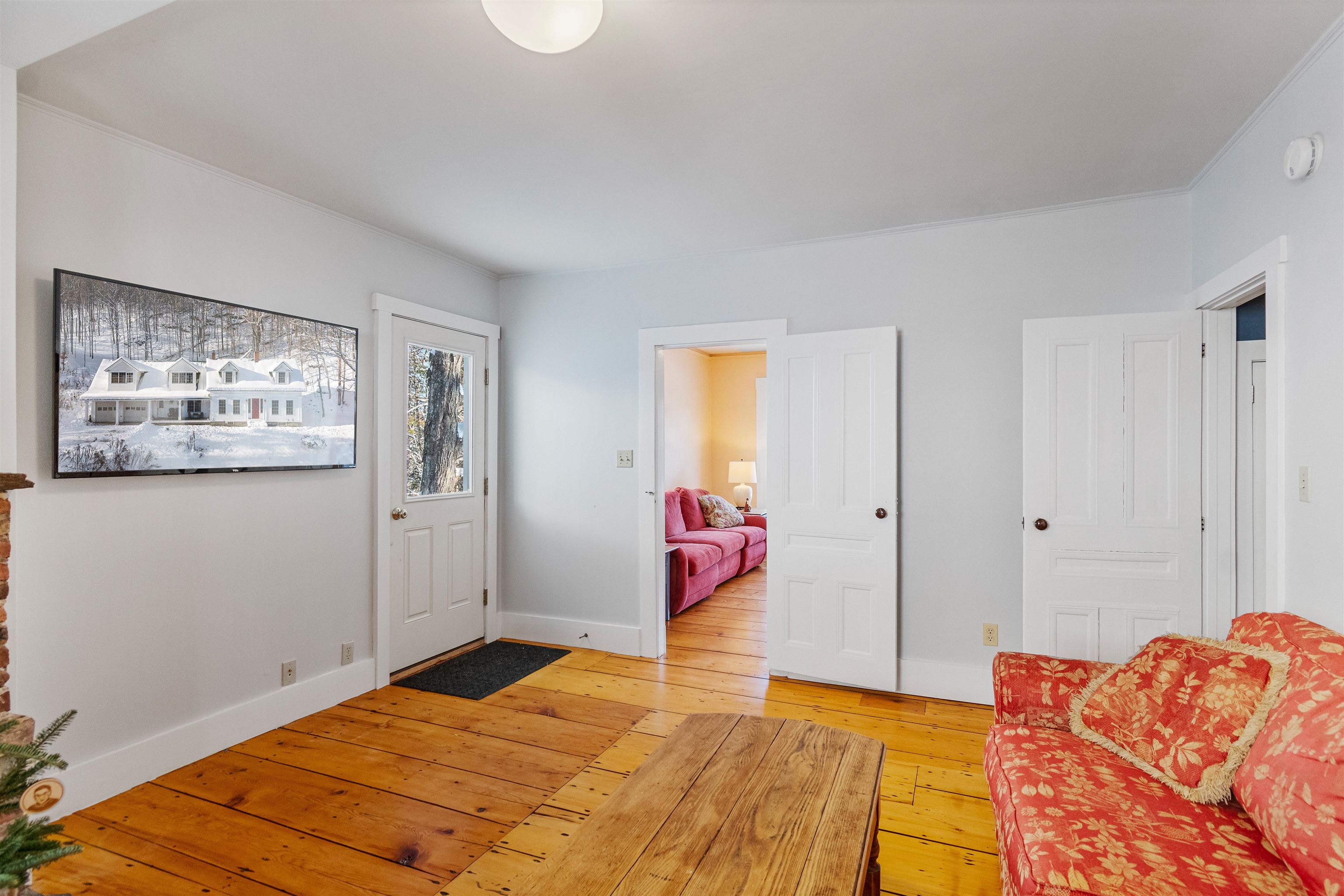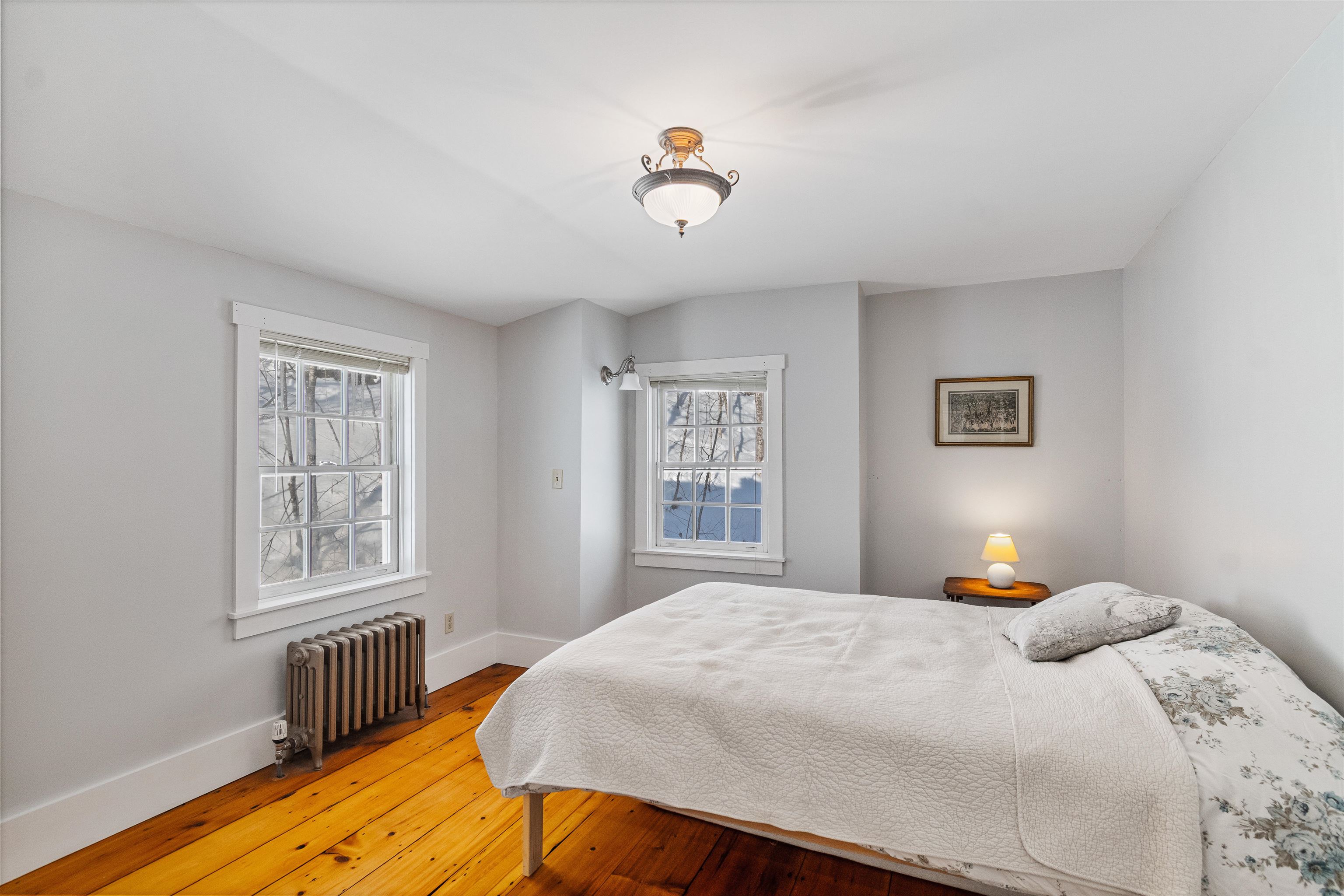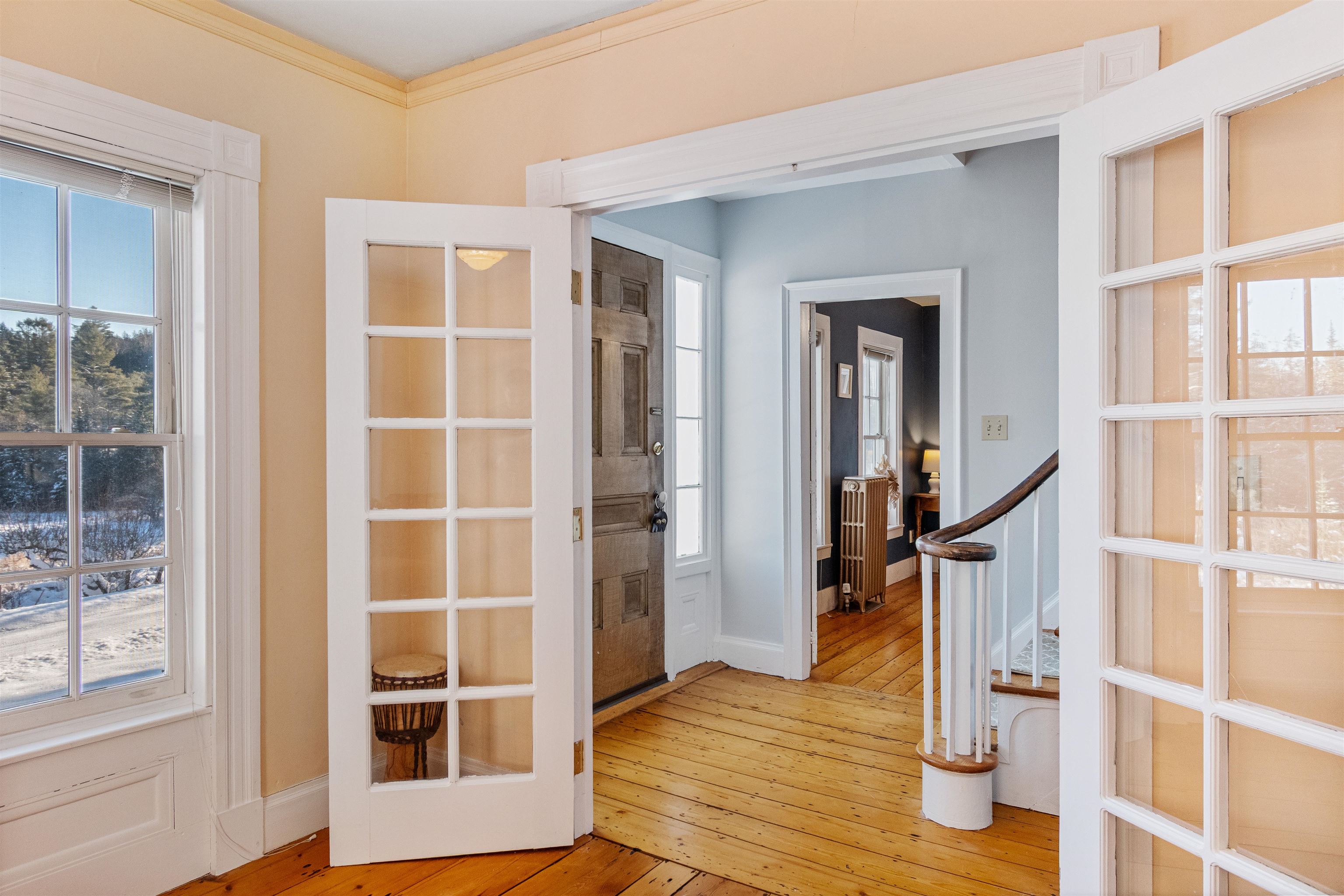 Quintessential farmhouse on 12 acres on a quiet country road in the coveted community of Calais. This classic gem has seen many renovations and energy improvements over the past 25 years, such as a new standing seam roof, windows, heat pump water heater, Buderus boiler, insulation, energy efficient appliances and a recently built studio space. Its vintage charm was carefully preserved with the addition of refurbished antique radiators, antique doors, and wide plank wood flooring. It has a classic farmhouse flow – entering through a mudroom into a large welcoming kitchen with a central woodstove, off the kitchen is an expansive pantry which flows into a first floor laundry room and full bath. The kitchen opens to a formal dining room then out to the light filled foyer which opens to the living room and beyond that a cozy family room with the potential for a 2nd woodstove. The 2nd floor is expansive with three bedrooms and a 3/4 bath off the central staircase. Beyond the third bedroom is access into the primary bedroom bathroom suite, a second office, and the recently built studio space with it’s own kitchenette, all accessed by a second stairway off the kitchen. The front porch looks out onto beautiful property perfectly set up and well suited for homesteading with a barn and hay loft, run-in sheds, a greenhouse, chicken coop, and a pond. In the spring and summer the landscape is abundant, bursting with colorful perennial flowers, apple, pear and plum trees and berries.