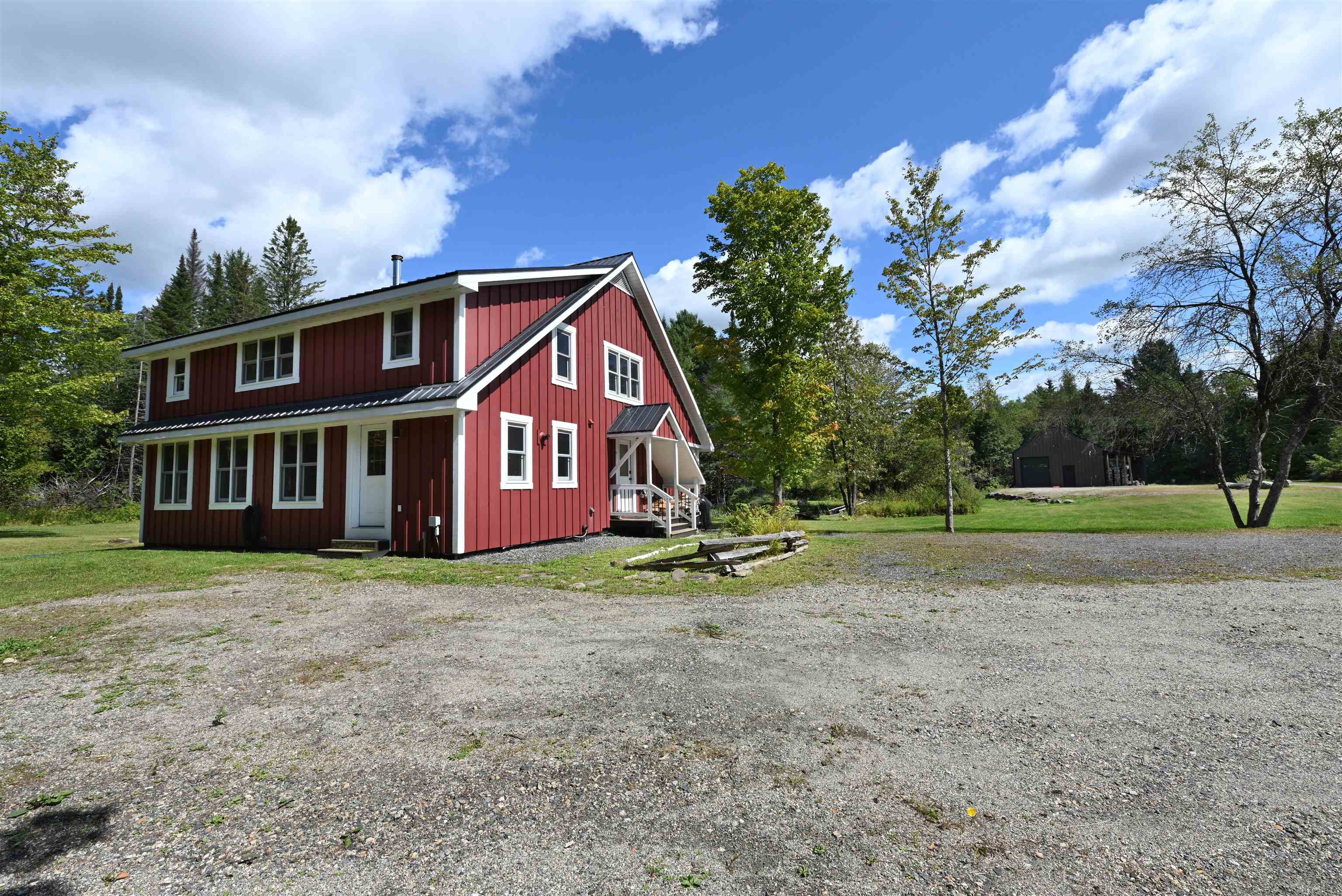 Discover your private retreat on 114 acres of Vermont woodland, just 17 minutes from Burke Mountain and under 2 miles from Caledonia County Airport, where scenic foliage flights and flight training are offered. This 2-bedroom, 2-bath post-and-beam Cape blends rustic charm with modern comfort, offering both a serene lifestyle and proven income through Airbnb. The main level features wood flooring, a sunlit great room with stone hearth, built-in bookcases, and dining area. The kitchen includes new stainless-steel appliances, gas range, and opens to a cozy living room with wood stove. A flexible office/guest room and a tiled ¾ bath with heated floors, laundry, and cold plunge tub complete the first floor. Upstairs, the primary suite offers a large walk-in closet, dual vanity, and tub/shower, while a guest bedroom has its own spacious closet. Outdoor living shines; relax on the porch overlooking the pond and footbridge, refresh in private outdoor showers, or enjoy the nearby wood-fired sauna. A firepit with benches, multiple campsites, and a dedicated RV site with hookups and deck create endless opportunities for hosting or rental income. A massive two-story garage/workshop with four bay doors accommodates equipment of almost any size. Energy independence is ensured with a solar array, Briggs & Stratton battery bank, and enclosed propane generator. With trails for year-round exploration, this property is both a tranquil homestead and an income-generating investment.