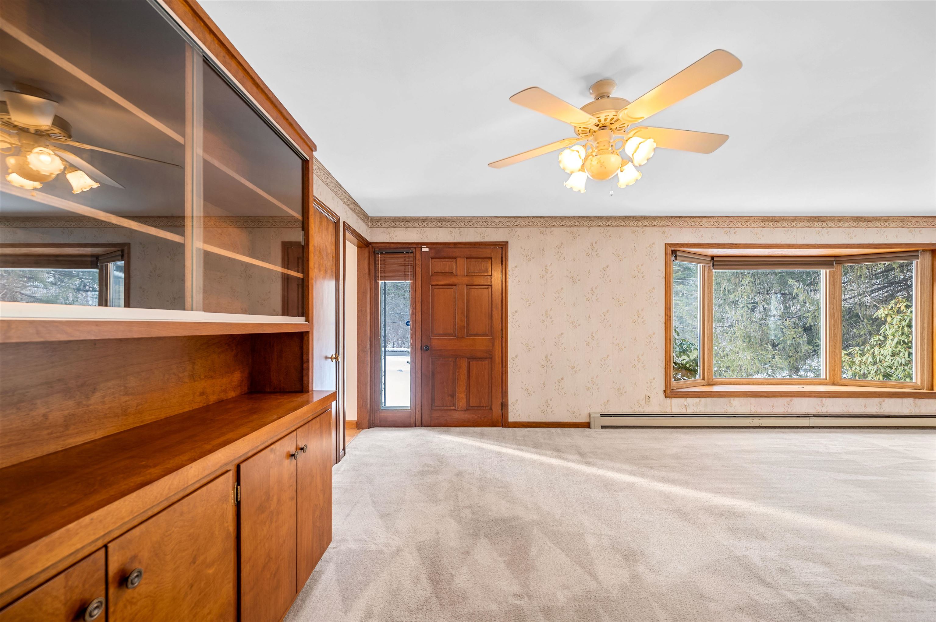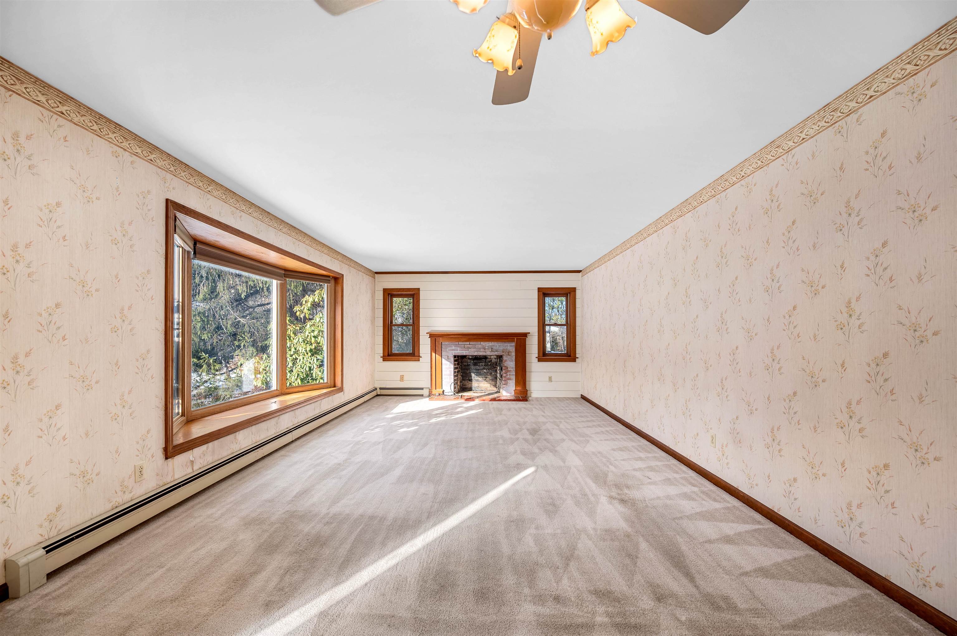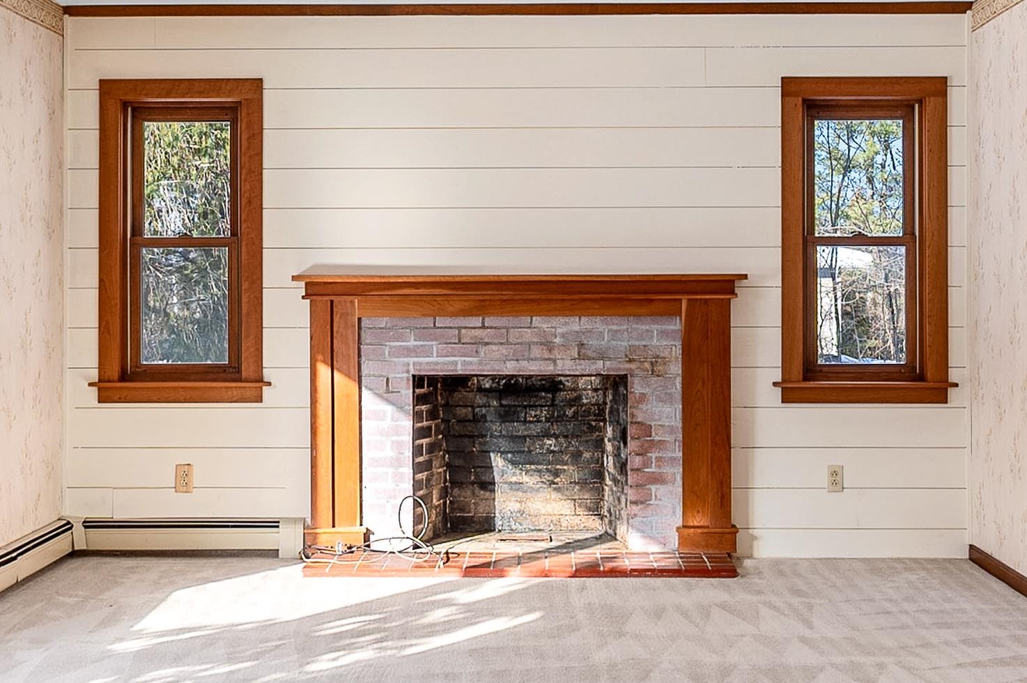 - Blinds, Ceiling Fan, Wood Fireplace, 1 Fireplace, Natural Light, Natural Woodwork
