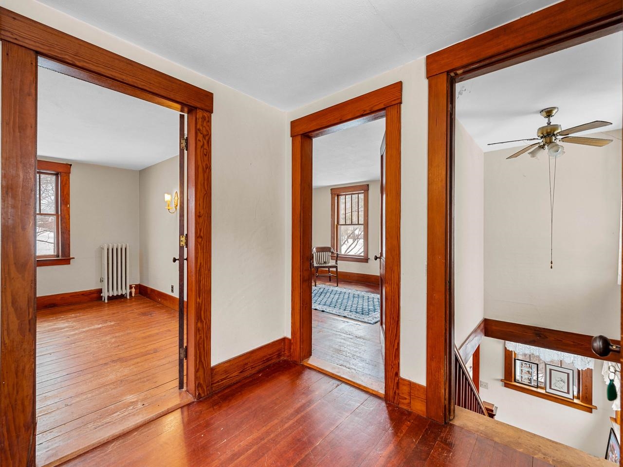 - Ceiling Fan, Dining Area, Gas Fireplace, Natural Light, Natural Woodwork
