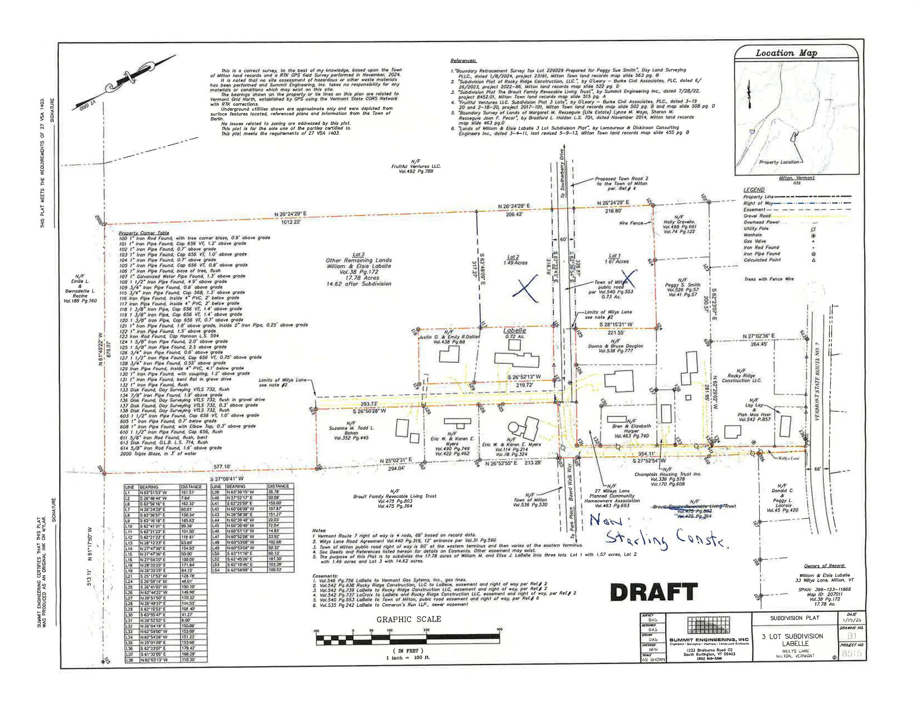 This 3.16 acres has been surveyed but not yet subdivided off of the existing 18 acres larger parcel. Eventually, the Willys Lane Extension, to be town road, will bisect the acreage into 1.49 acre and a 1.67 acre lots. The owner has gotten town of Milton Sketch Plan approval for 6 lots or 12 units with conditions. There are wetlands on the property and they have been delineated including the buffer area around them. The Willys Lane Ext. will connect to road on adjacent property south of it which connects to Rte 7. Town water and town sewer and natural gas are nearby. Contact agent for details on the timing and funding of Willys Ln Ext. that will subdivide this lot. The 6 lots that have sketch plan approval are only one idea of what could go here, so whomever purchases it can get it subdivided with different configuration. Attached to the listing are plats showing existing and future roads, adjacent new subdivisions, etc.. Seller may consider some owner financing depending on the terms.