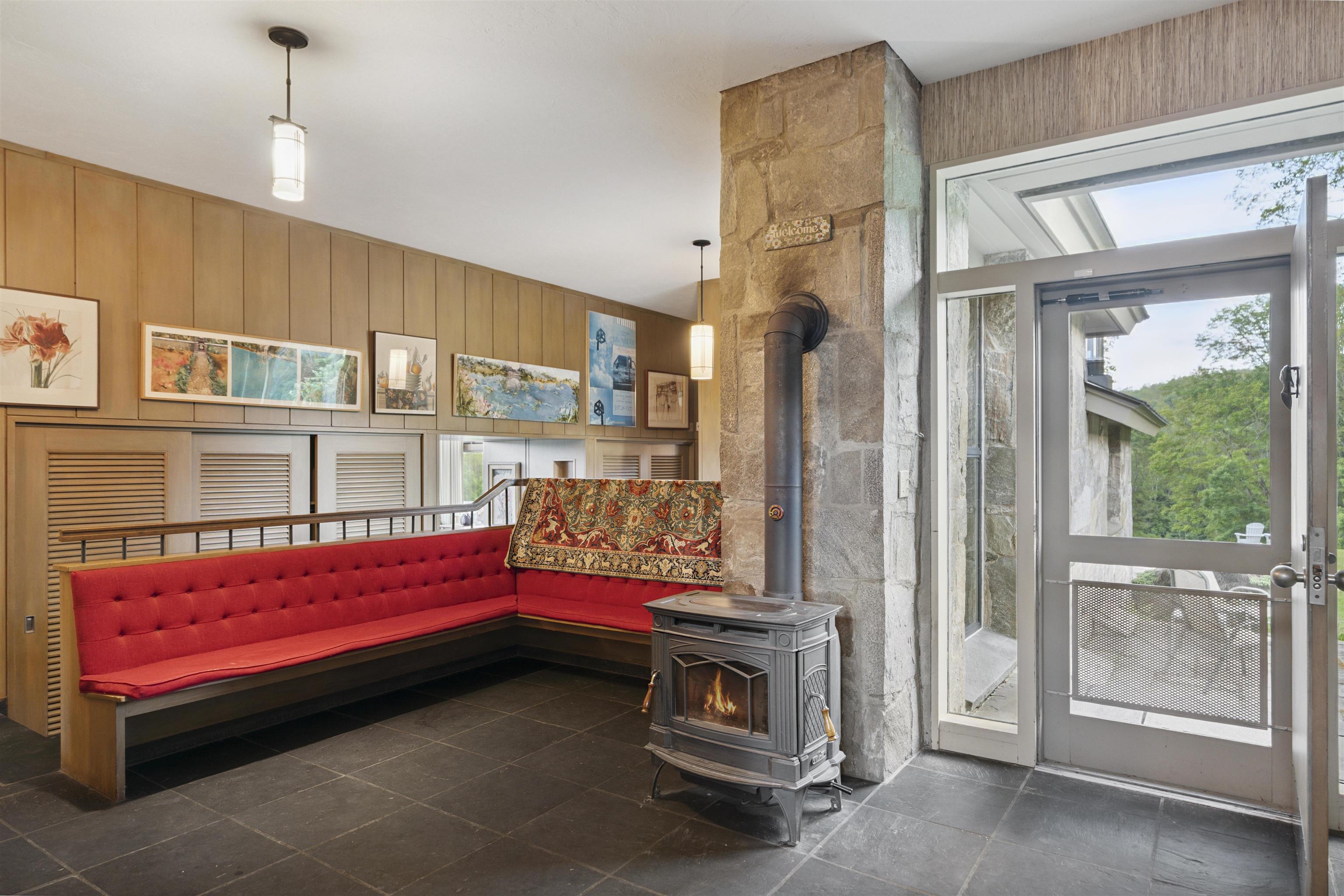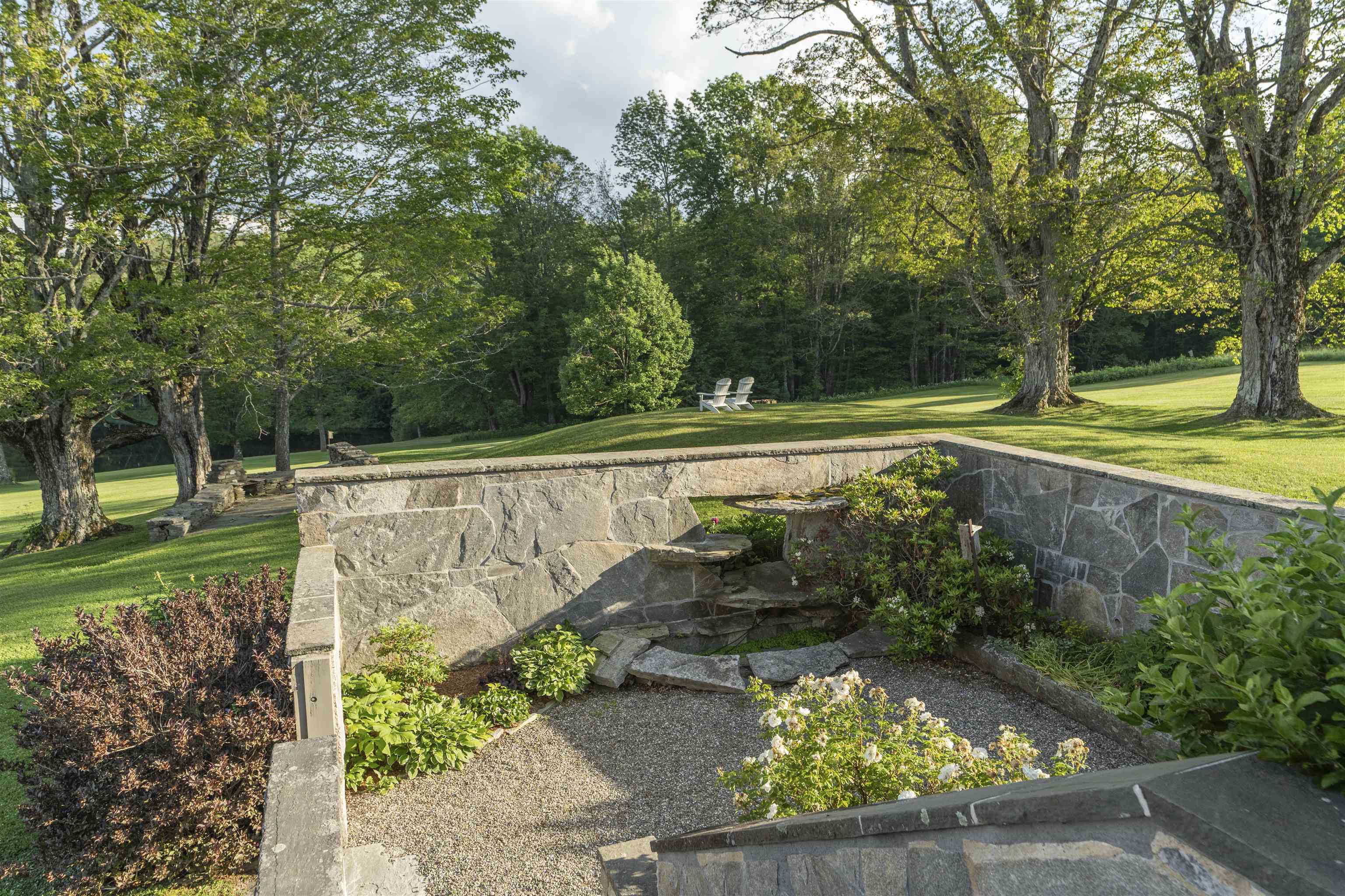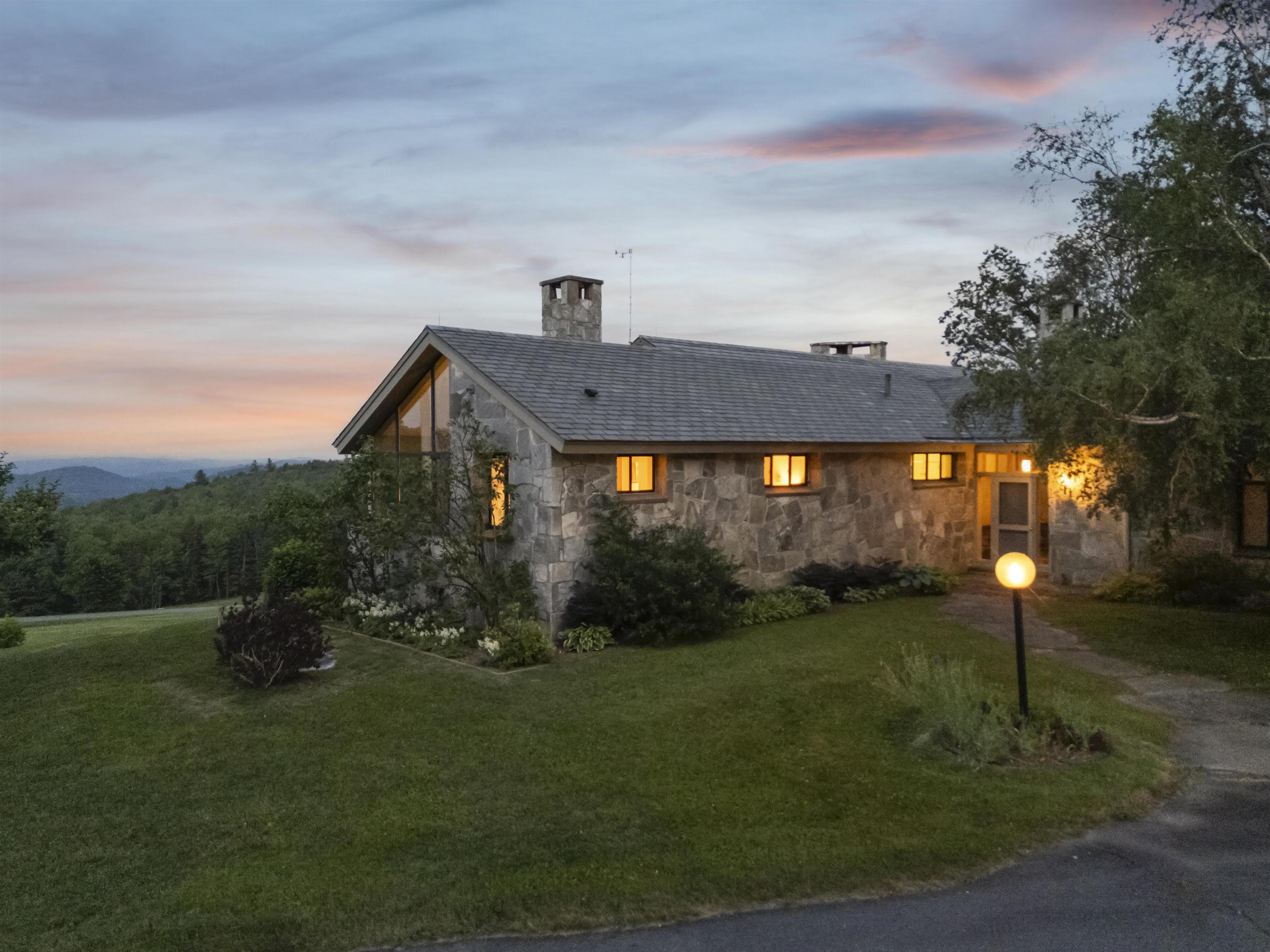Skygate Farm is a historic Vermont farmstead first settled in the 1800s, which today spans over 300 acres of meadows, forests, trails, and weathered stone walls. The setting speaks of an early farmer’s wisdom — sited along a gentle hill to shield against the northwest winds, while opening to the first light of day and the vast mountain views to the east. Found at the end of a winding gravel road, the place offers complete privacy and a deep, restorative tranquility. In a later chapter, a mid-century modern stone residence was built to frame these views and capture the natural light—conceived as a summer retreat and a winter getaway for ski outings. Families gathered here for picnics at the top of the meadow, long swims in the clear, spring-fed pond, and walks along the trails picking blackberries. Inside, a silver movie screen drops from the ceiling for evening films by the fire. Custom closets store fly rods, skis, and gear for every season. Two wood-burning fireplaces bring warmth on cooler days. The deep, detached garage offers ample space for cars, equipment and tools. For the last 25 years, this haven has been a full-time residence. Bluebird houses line the fields, perennial gardens bloom seasonally, and flocks of goldfinch move through the meadows in waves. The land also offers potential for regenerative farming with 29 acres of open meadow and mature maples for sugaring. A solar array has 48 panels. Showings begin July 10