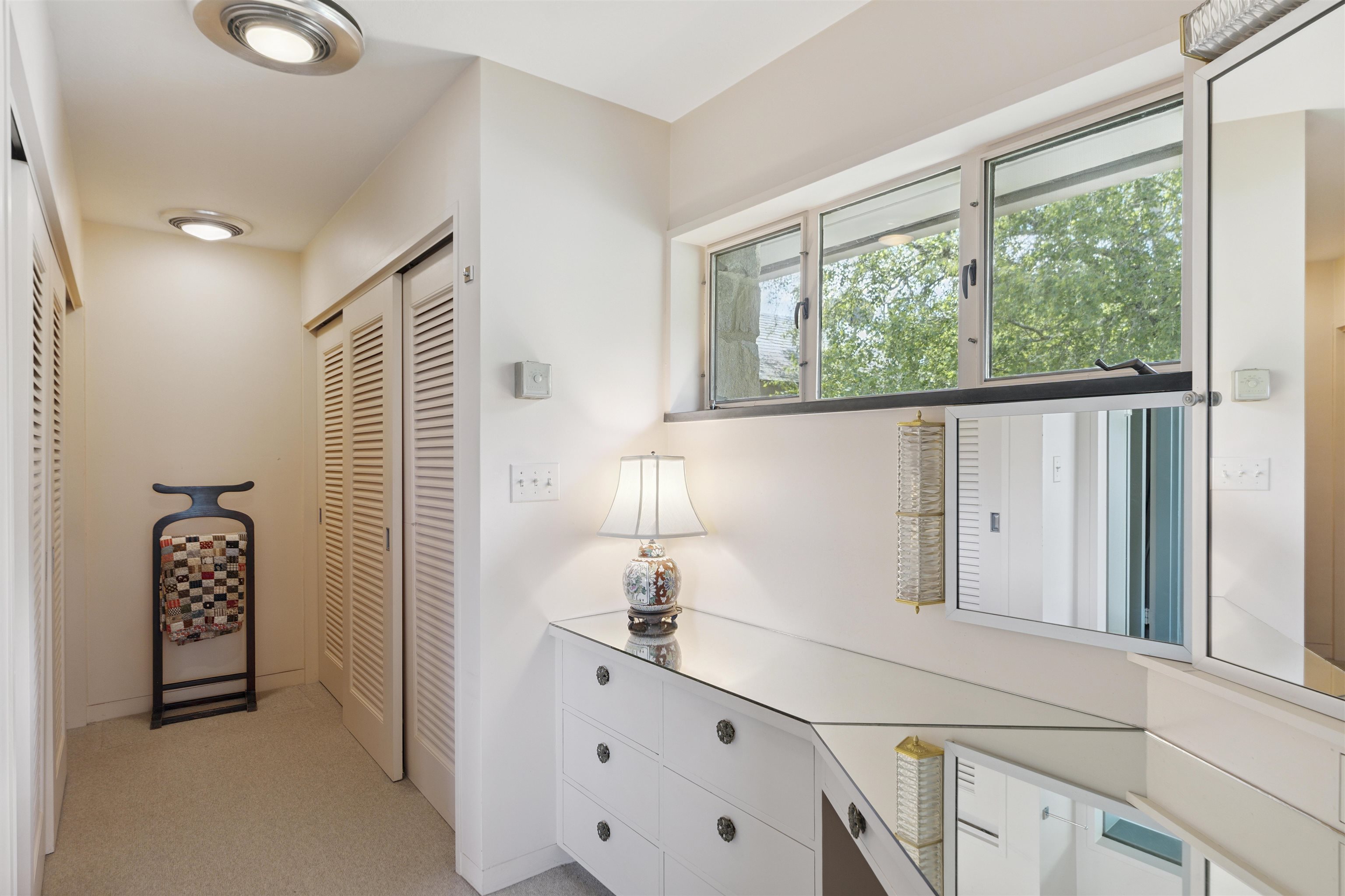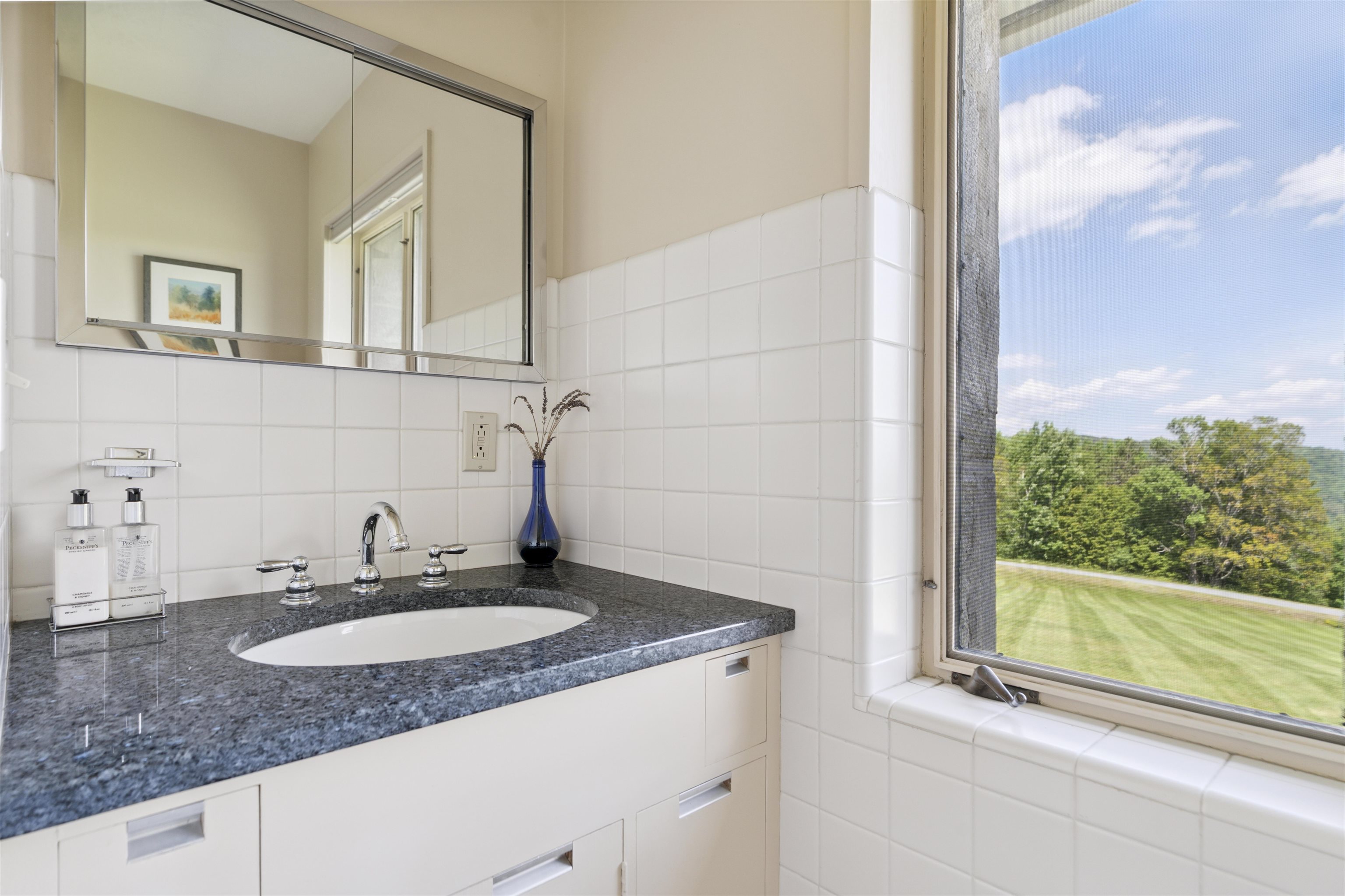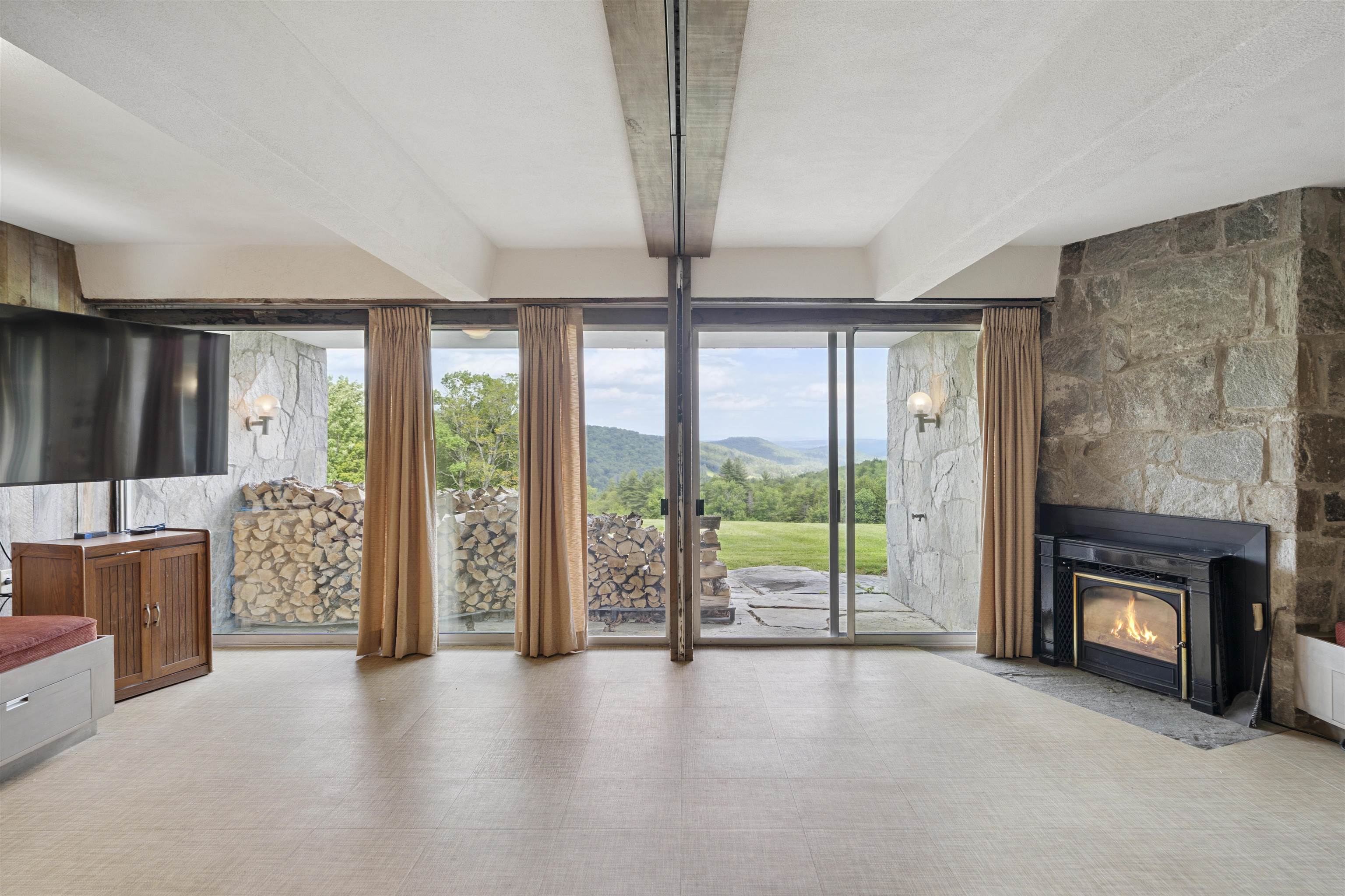 Skygate Farm is a historic Vermont farmstead first settled in the 1800s, which today spans over 300 acres of meadows, forests, trails, and weathered stone walls. The setting speaks of an early farmer’s wisdom — sited along a gentle hill to shield against the northwest winds, while opening to the first light of day and the vast mountain views to the east. Found at the end of a winding gravel road, the place offers complete privacy and a deep, restorative tranquility. In a later chapter, a mid-century modern stone residence was built to frame these views and capture the natural light—conceived as a summer retreat and a winter getaway for ski outings. Families gathered here for picnics at the top of the meadow, long swims in the clear, spring-fed pond, and walks along the trails picking blackberries. Inside, a silver movie screen drops from the ceiling for evening films by the fire. Custom closets store fly rods, skis, and gear for every season. Two wood-burning fireplaces bring warmth on cooler days. The deep, detached garage offers ample space for cars, equipment and tools. For the last 25 years, this haven has been a full-time residence. Bluebird houses line the fields, perennial gardens bloom seasonally, and flocks of goldfinch move through the meadows in waves. The land also offers potential for regenerative farming with 29 acres of open meadow and mature maples for sugaring. A solar array has 48 panels. Showings begin July 10