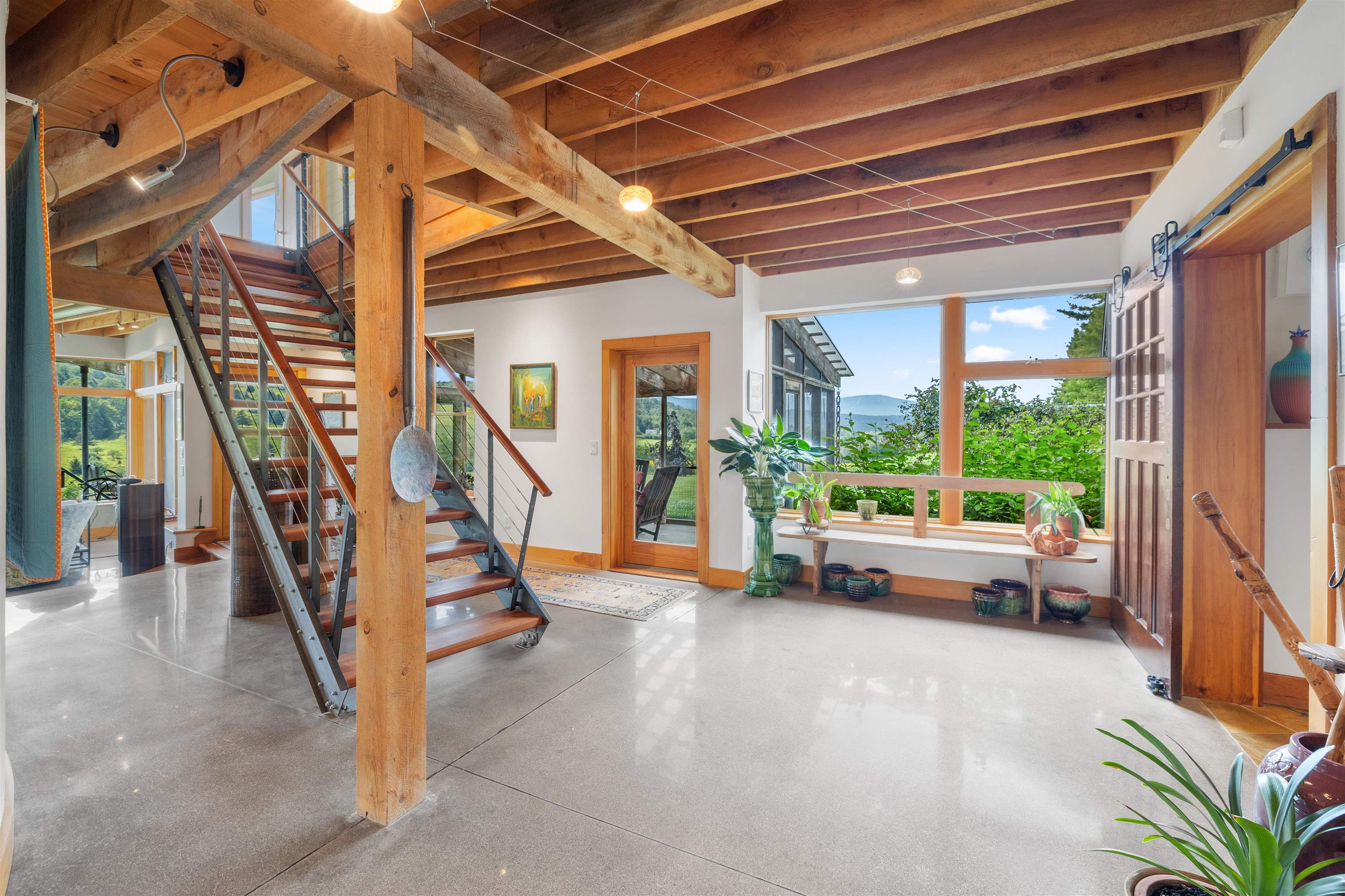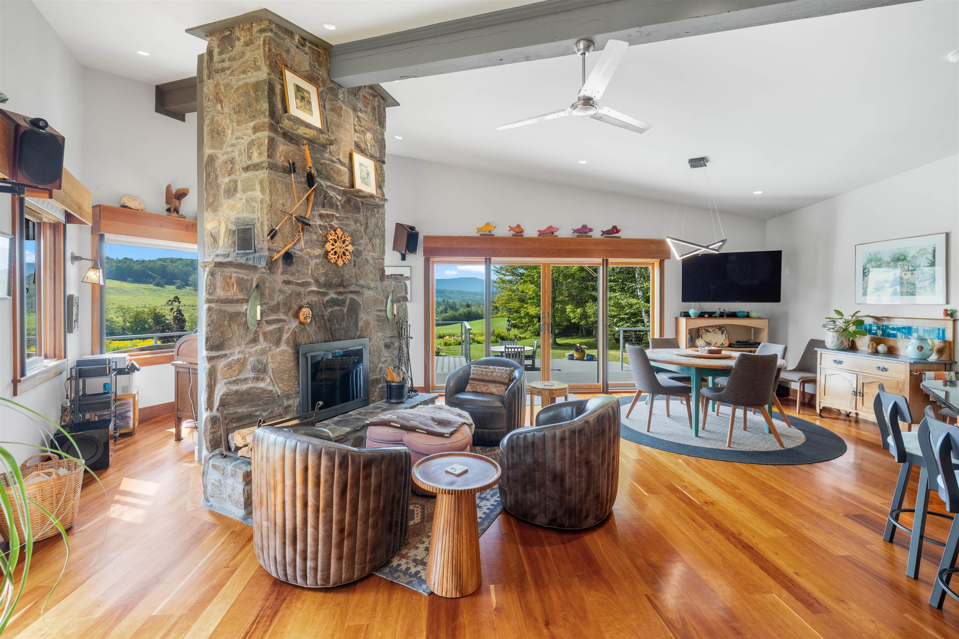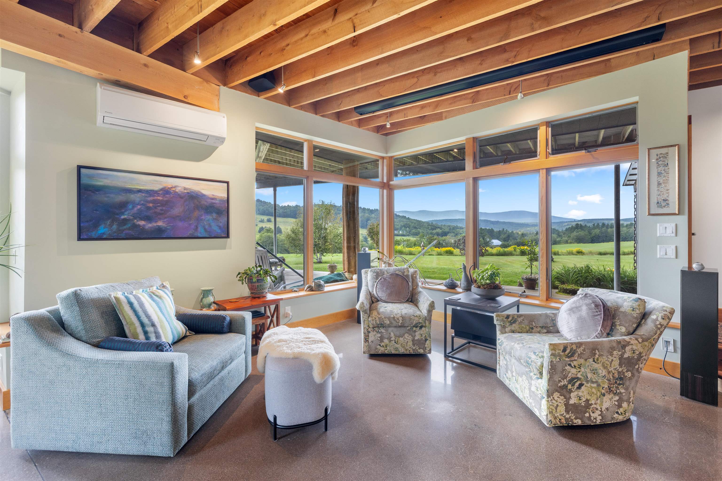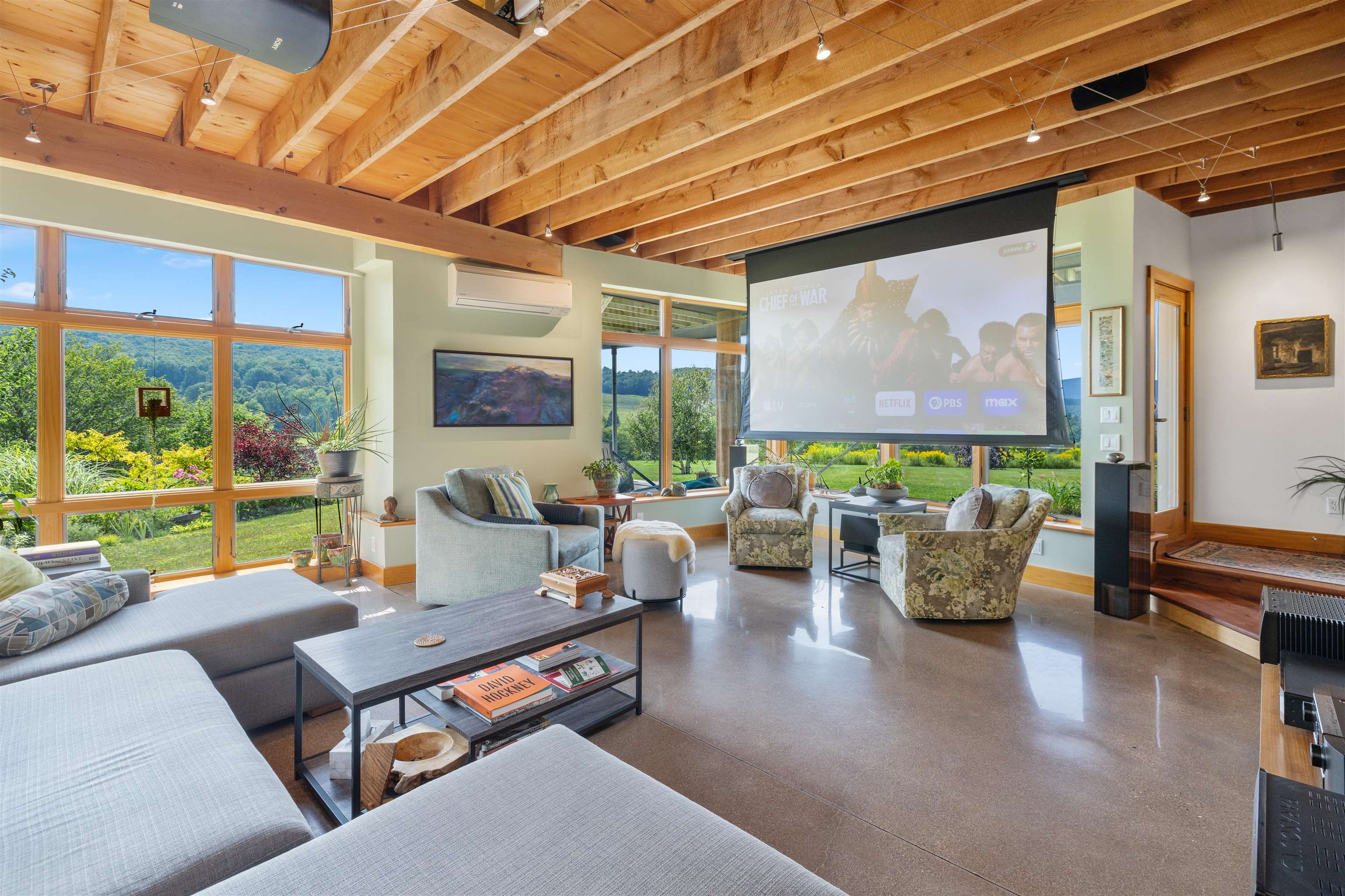Private Vermont Sanctuary with Spectacular Mountain Views. Tucked away on a quiet dead-end road, yet just minutes to Hermitage Club, Mount Snow and downtown Wilmington. Every room offers a view. Direct snowmobile access and walking trails! Set on 20 private acres in the heart of Vermont’s Green Mountains, the property features panoramic views of Haystack, Mount Snow, and the spine of the southern Green Mountains. With over 4, 200 square feet of thoughtfully designed living space, the interior boasts clean lines, a Primary suite with walk-in closet and spa-like bath. Floating staircase, a large foyer, and a screened-in porch for enjoying warm evenings. Vaulted ceilings, radiant heat throughout, and walls of windows frame the stunning mountain and valley vistas. Open-concept kitchen and dining area with granite countertops, custom cherry cabinets and flooring, large center island, and a massive stone fireplace. Direct access to multi-level decks. Spacious living room with exposed beams and a cozy sitting area with a Projection System and a Custom high-end audiophile Sound system. Oversized heated 3-car garage. Enjoy outdoor living at its best with beautifully maintained flower gardens, open fields, a mature mixed forest, a patio, a hot tub, an outdoor shower, and creek frontage.