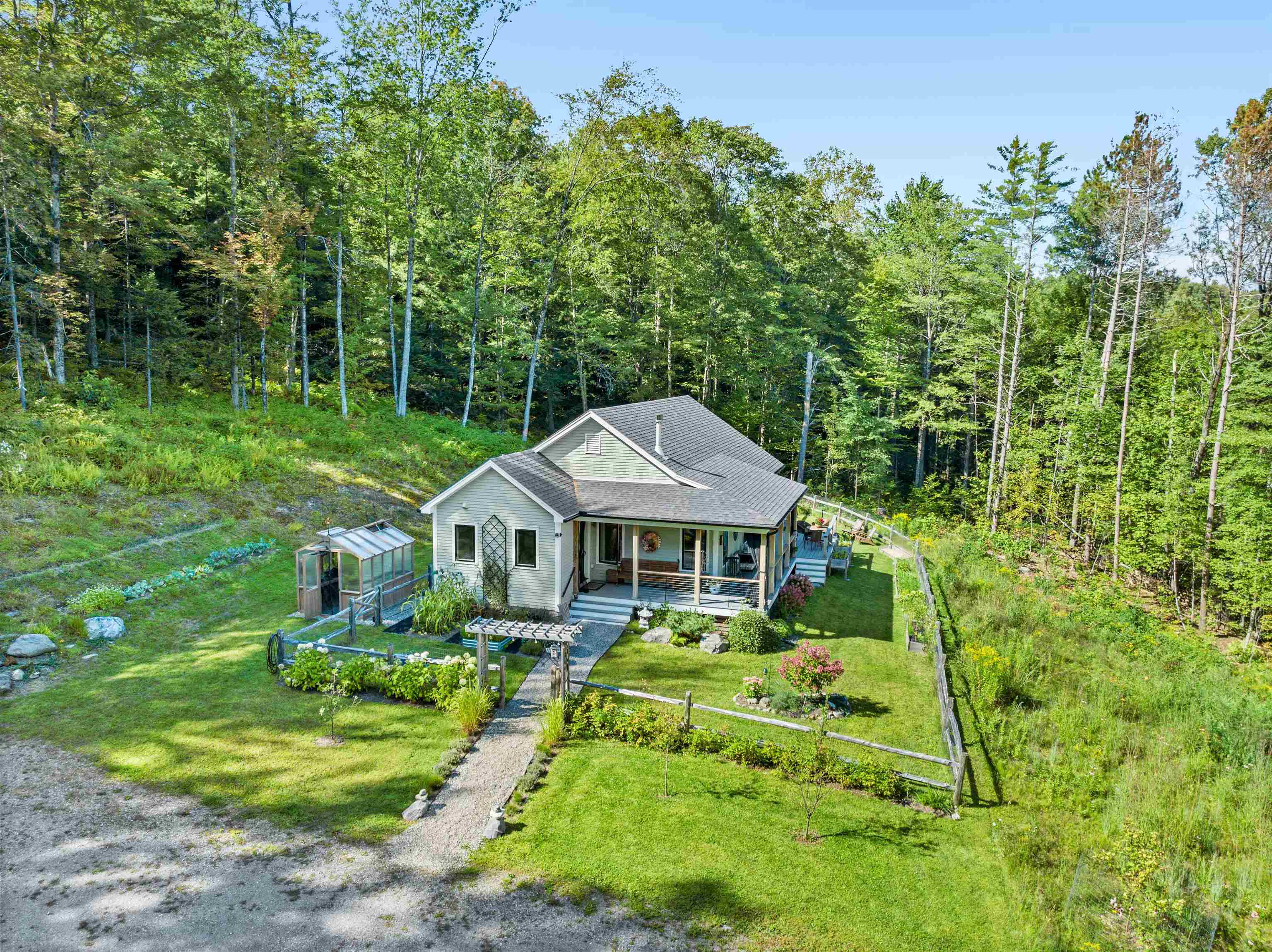 A Perfect Vermont Homestead – Thoughtfully designed and recently constructed, this charming residence offers the perfect balance of comfort, craftsmanship, and country living. Every detail has been carefully considered, from the flourishing flower and produce gardens to the handsome post-and-beam garage. The solidly built home features two-plus bedrooms and provides a sense of privacy while remaining just minutes from community services and conveniences. Move-in ready, the property includes quality appliances and superior construction throughout. Lifestyle amenities abound: cultivate your own food in the whole-earth gardens, tend to a chicken coop built for a prize-winning flock, relax around the fire pit, or enjoy year-round growing in the greenhouse. A welcoming porch, complete with a transparent mosquito net, invites you to unwind outdoors in comfort. Truly a pleasure to view and own, this property embodies the Vermont homestead dream. Don’t miss the opportunity—schedule your private tour today.