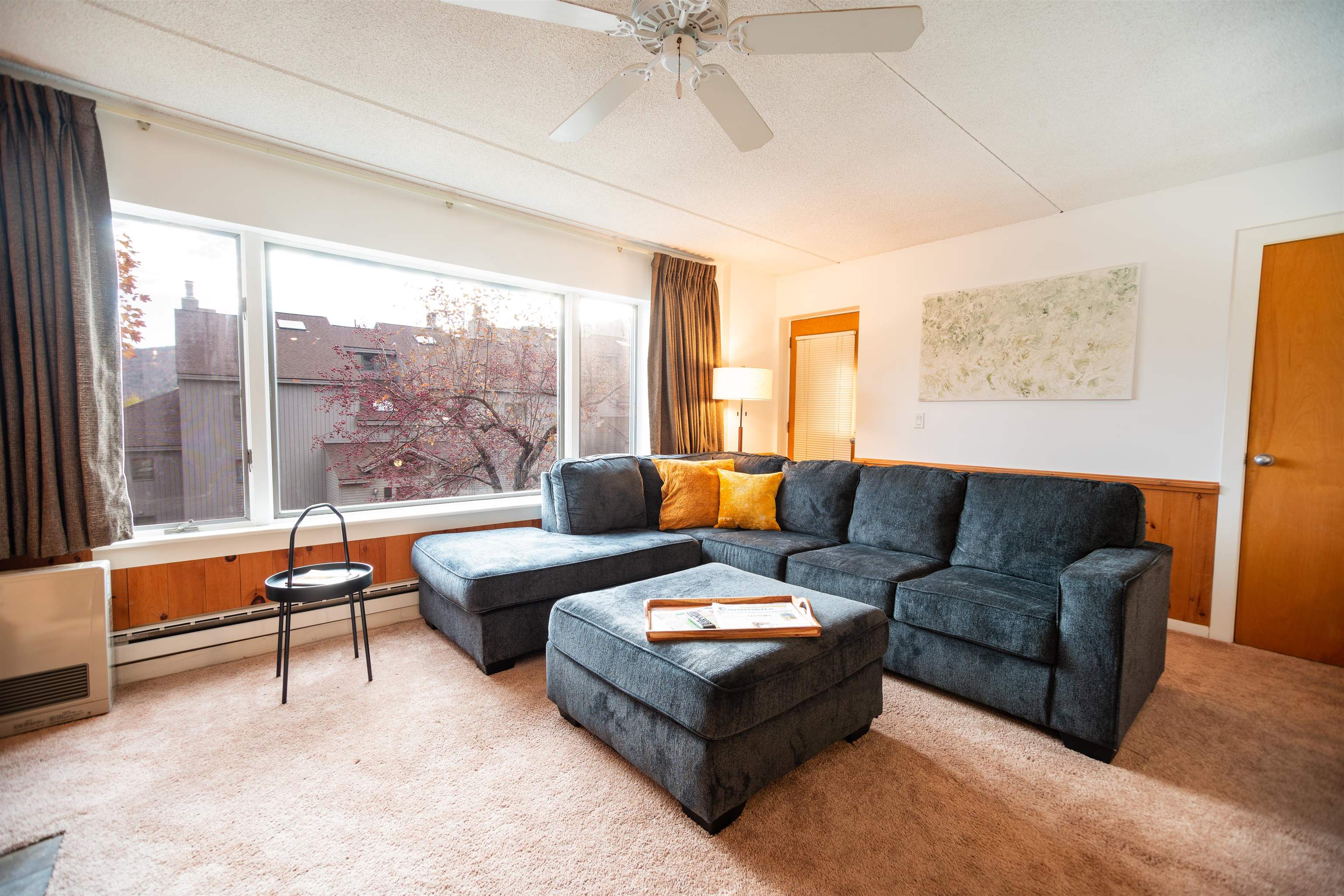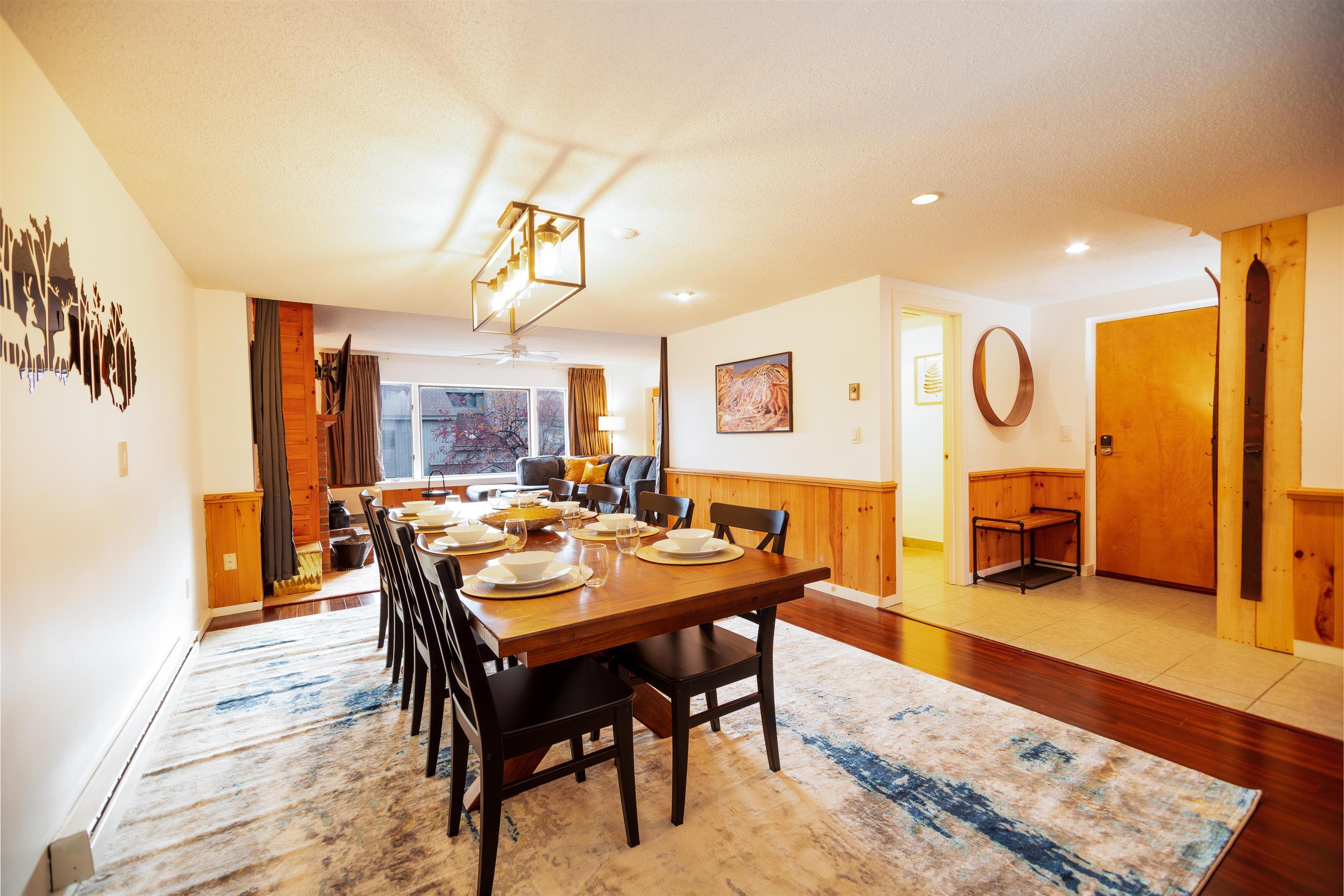 This unique two-level condo has been tastefully updated, featuring a 2-bedroom, 2.5-bath condo in the desirable Snow Tree community, which offers the perfect blend of comfort, style, and convenience—just moments from the slopes of Mount Snow! Step inside the entry level and enjoy an open-concept floor plan ideal for entertaining or relaxing after a day on the mountain. The renovated kitchen features modern finishes and flows seamlessly into the dining area with gleaming hardwood floors. Cozy up by the wood-burning fireplace in the spacious living room, or step out onto your private deck to take in serene mountain views. A convenient half bath and efficient Rinnai heater complete the main level. Upstairs, the primary suite impresses with two oversized walk-in closets and an ensuite bath with a luxurious jetted tub. Wake up to breathtaking mountain vistas right from your bedroom and private upper-level deck! A second bedroom and a full bath offer even more space and flexibility. There's also a second private entrance on this level for added convenience. Snow Tree owners enjoy private storage lockers and access to a well-appointed sports center with an oversized hot tub, exercise room, and an outdoor heated pool. Plus, the MOOVER shuttle stops right at your door, providing quick and easy access to Mount Snow!