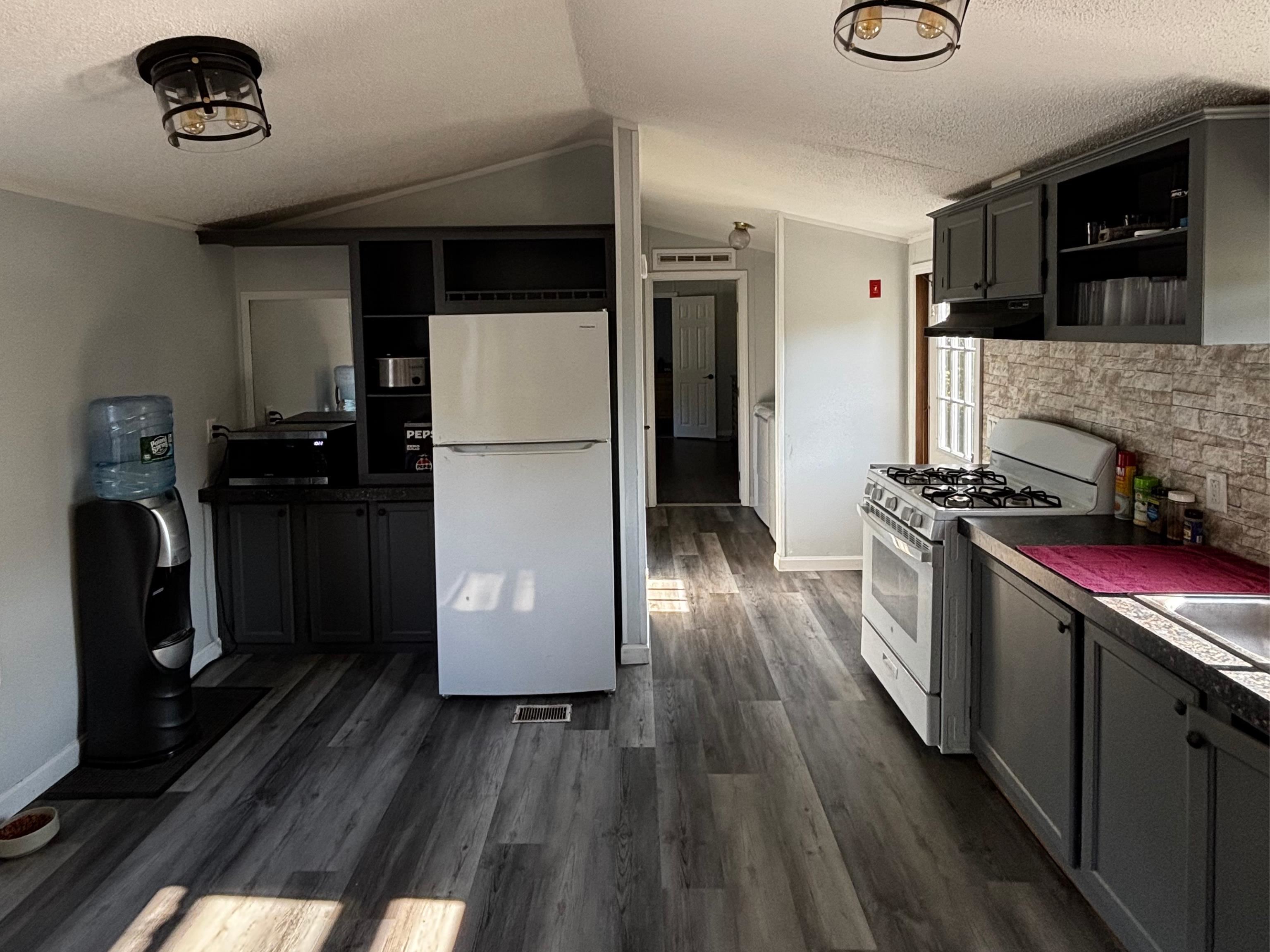 Bright, refreshed, and move-in ready—this updated 2-bedroom, 2-bath manufactured home in Barre Town offers easy living in a peaceful park setting. With recent upgrades including new skirting, vinyl flooring, lighting, and paint throughout, plus rebuilt front and back decks, this home is truly turnkey. Step inside to a light-filled interior with lots of windows and skylights that bathe the home in natural sunlight all day. The open-concept layout features a spacious living room and an updated kitchen with painted cabinets, stone-look backsplash, gas range, and ample prep space. The split-bedroom design provides privacy, with the primary suite offering a full ensuite bath and generous closet space, while the second bedroom and full bath sit at the opposite end of the home. Enjoy outdoor living from the elevated back deck—ideal for relaxing with views and vibrant foliage in the distance. A detached garage adds bonus storage or workshop potential, and a yard provides extra space to spread out. Tucked just outside East Barre and close to the Millstone Trails and historic granite quarries, this home offers modern comforts with access to nature and local amenities.