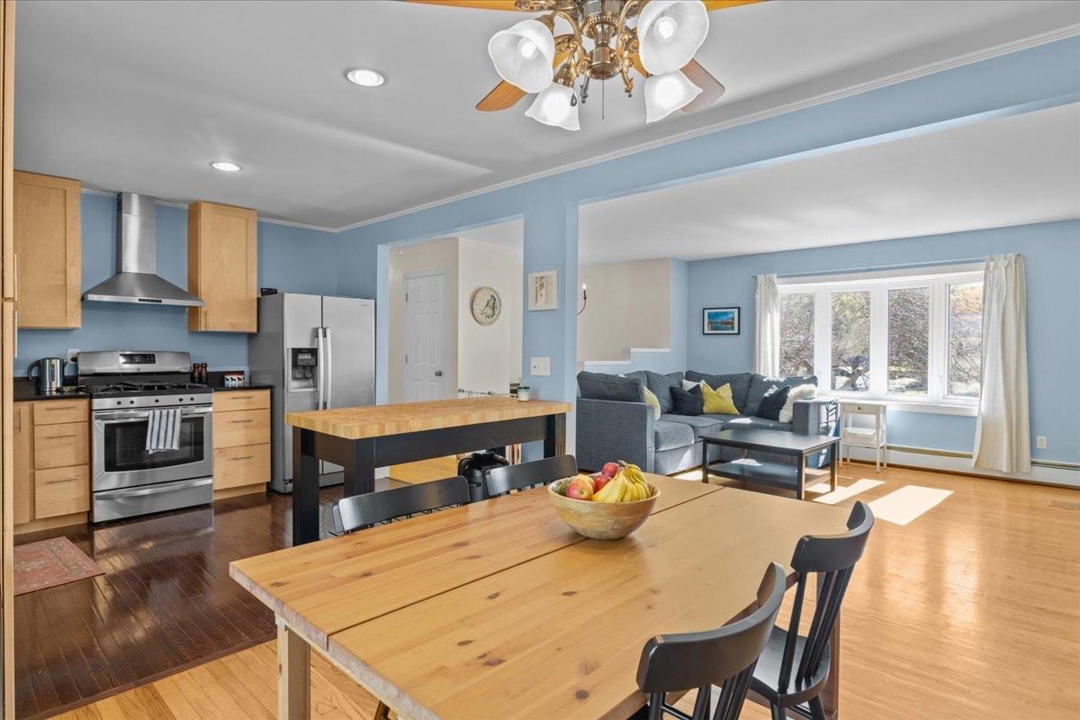 - Ceiling Fan, Dining Area, Kitchen/Dining, Living/Dining, Natural Light, Wood Stove Insert, Attic with Pulldown