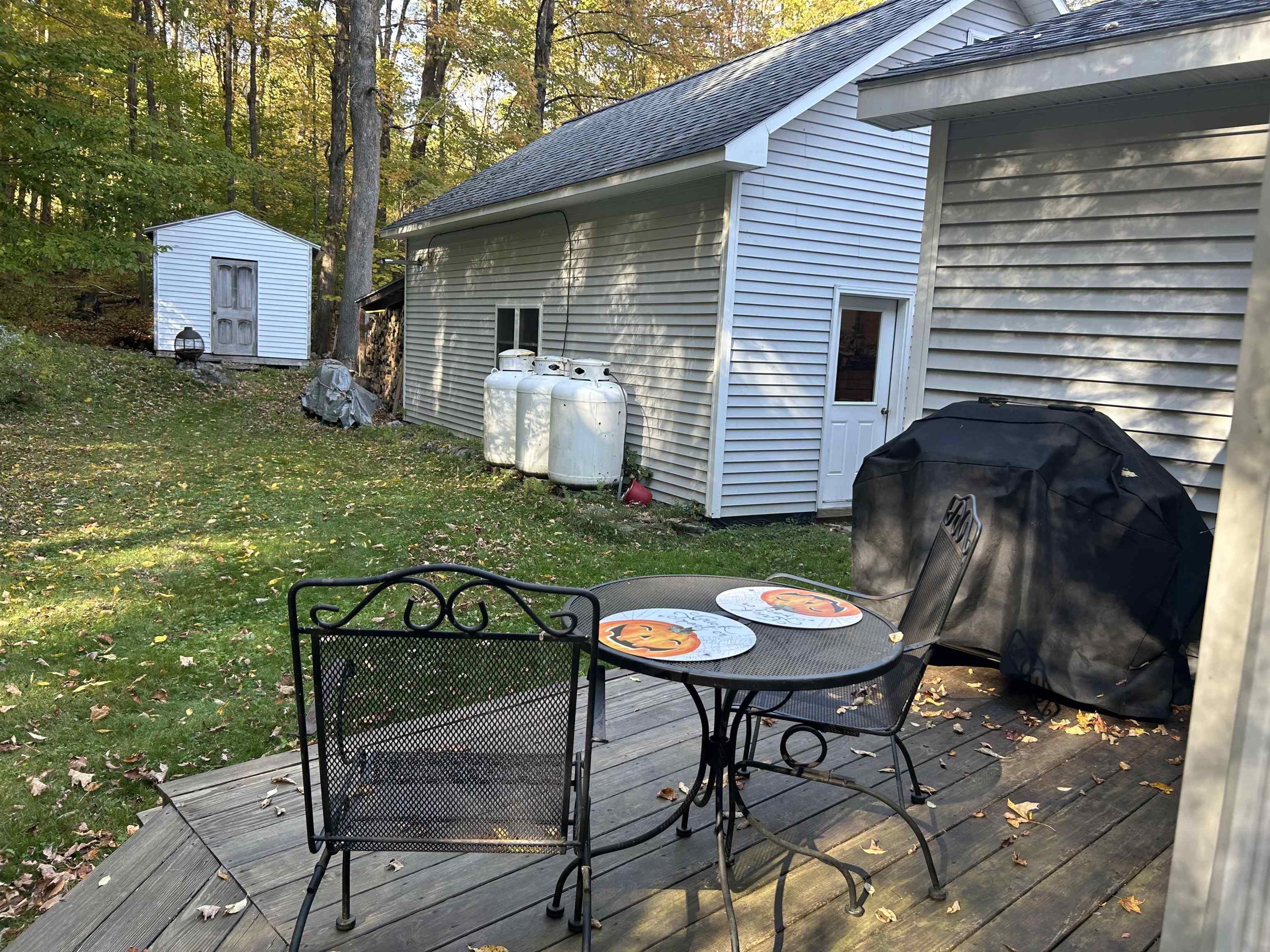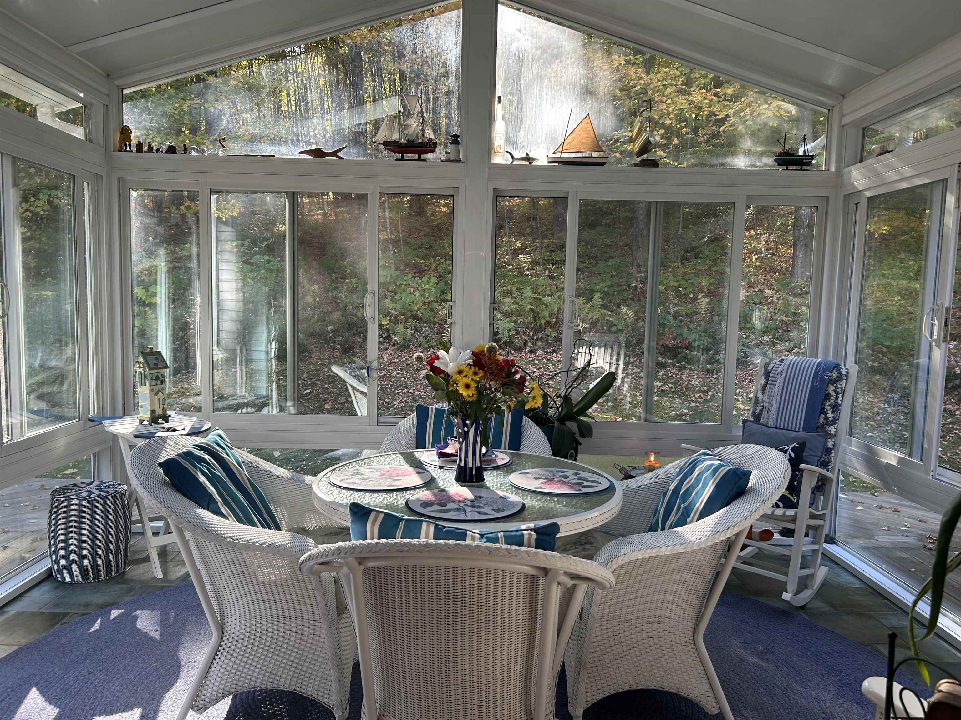 Conveniently located on a private 5-acre lot with Maple trees, lot near school, shopping and all conveniences. Versatile one level living this home has been used as a 3 bedroom, with first floor living room with fireplace, beautiful Sunroom overlooks private back yard, nice family room and 2 other rooms in basement. Eat in kitchen comes with appliances. Comfy covered front porch for relaxing...and enjoying the natural surroundings. Great yard space for kids or grownups to play, complete with a Basketball hoop and concreate pad. Meander on a walk or snowshoe on the trails in the woods. Enjoy watching for wildlife while relaxing in the back Sunroom. Finished 2 car garage with storage above. Showings delayed until 10/5/25. Open House Sunday, October 5th from 1PM-3PM. Come see this lovely home with 5 Acres of Privacy.