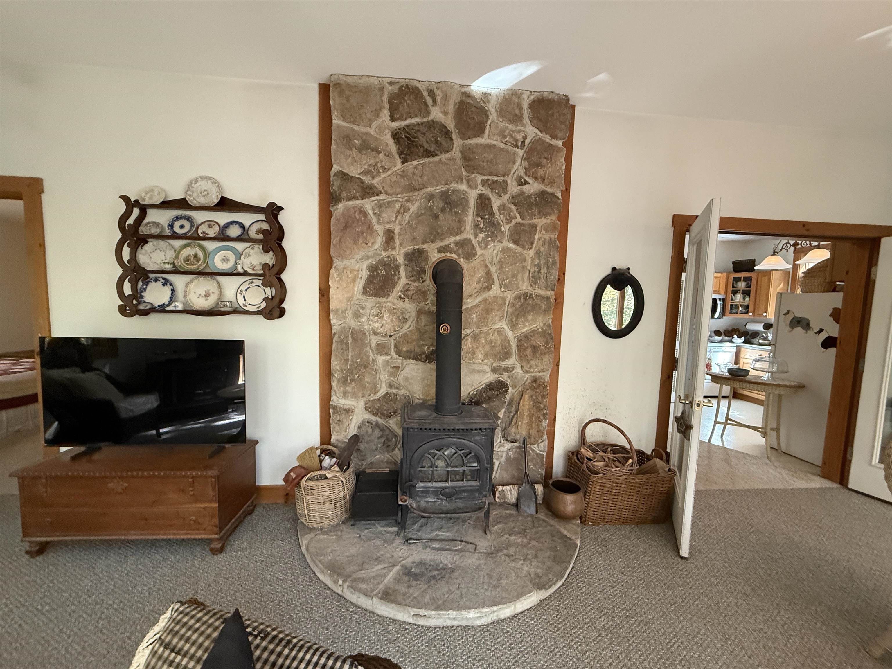 Sage Hill offers the perfect blend of privacy and convenience, set along a scenic country road yet just minutes to groceries, gas, and skiing. This contemporary home is thoughtfully tucked back into the landscape, framed by classic stonewalls and majestic oak trees. Enter directly from the carport into a tiled mudroom with closet space, ideal for storing all your outdoor gear. The main living area features a soaring vaulted ceiling anchored by a striking fieldstone wood-burning fireplace, a cozy galley kitchen, and a spacious sunroom with its own woodstove to keep you warm on cool evenings. The home offers two en-suite bedrooms, each with a ¾ bath, plus an open loft overlooking the living room that includes built-in storage. The full walk-out basement provides excellent potential for future expansion, imagine, a family room or media space with the option to add another bathroom. Additional highlights include a woodstove connection in the basement, backyard space and a huge deck for outdoor entertaining. Sage Hill is an inviting Vermont escape with room to make it your own, all while staying close to the region’s best skiing.