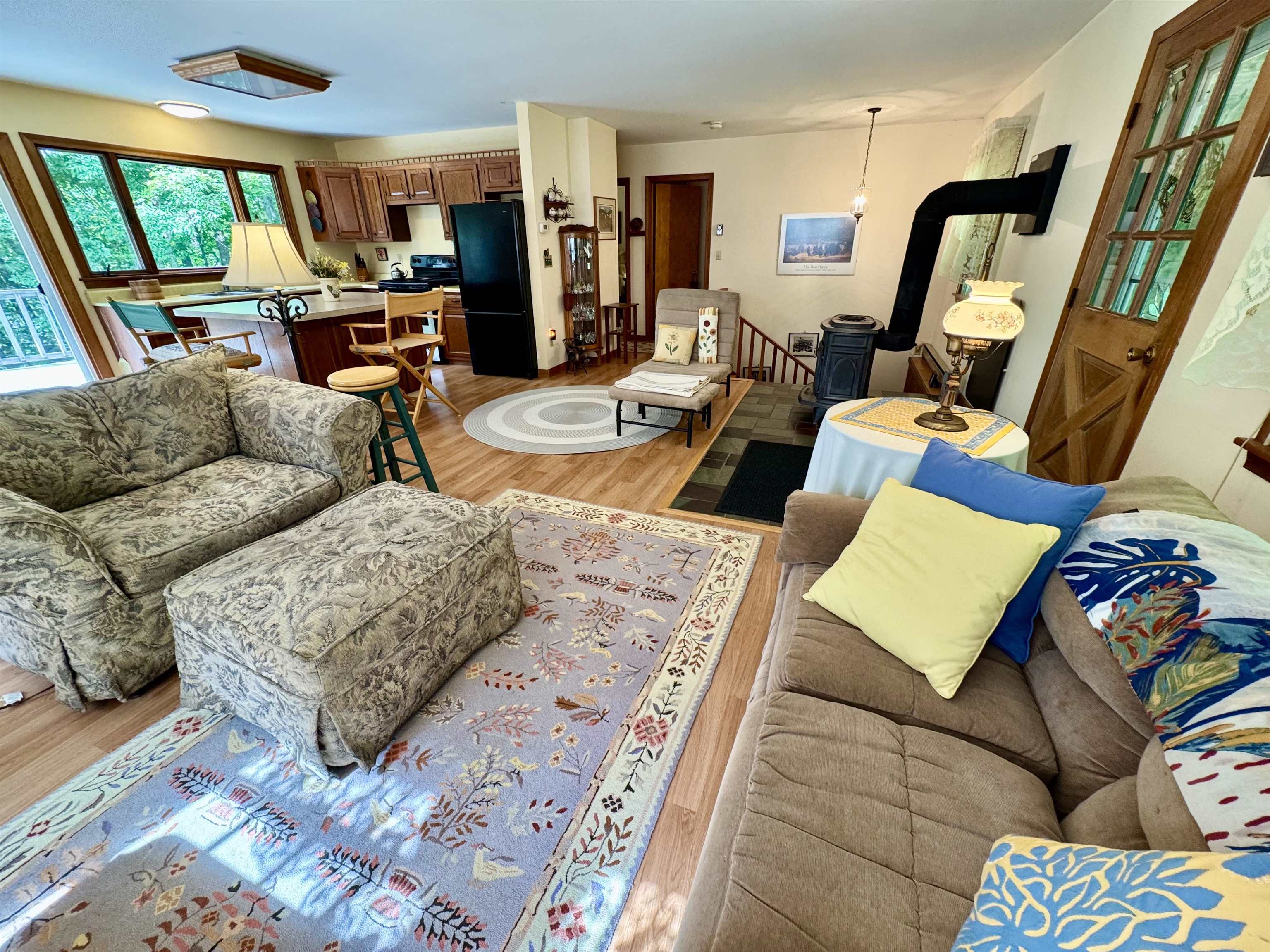 Welcome Home! This beautifully maintained property is ready for its next chapter. The open floor plan is filled with natural light, creating a warm and inviting atmosphere throughout. Enjoy summer evenings on the spacious deck with built-in seating, and cozy up by the wood stove when winter arrives. The home offers a generous unfinished walkout basement—perfect for a future recreation room, home office, or studio—along with a one-car garage featuring a workbench and extra storage space. Outdoors, the landscaped grounds and gardens have been lovingly cared for, offering both beauty and tranquility. This move-in ready home is the perfect blend of comfort, functionality, and potential. Don’t miss your chance to make it yours! Sale is subject to finding suitable replacement housing, which has been identified. Lease to be signed ASAP.