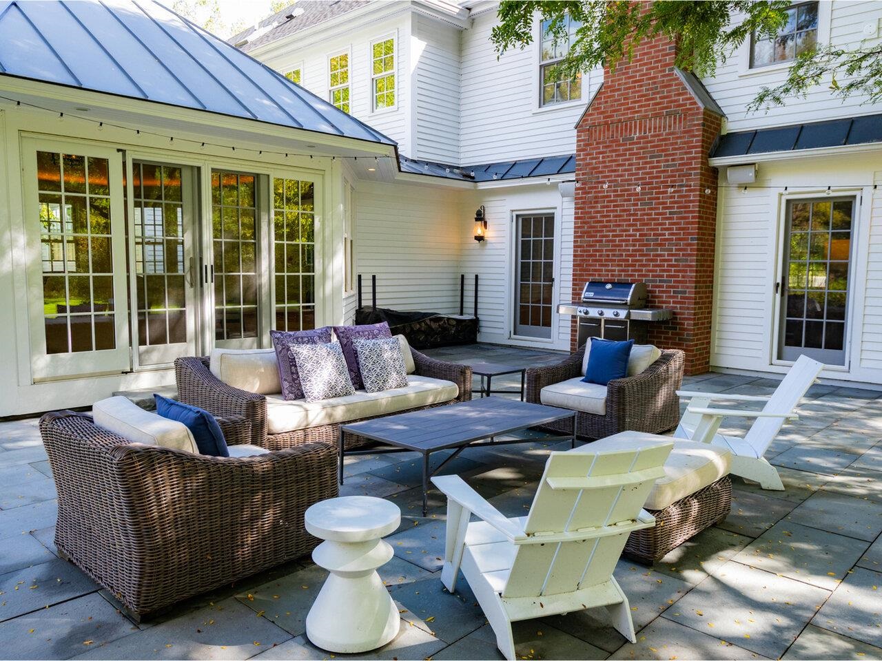 Step inside this timeless 6, 000+ SF home where classic New England architecture meets modern comfort. With 5 bedrooms and 5+ baths, the layout offers both elegant gathering spaces and private retreats. The grand foyer with slate floors and sunlight-filled staircase opens to a cozy den, paneled office, and a chef’s kitchen with oversized island, Wolf range, and seamless flow into the dining area, living room with fireplace, and spectacular octagon sunroom wrapped in windows. Upstairs, a serene primary suite offers dual walk-in closets and a spa-worthy bath with double vanity, soaking tub, and glass shower. A guest suite includes a private ¾ bath, while two additional bedrooms share a remodeled bath with steam shower and thoughtful finishes. A first-floor hallway, lined with windows, connects to a laundry room and dual workstations. Two mudrooms and a private apartment above the garage add versatility, complete with its own kitchen, living space, bath, and back entrance. Set on 4.2 landscaped acres with bluestone patio, heated pool, covered porch, and pond, this home offers a rare blend of refinement and livability in a truly exceptional setting.