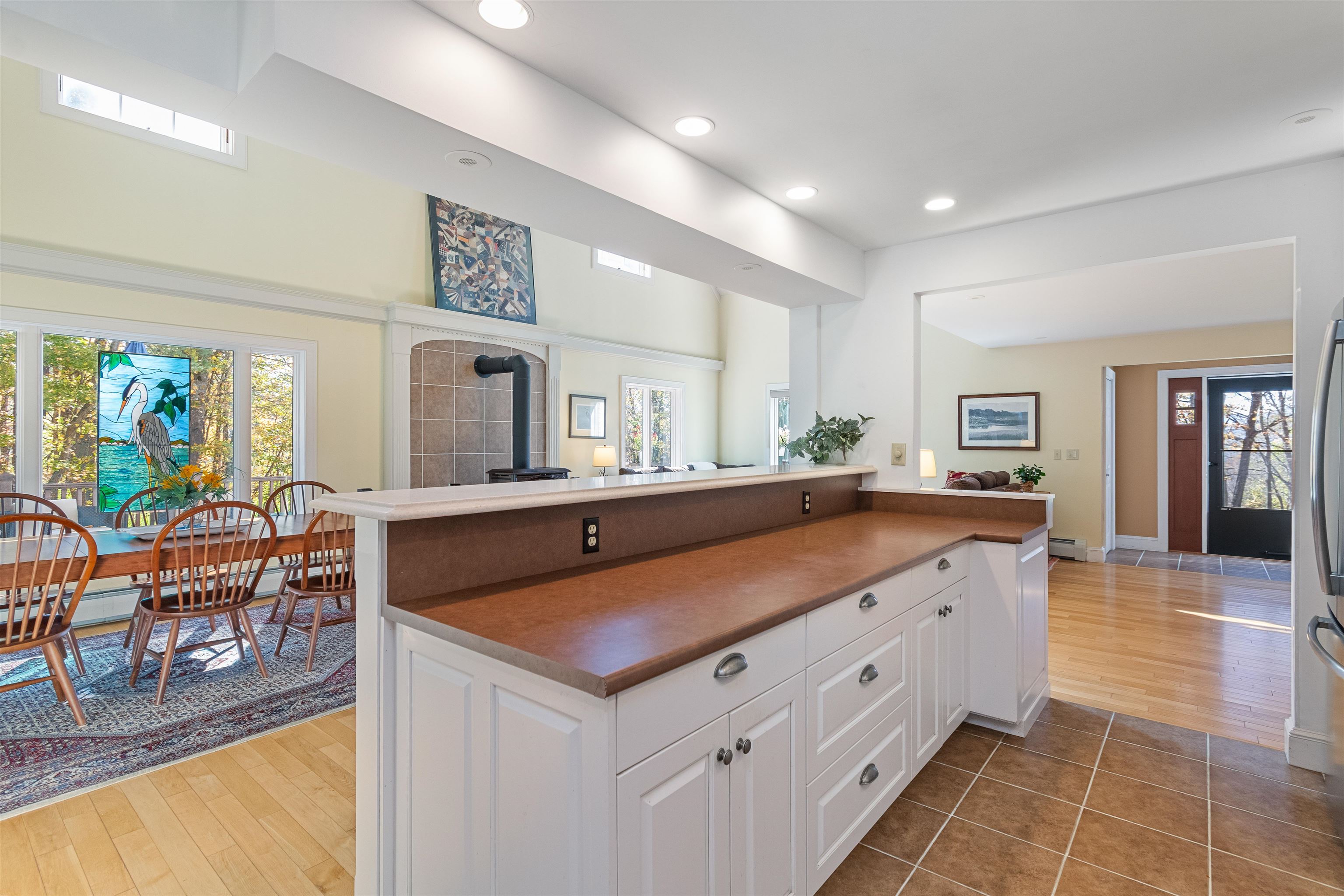 Nestled on 5.6 acres, this inviting home offers the perfect blend of country charm & modern comfort in a stunning Vermont setting! With partial mountain views in summer and full, sweeping views in winter, you'll enjoy year-round natural beauty. A welcoming entryway greets you with double closets for ample storage. The open-concept main living area features soaring cathedral ceilings and large windows that fill the space with light. A cozy propane stove with a stylish tile surround anchors the great room, subtly dividing the spacious living and dining areas while creating a perfect spot to gather. The kitchen is a standout with white cabinetry, stainless steel appliances, tile backsplash and a peninsula with bar-height seating for five. A sliding door in the dining room opens to the expansive wrap-around deck—ideal for outdoor dining, entertaining, or simply taking in the peaceful surroundings. Two bedrooms, a ¾ bath & convenient laundry room complete the main level. Upstairs, the large primary suite offers a quiet retreat with a deep walk-in closet and en suite bathroom featuring an air-jetted soaking tub. The second floor also includes two open flex spaces overlooking the main living area below. Outside, enjoy a thoughtfully landscaped yard with mature trees, stonework accents, trails through the woods and plenty of space for gardens. The deck wraps around two sides of the home, offering multiple vantage points to enjoy the tranquil surroundings and stunning views!