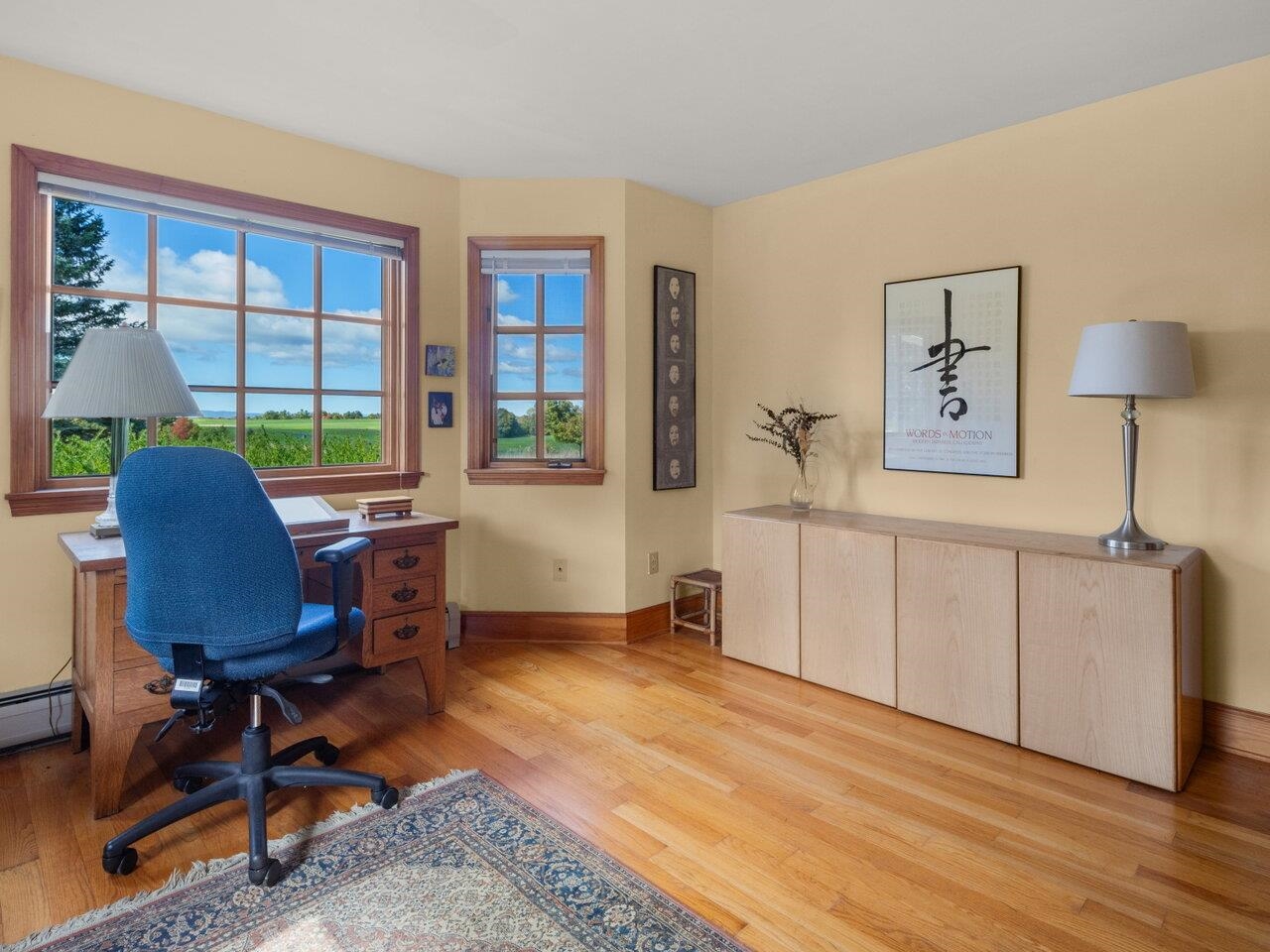The perfect place to call home! Located in scenic Shelburne, VT, this beautiful contemporary cape is set on 4.5 private acres with surrounding mountain views! The 4-bed, 4-bath home features a casual kitchen/dining area with a warm wood stove and access to a large deck overlooking the manicured lawn and easterly Green Mountain views. Adjacent to the kitchen is a formal dining room with a stunning bow window, hardwood floors, and a convenient pass-through window for effortless entertaining. Just down a short hall is the 1st-floor bedroom with an updated en suite bath and a separate west-facing den/office. The living room, with hardwood floors, wood-burning fireplace, and bay window offers views of the Adirondack Mountains. The 2nd floor features two large bedrooms with multiple deep walk-in closets, a shared full bath, and an enormous bonus room with fir floors, vaulted ceilings, and skylights. The fully insulated basement is paneled with real plywood and has an acoustic ceiling. Add some designer floor coverings and you have one hip rec-room to enjoy! In addition, a built-in basement greenhouse off the home's south side is perfect for starting spring annuals. This solidly-built home, sited at the highest point of the lot, takes full advantage of the Green Mountain views to the east and the Adirondacks to the west! Shelburne Village, area bike paths, hiking trails, parks, and golf courses are nearby too. This tranquil homesite is so inviting, you'll never want to leave!