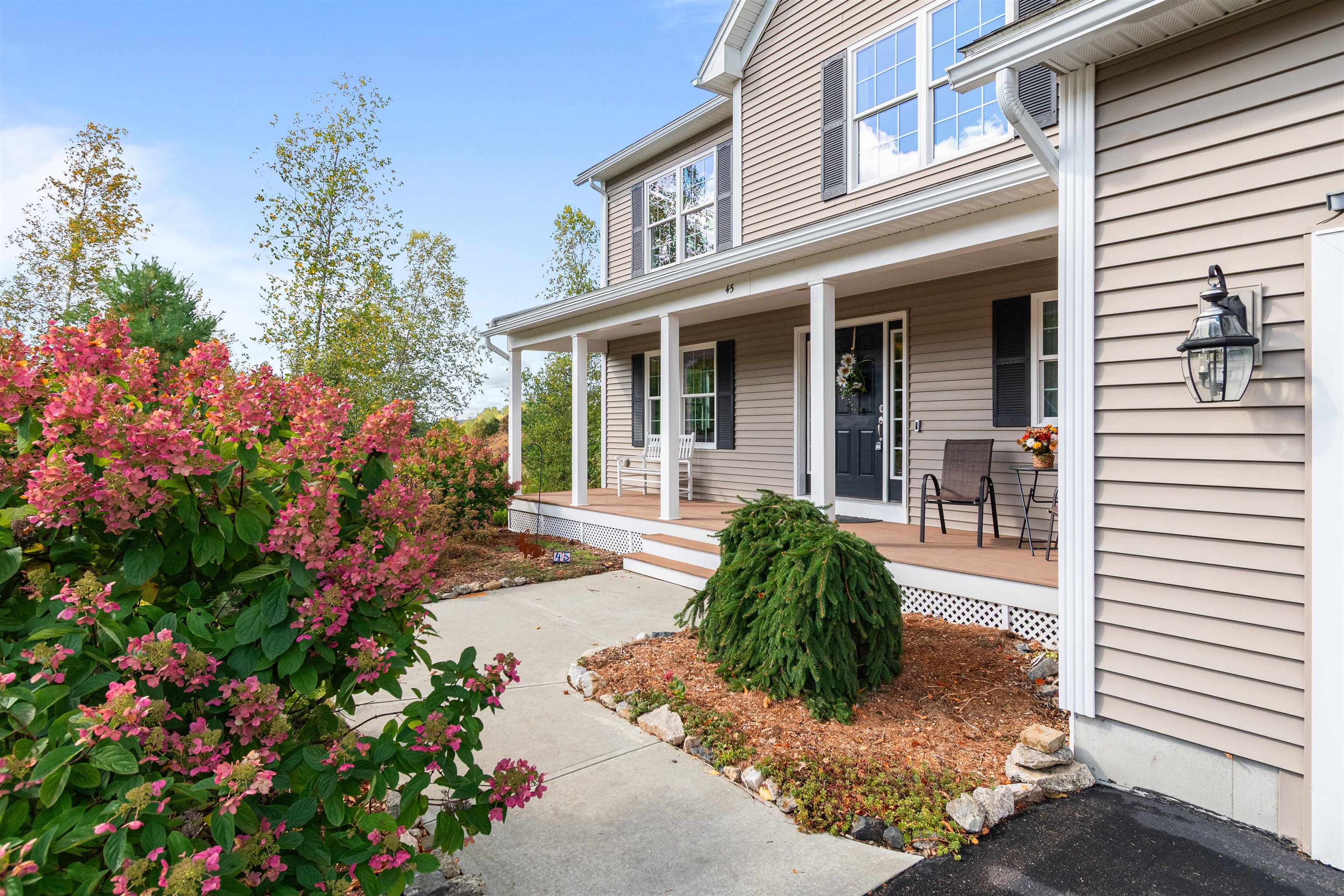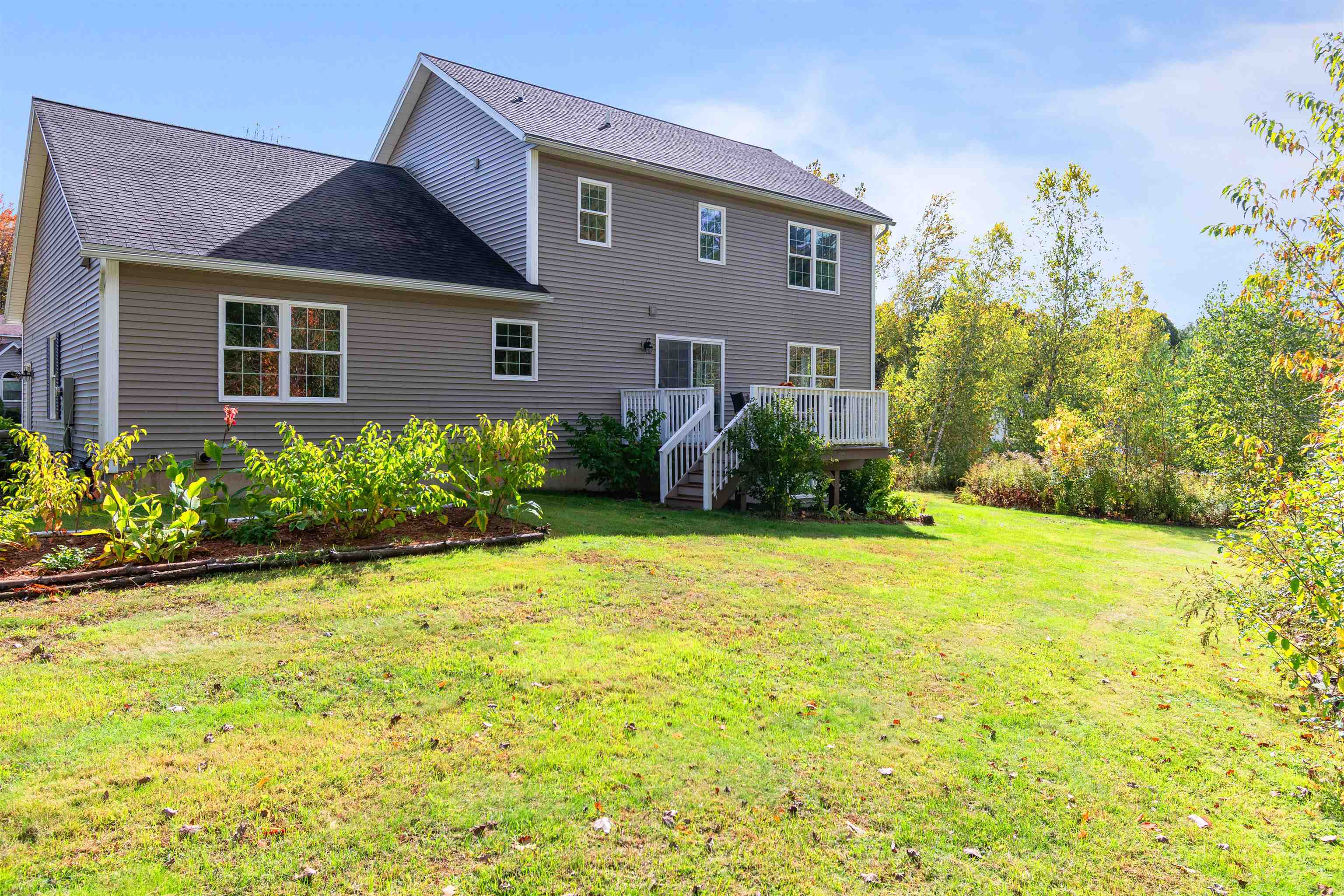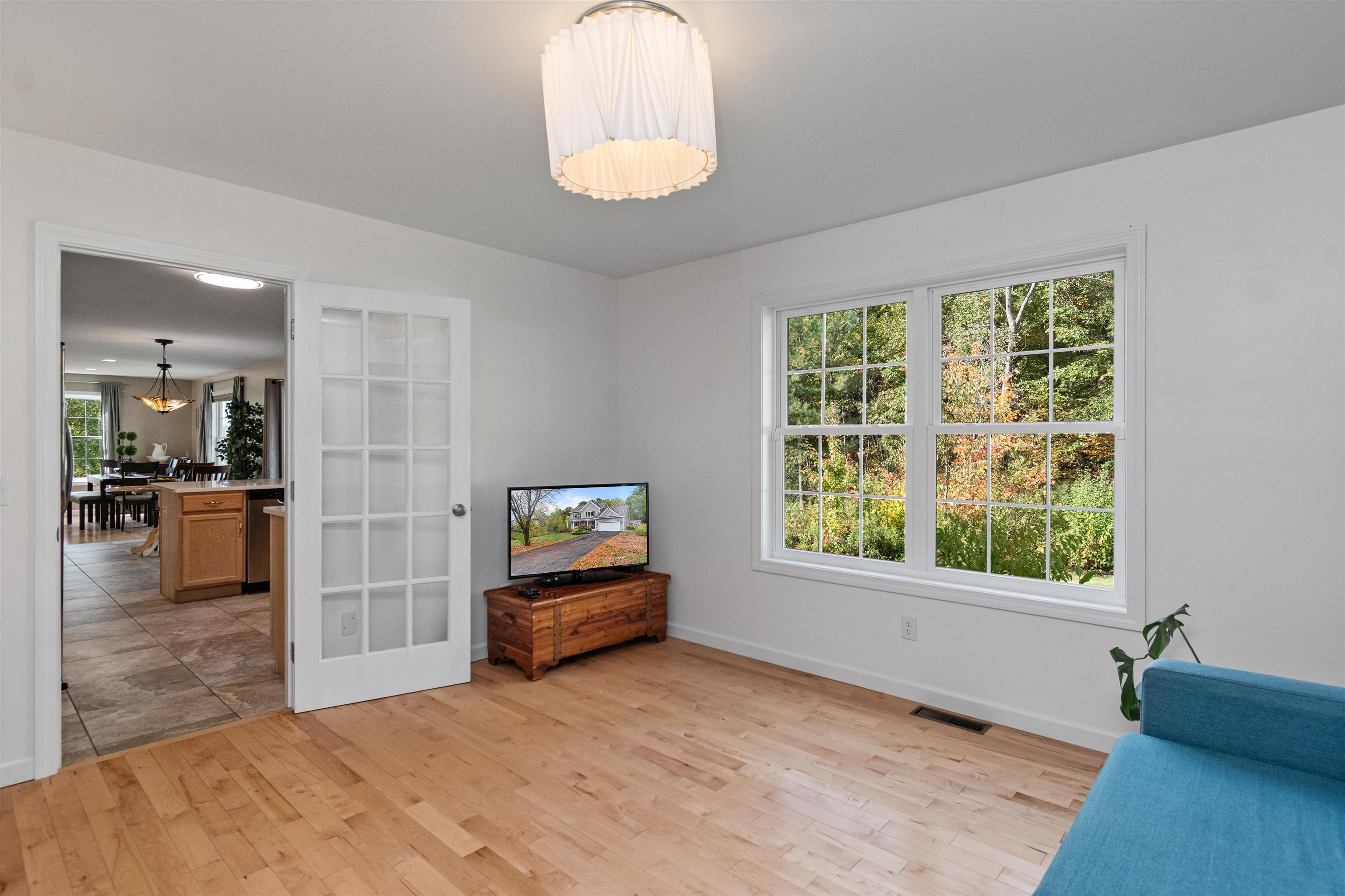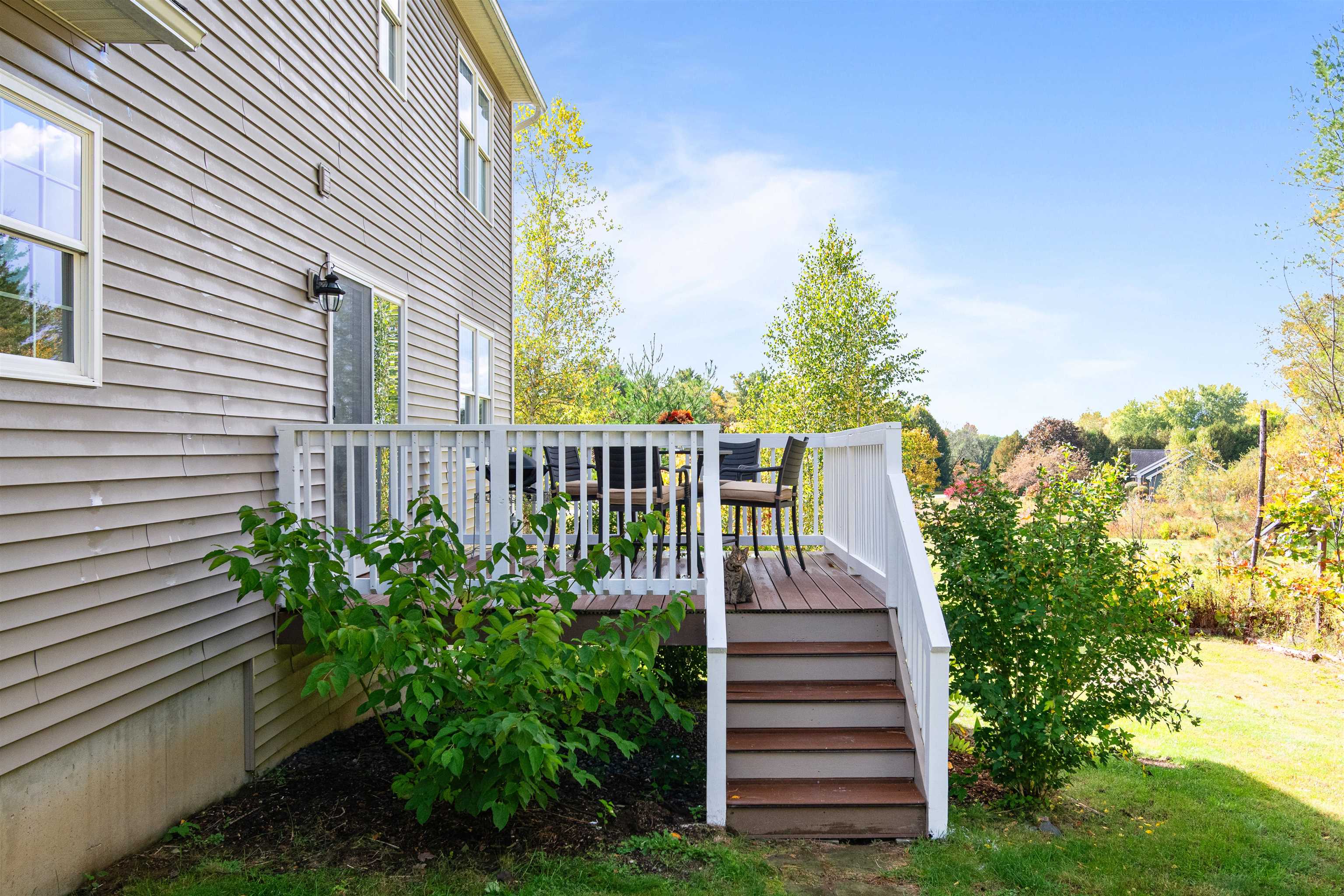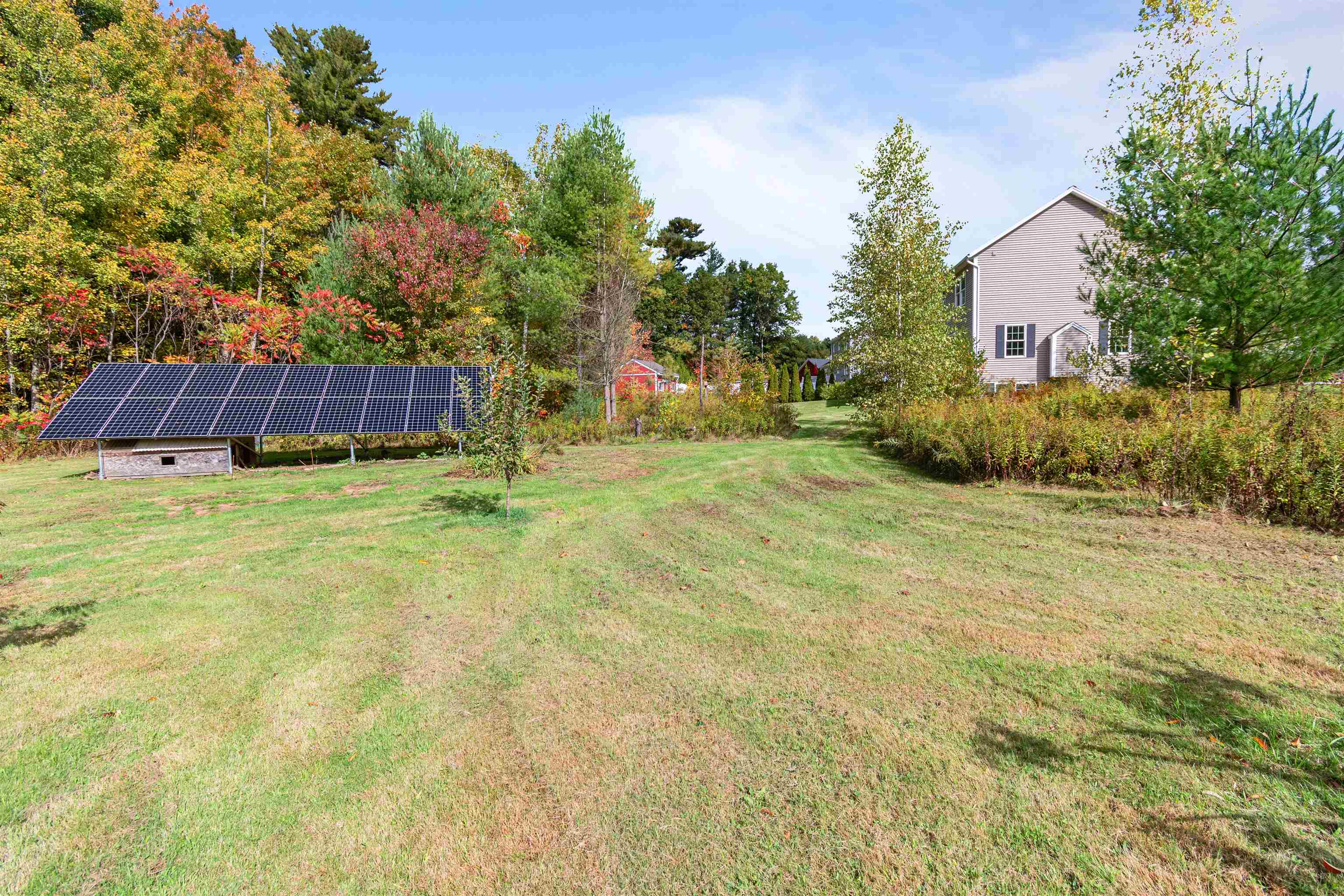 Set on 2.76 acres in a wonderful neighborhood, this charming 3-bedroom Colonial blends modern updates, natural beauty and sustainable living. A welcoming front porch invites you into a home filled with calming, warm tones and thoughtful updates. The open-concept living and dining area is perfect for entertaining, centered around a gas fireplace with tiled surround. The spacious, updated kitchen features quartz countertops, tile backsplash, ample cabinetry, room for a table and direct access to the back deck. Off the kitchen, a family room offers you additional flexible space. A convenient mudroom with coat hooks and adjacent laundry room provide functional storage. Upstairs, the primary suite boasts a large walk-in closet with built-ins and a private en suite bath. There’s two additional bedrooms and a full bath on this level. You’ll love the renovated basement with extra living space, luxury vinyl flooring and plenty of storage. Updated lighting throughout, along with an updated bathroom complete this move-in-ready home! Outside, this property truly shines! Enjoy a beautifully landscaped yard with native perennials and fruit trees including apples, cherries, pears, berries, and more. Owned solar panels provide low-to-no electric bills and free EV charging. Located off Route 7, with easy access to I-89 and local amenities, this property is ideal for small-scale homesteading, complete with a wide array of plants and space for livestock or gardens!