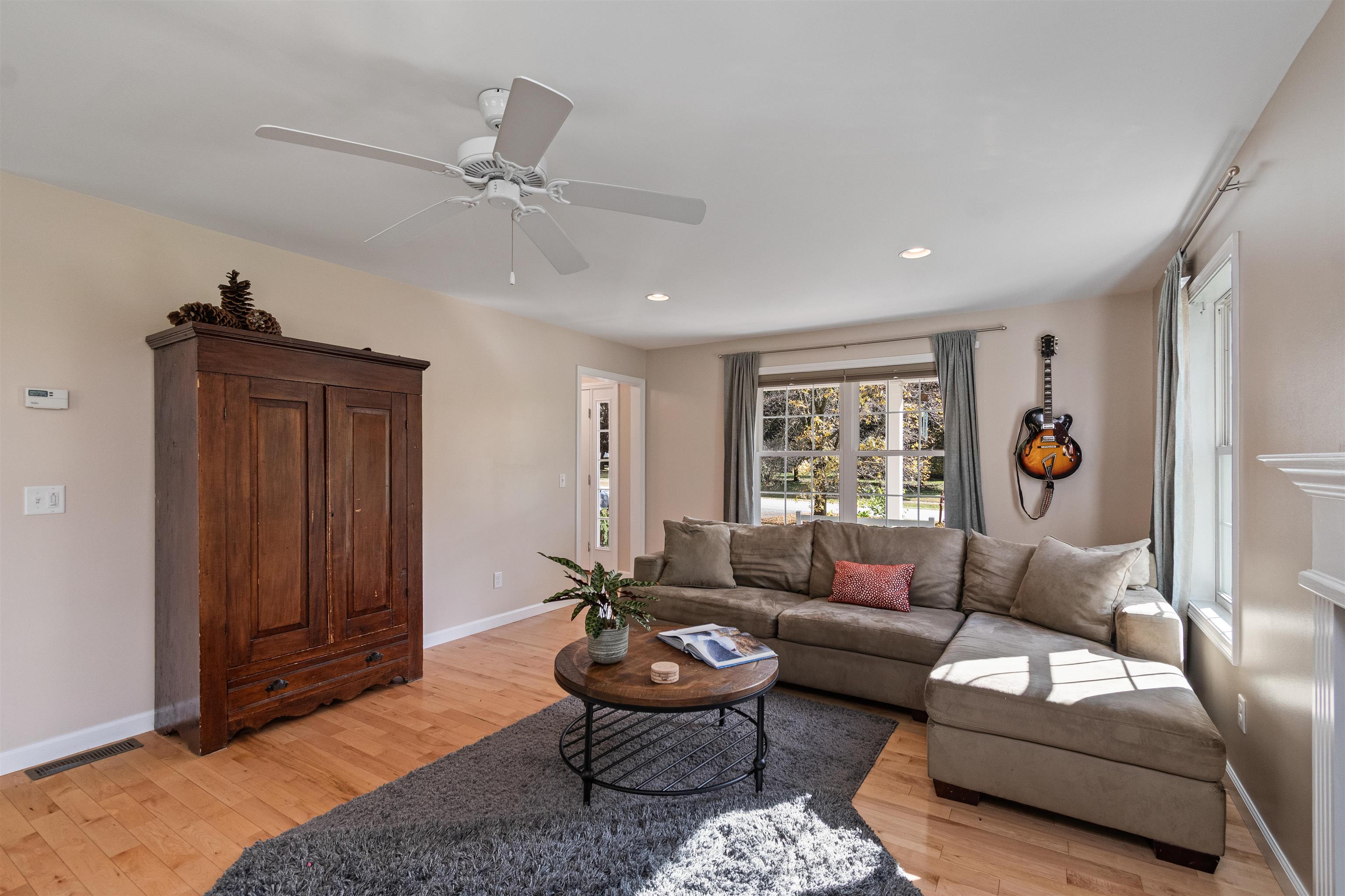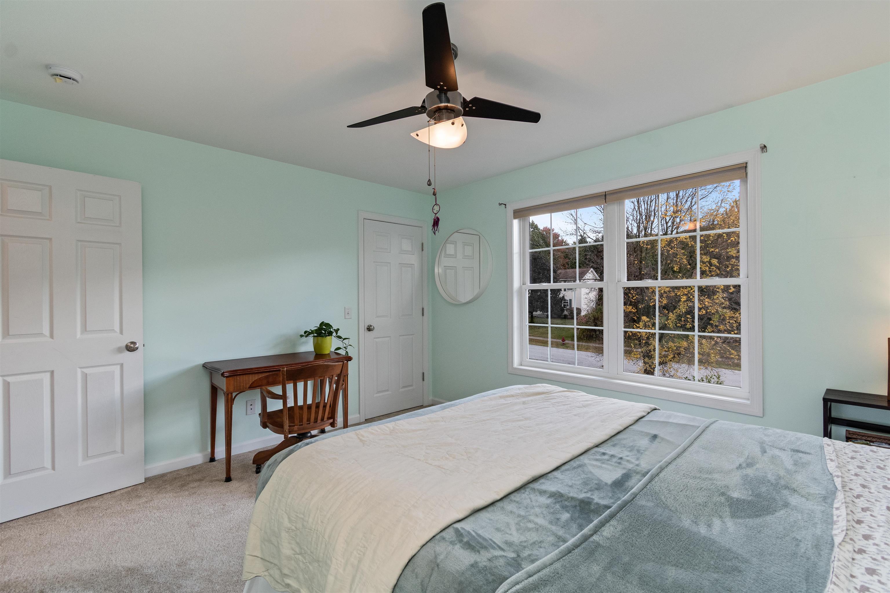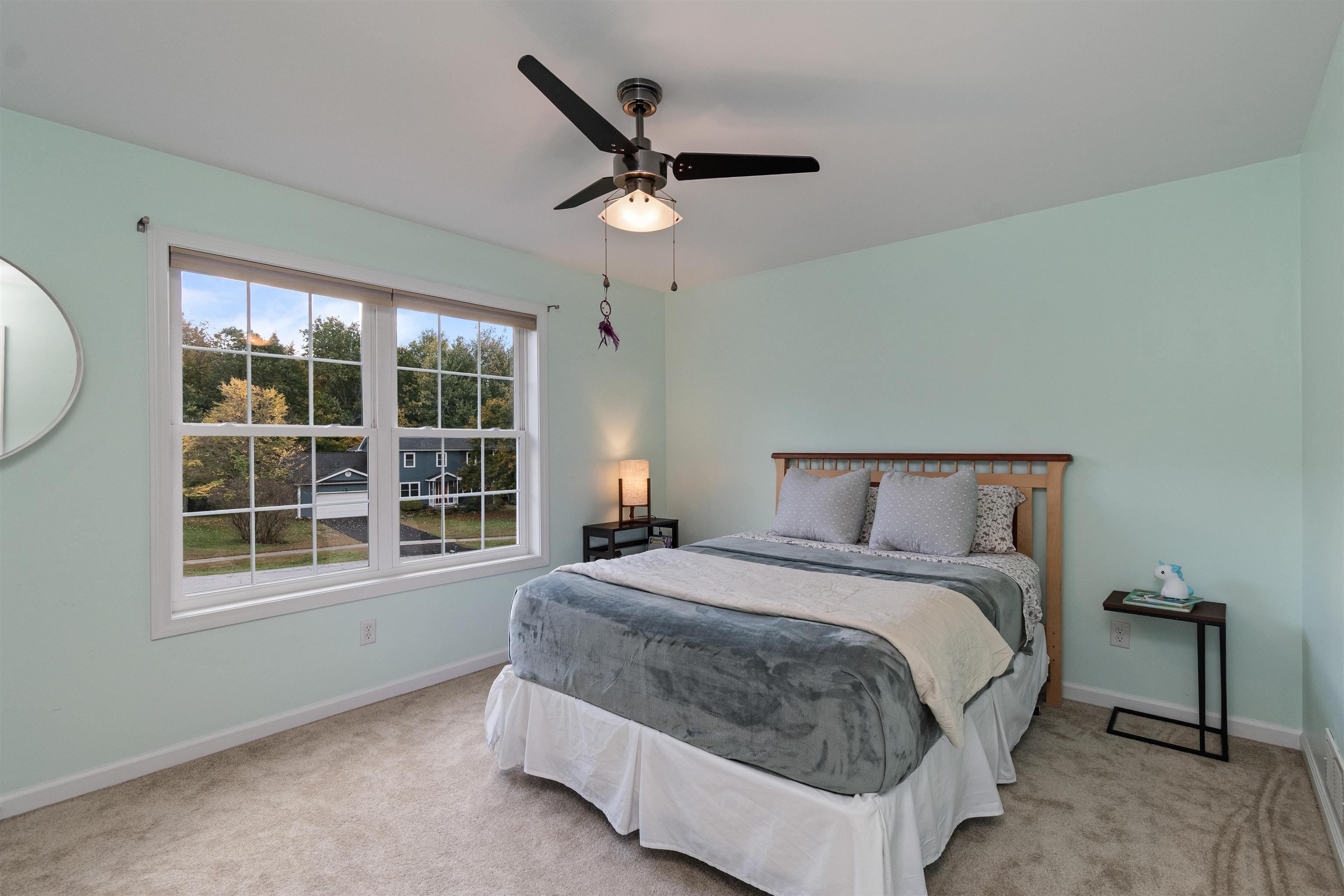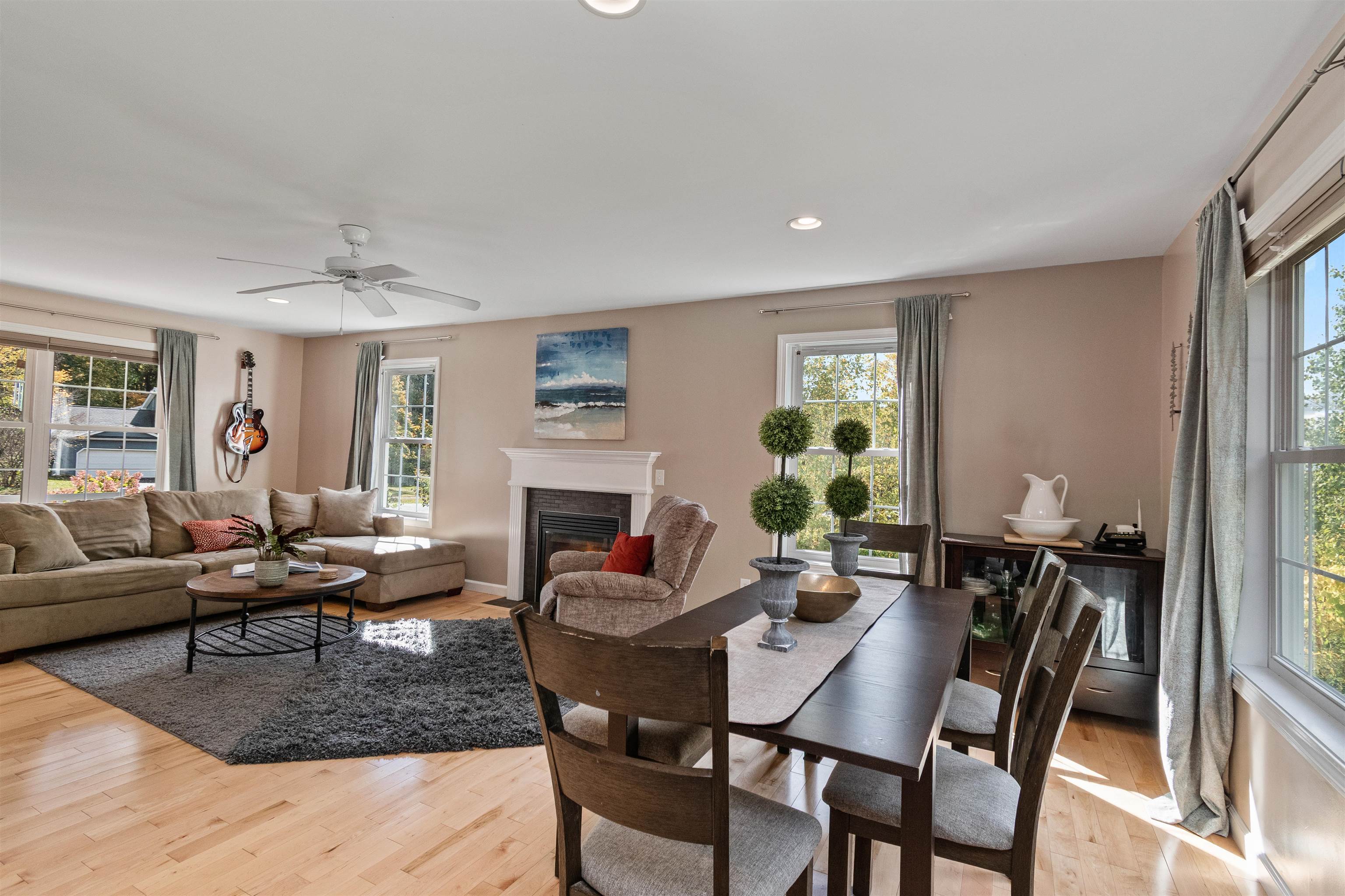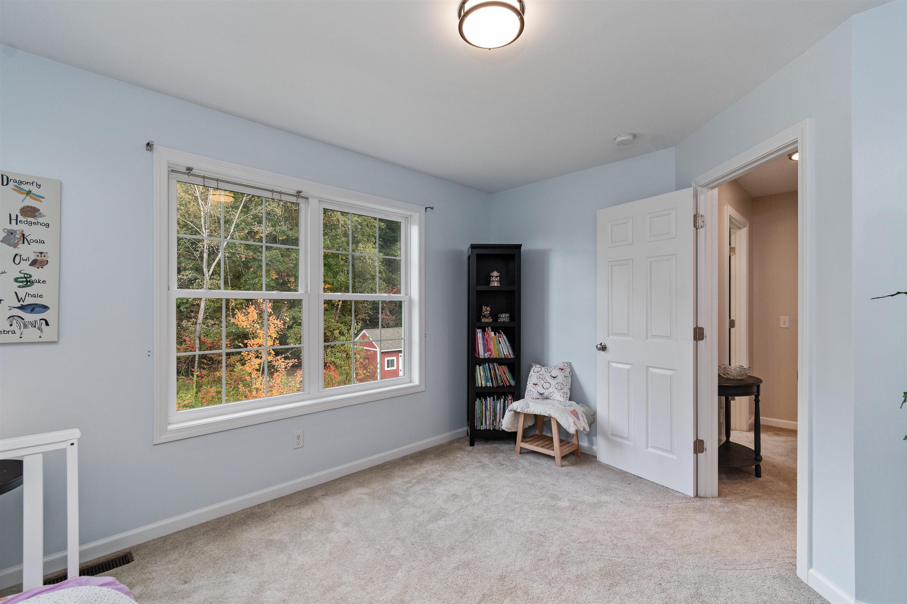 Set on 2.76 acres in a wonderful neighborhood, this charming 3-bedroom Colonial blends modern updates, natural beauty and sustainable living. A welcoming front porch invites you into a home filled with calming, warm tones and thoughtful updates. The open-concept living and dining area is perfect for entertaining, centered around a gas fireplace with tiled surround. The spacious, updated kitchen features quartz countertops, tile backsplash, ample cabinetry, room for a table and direct access to the back deck. Off the kitchen, a family room offers you additional flexible space. A convenient mudroom with coat hooks and adjacent laundry room provide functional storage. Upstairs, the primary suite boasts a large walk-in closet with built-ins and a private en suite bath. There’s two additional bedrooms and a full bath on this level. You’ll love the renovated basement with extra living space, luxury vinyl flooring and plenty of storage. Updated lighting throughout, along with an updated bathroom complete this move-in-ready home! Outside, this property truly shines! Enjoy a beautifully landscaped yard with native perennials and fruit trees including apples, cherries, pears, berries, and more. Owned solar panels provide low-to-no electric bills and free EV charging. Located off Route 7, with easy access to I-89 and local amenities, this property is ideal for small-scale homesteading, complete with a wide array of plants and space for livestock or gardens!