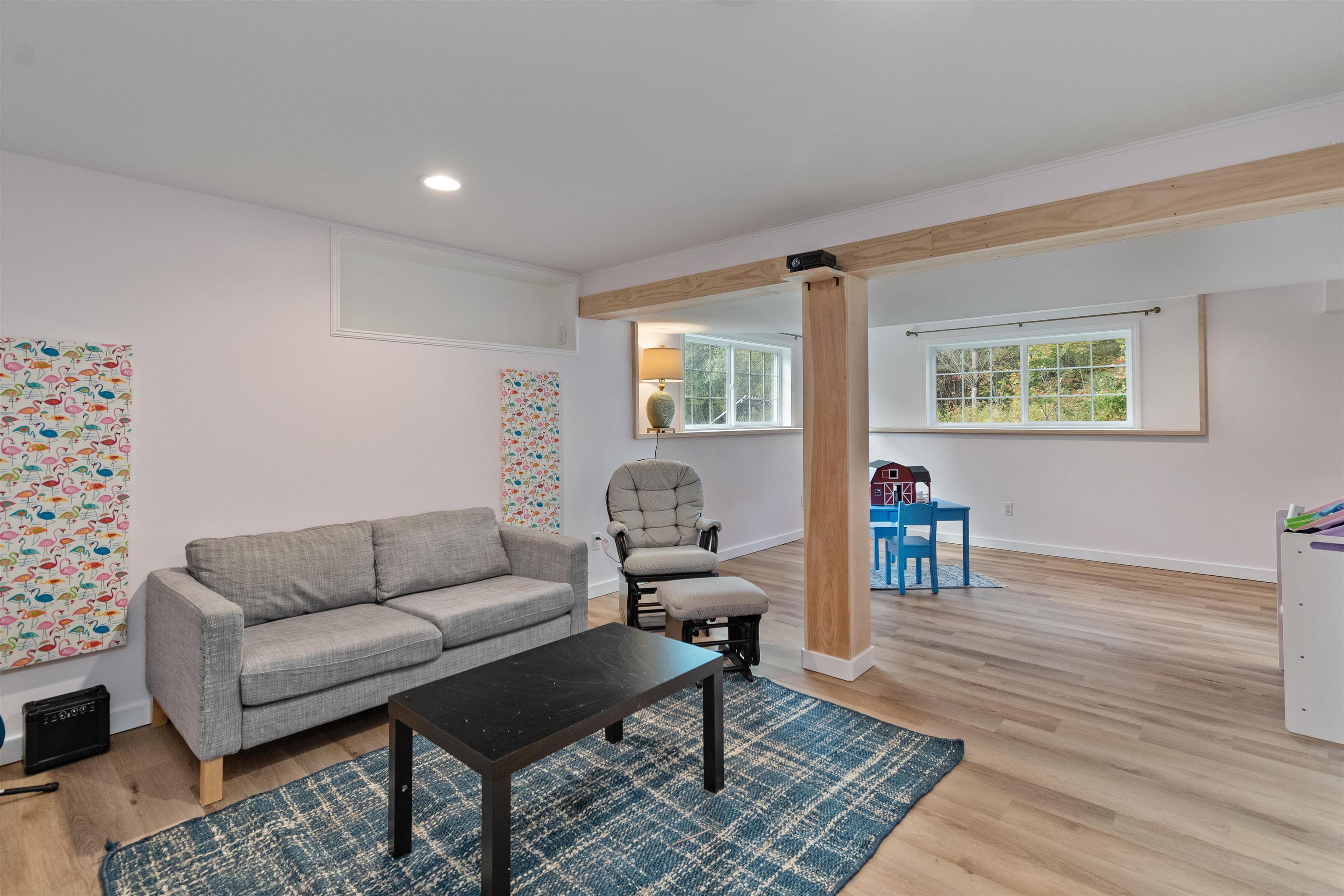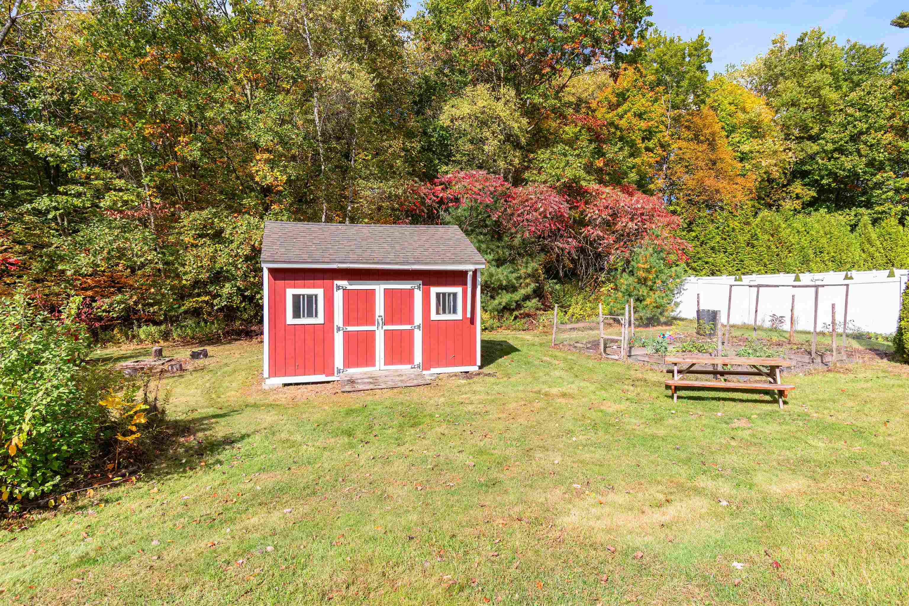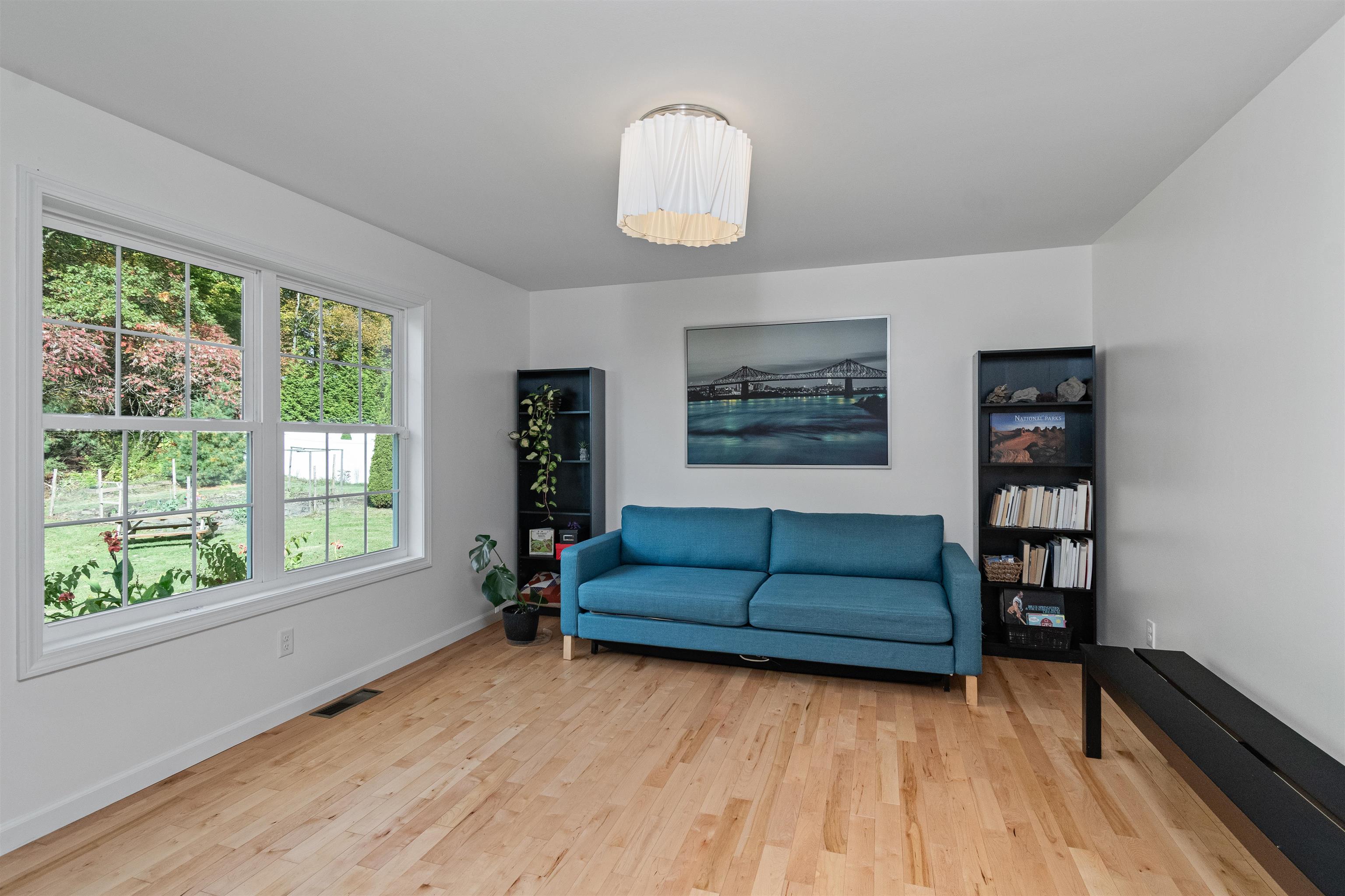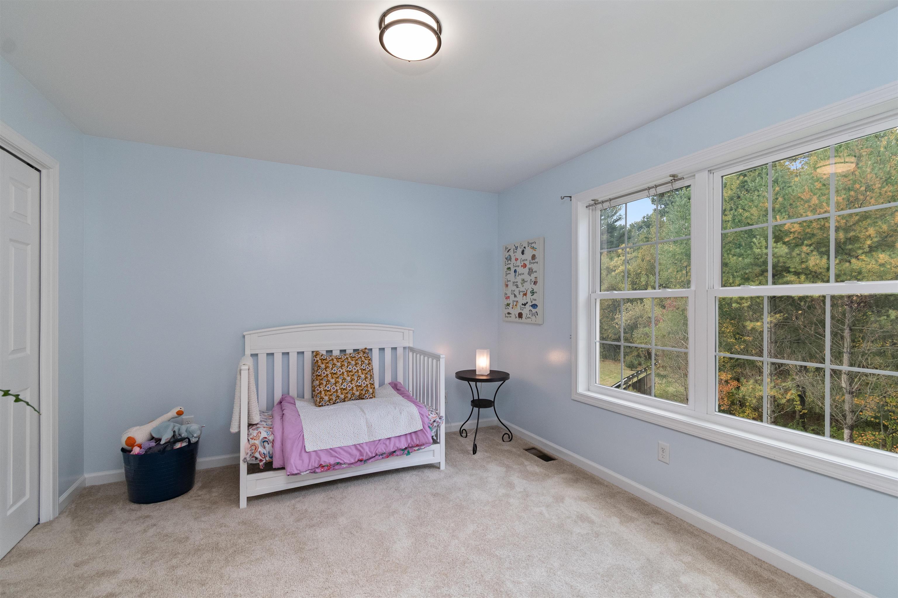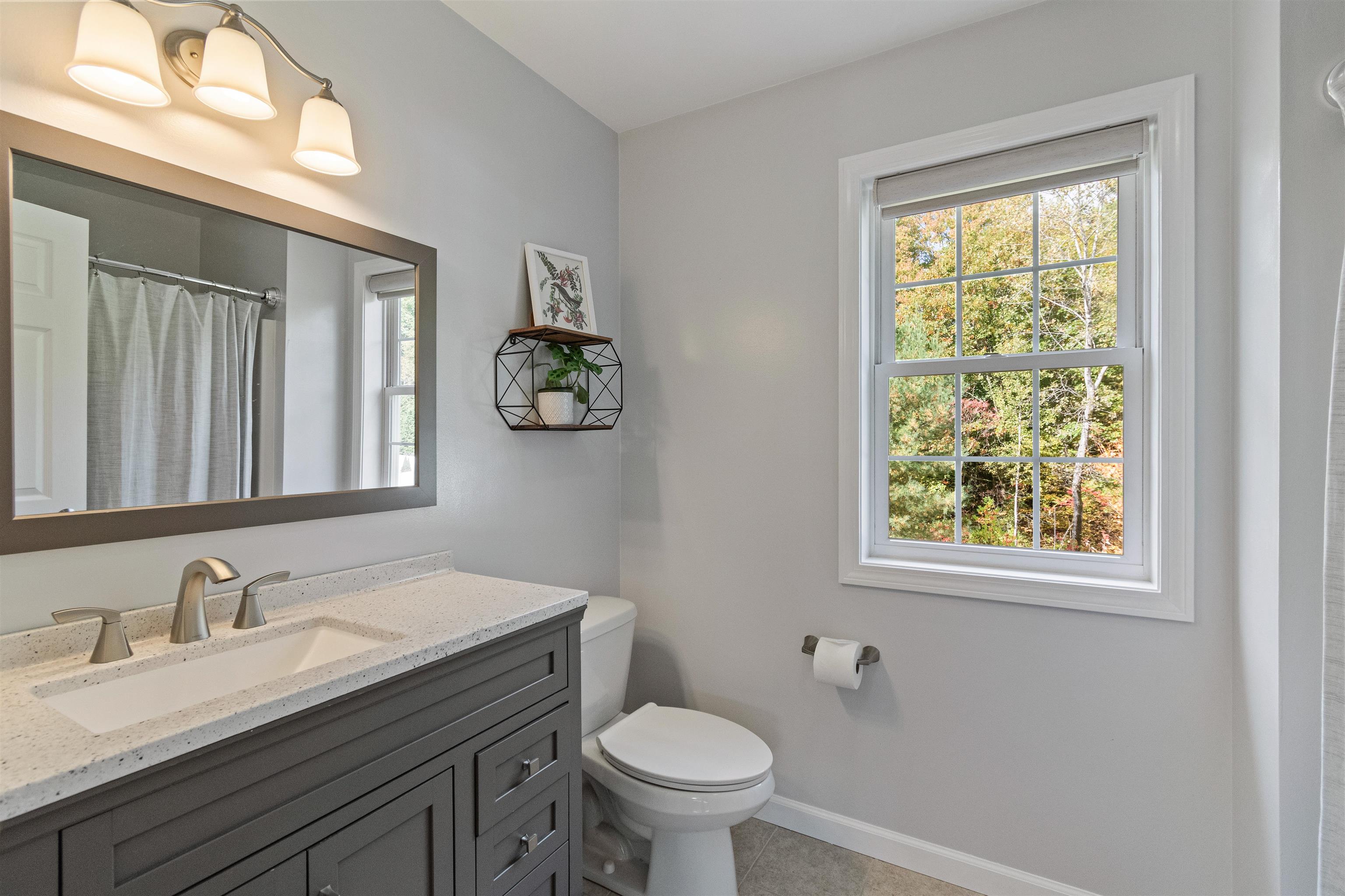 Set on 2.76 acres in a wonderful neighborhood, this charming 3-bedroom Colonial blends modern updates, natural beauty and sustainable living. A welcoming front porch invites you into a home filled with calming, warm tones and thoughtful updates. The open-concept living and dining area is perfect for entertaining, centered around a gas fireplace with tiled surround. The spacious, updated kitchen features quartz countertops, tile backsplash, ample cabinetry, room for a table and direct access to the back deck. Off the kitchen, a family room offers you additional flexible space. A convenient mudroom with coat hooks and adjacent laundry room provide functional storage. Upstairs, the primary suite boasts a large walk-in closet with built-ins and a private en suite bath. There’s two additional bedrooms and a full bath on this level. You’ll love the renovated basement with extra living space, luxury vinyl flooring and plenty of storage. Updated lighting throughout, along with an updated bathroom complete this move-in-ready home! Outside, this property truly shines! Enjoy a beautifully landscaped yard with native perennials and fruit trees including apples, cherries, pears, berries, and more. Owned solar panels provide low-to-no electric bills and free EV charging. Located off Route 7, with easy access to I-89 and local amenities, this property is ideal for small-scale homesteading, complete with a wide array of plants and space for livestock or gardens!