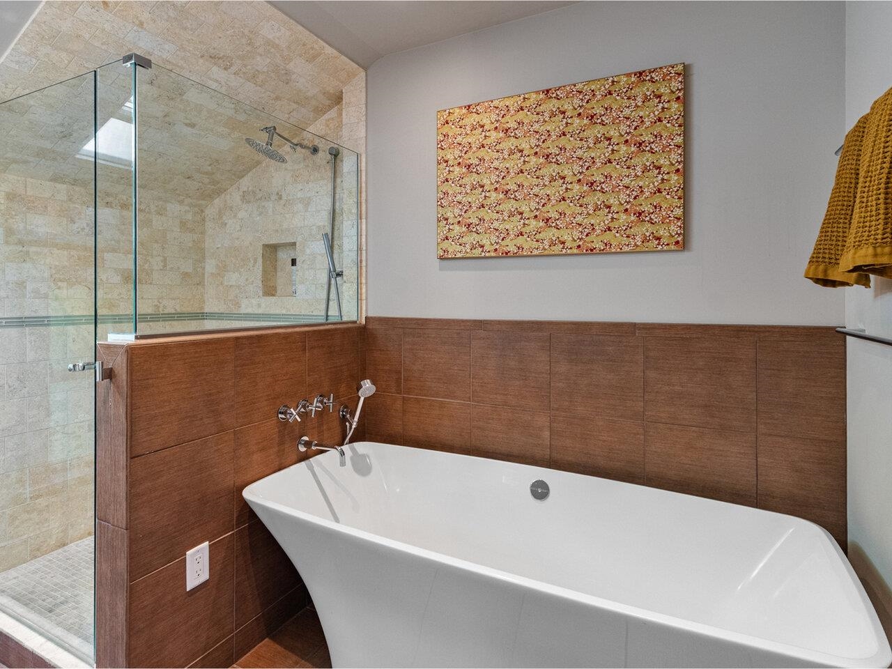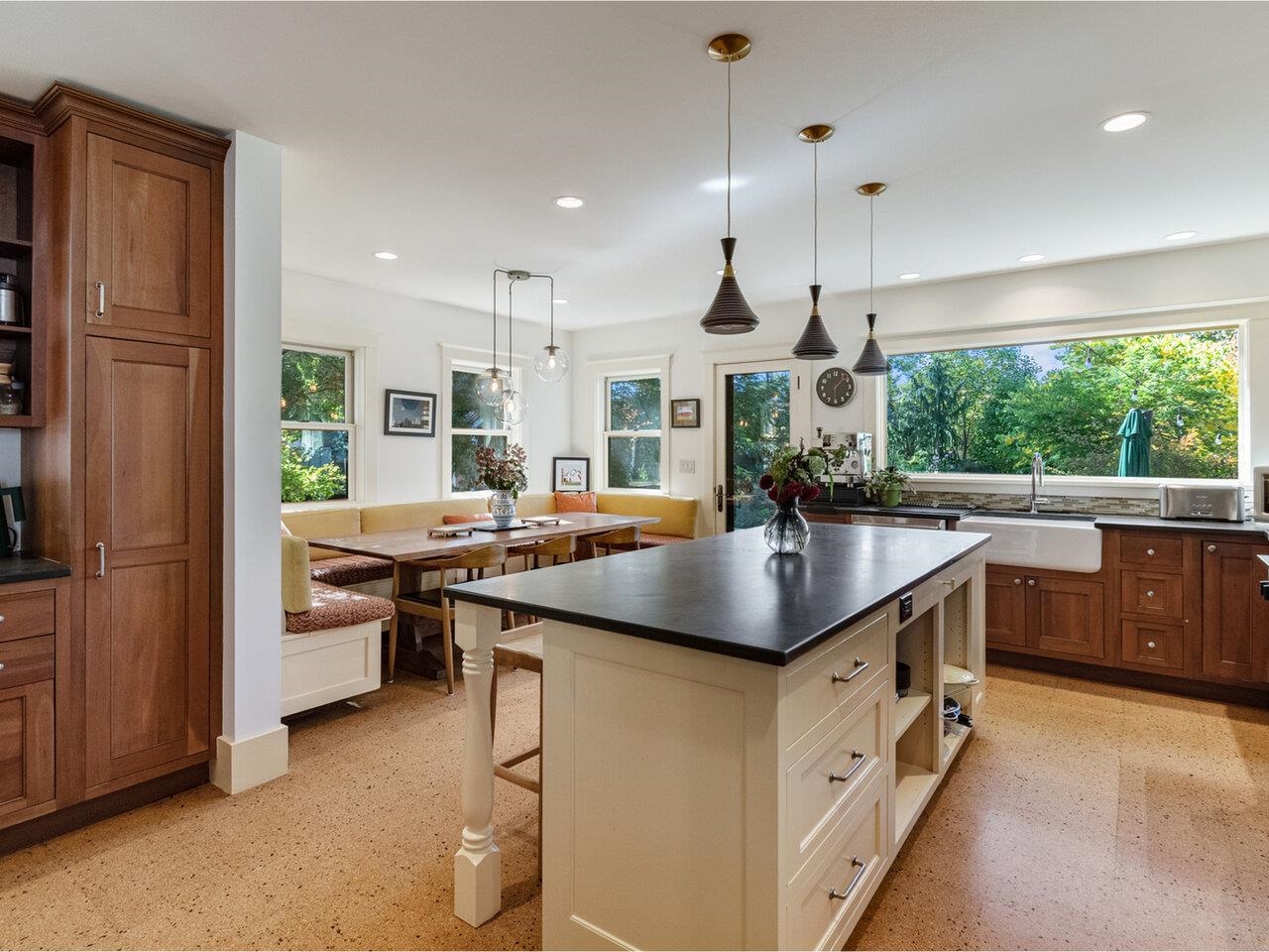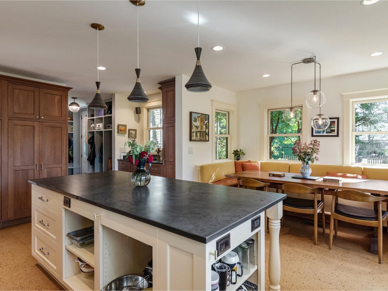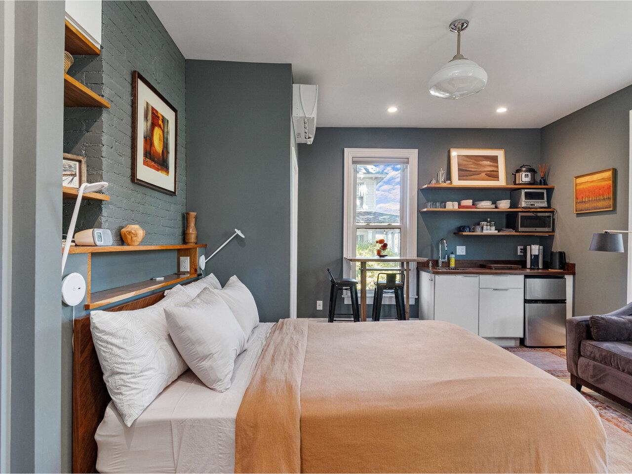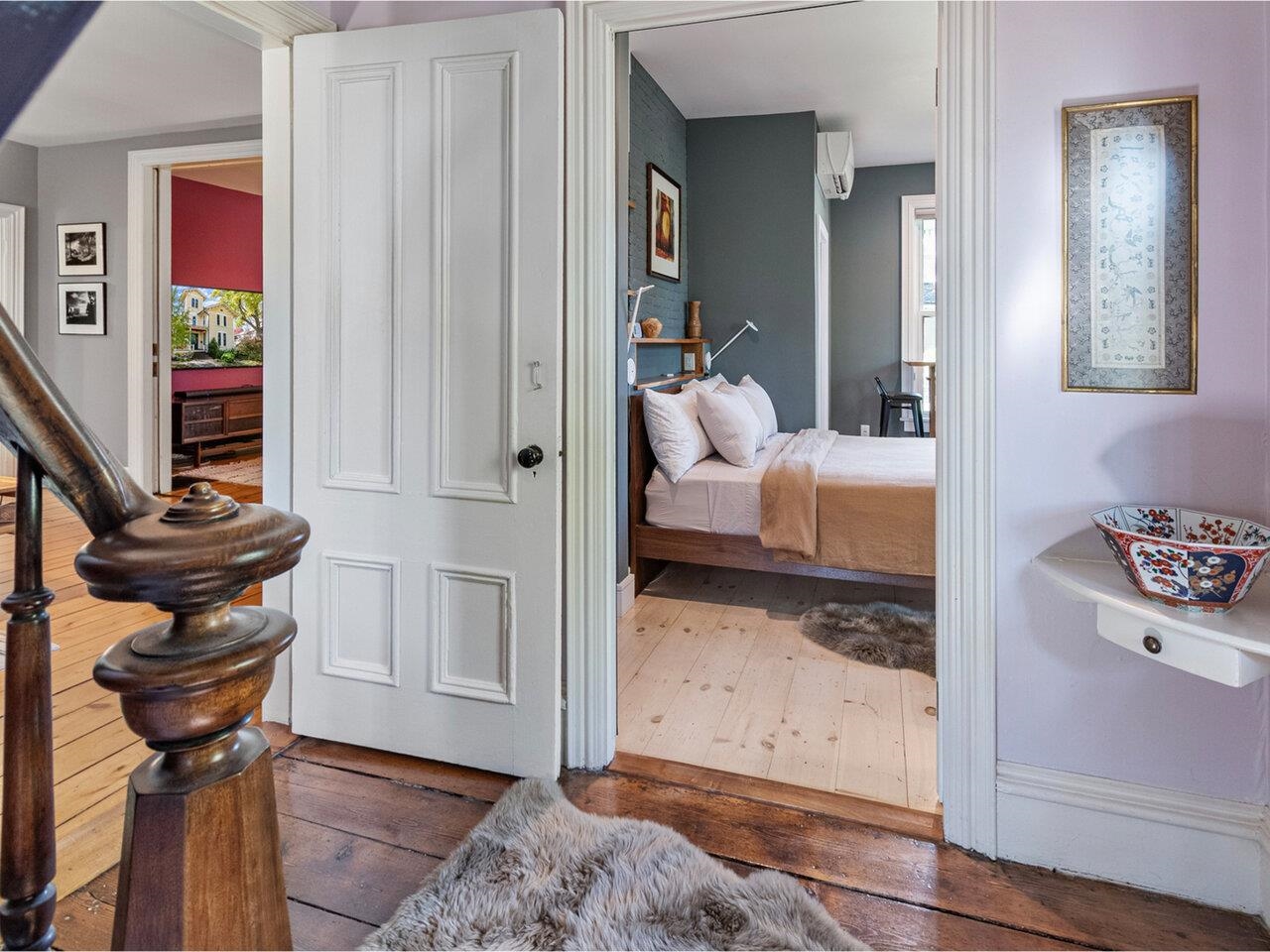 In the heart of Burlington, this unique 1880 Italianate/Eastlake home has been meticulously restored to blend historic charm with modern comfort. Boasting five bedrooms and four baths, it offers light-filled, spacious living with extraordinary character throughout. The renovated kitchen is a chef's dream, featuring a Blue Star gas range, convection oven, slate counters, large island, custom cabinetry, banquette dining, and garden views. A convenient laundry and full bath sit just off the kitchen. The expansive primary suite features cathedral ceilings, garden-facing windows, radiant floor heat, soaking tub, separate shower, and elegant finishes. A first-floor bedroom with en suite, kitchenette, and private entrance currently serves as a high-demand Airbnb but can easily function as an au pair or guest suite. The second floor offers four bedrooms, two baths, and a third-floor tower with 360-degree treetop and seasonal lake views. Living spaces include a front living room with gas fireplace and a media room with original pocket doors. Outdoors, enjoy patios, landscaped gardens with specimen trees, a deep city yard, front and back porches, garage with potting shed, and ample parking. Thoughtfully maintained and ideally located within a stone's throw to downtown, the University of Vermont, and UVM Medical Center, this home is a rare Burlington treasure.