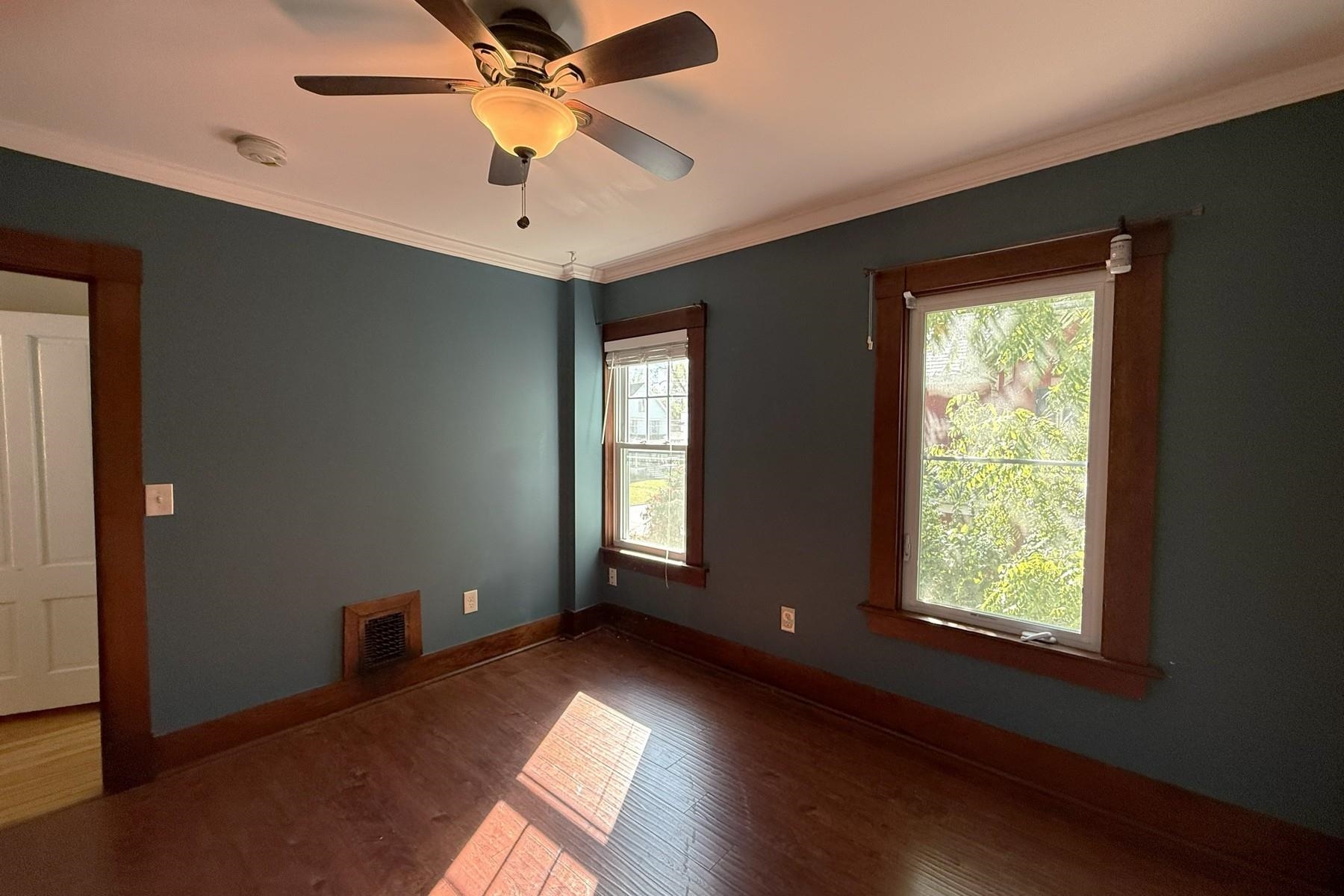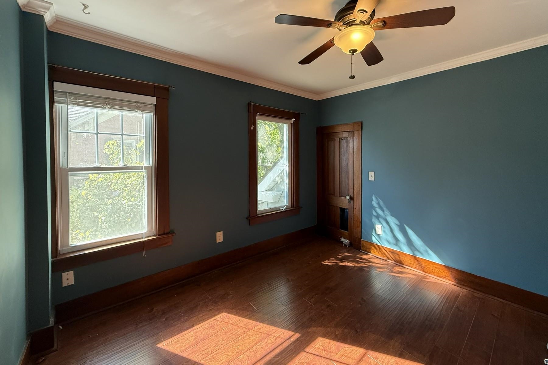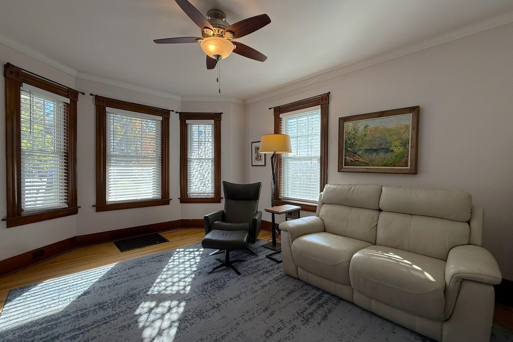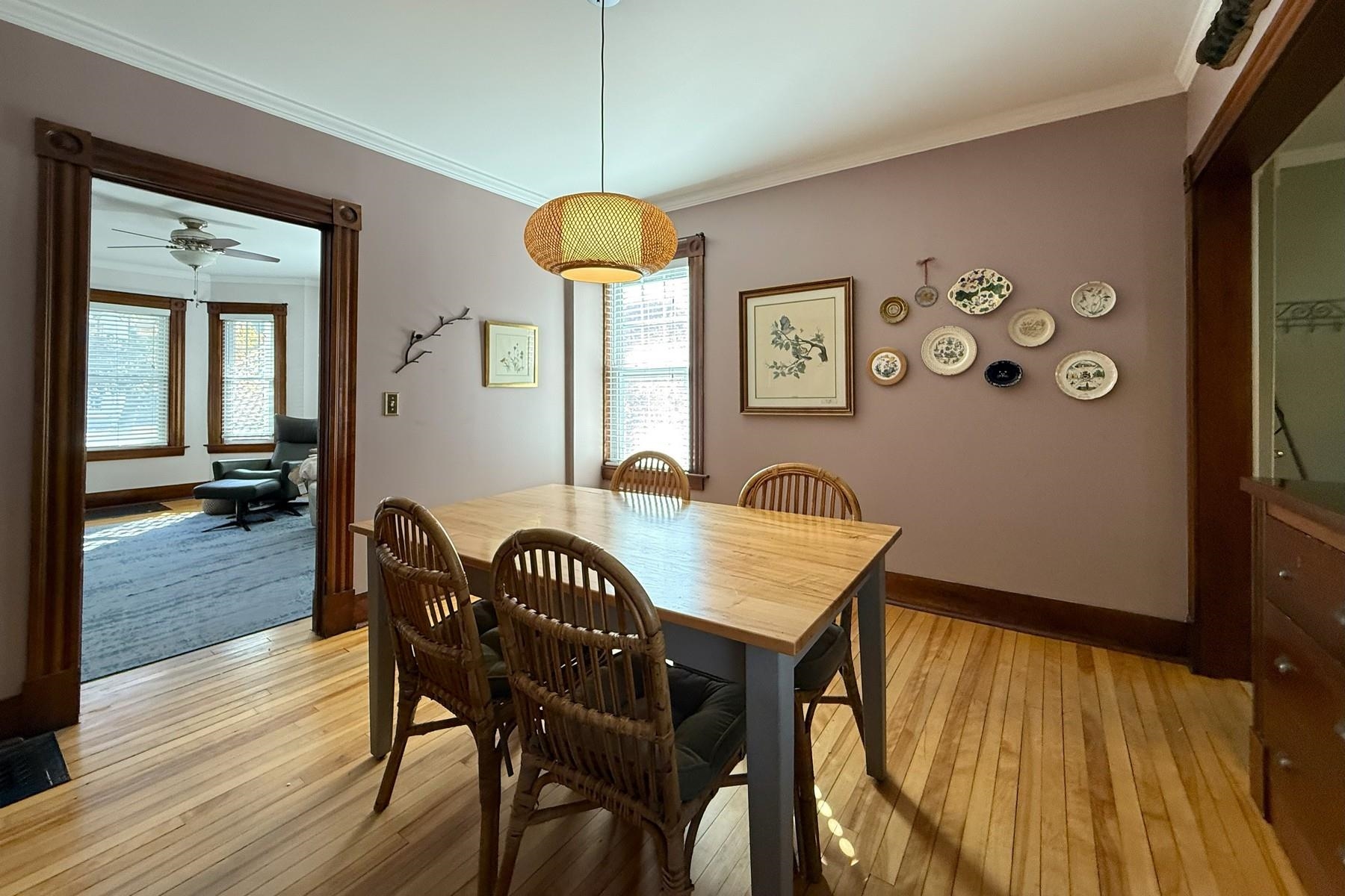 - Blinds, Ceiling Fan, Dining Area, Natural Woodwork, Basement Laundry