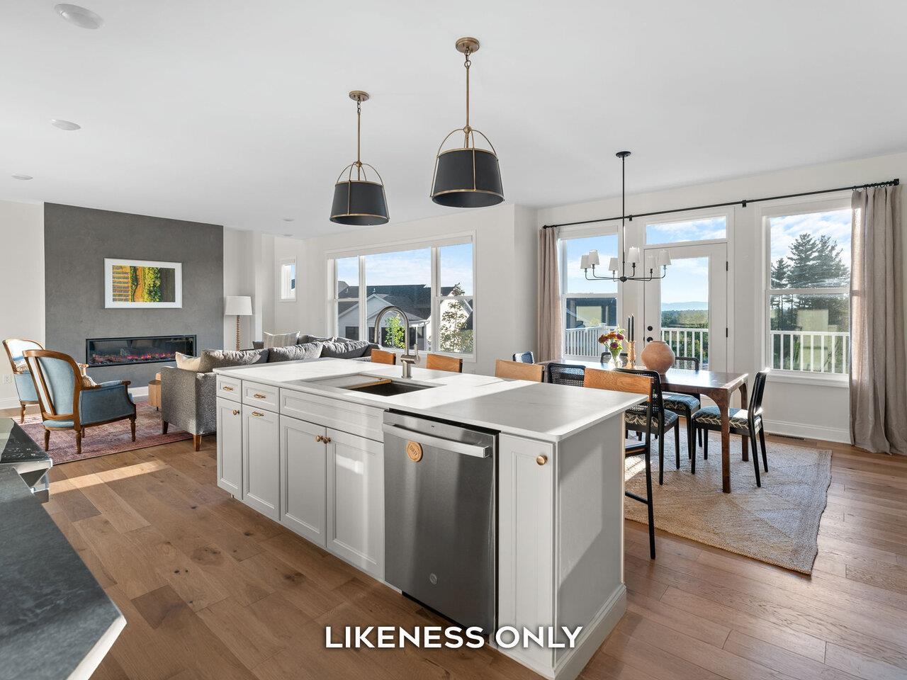 Enjoy sweeping, panoramic Green Mountain views from your luxurious new 3, 484 sq. ft. Equinox at Hillside East. Thoughtfully designed, this stunning home features 4 bedrooms and 3 1/2 bathrooms, a chef’s kitchen, hardwood floors, heat pumps, air conditioning, and elegant quartz countertops. The expansive walls of windows and soaring ceilings create a bright, open atmosphere, while a spacious deck offers breathtaking views of Camel’s Hump and Mount Mansfield. Equinox’s open floor plan is ideal for active households, with soaring vaulted ceilings and 10-foot ceilings on the first floor and 9-foot ceilings on the second floor, creating a spacious and airy atmosphere. The chef’s kitchen features a large center island, premium finishes and appliances, and an adjacent morning kitchen for additional workspace and storage. A first-floor guest suite provides privacy and convenience, while the second-floor primary suite is a serene retreat, complete with a spa-inspired bathroom, expansive walk-in closet, and direct access to a spacious loft area. Enjoy seamless indoor-outdoor living with a wraparound deck and a walkout lower level, offering endless possibilities for entertaining or creating a signature custom space. Additional highlights include multiple walk-in closets, a 3-car garage, and premium standard features such as hardwood and tile flooring, Marvin windows, and an electric fireplace.