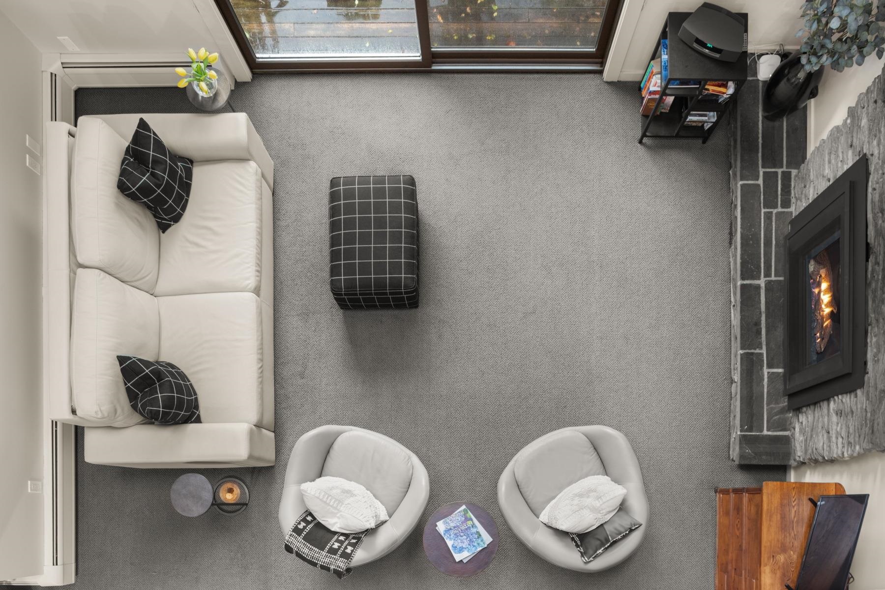 - Blinds, Dining Area, Gas Fireplace, Furnished, Hearth, Kitchen/Dining, Natural Light, Skylight, Vaulted Ceiling, Wet Bar, Window Treatment
