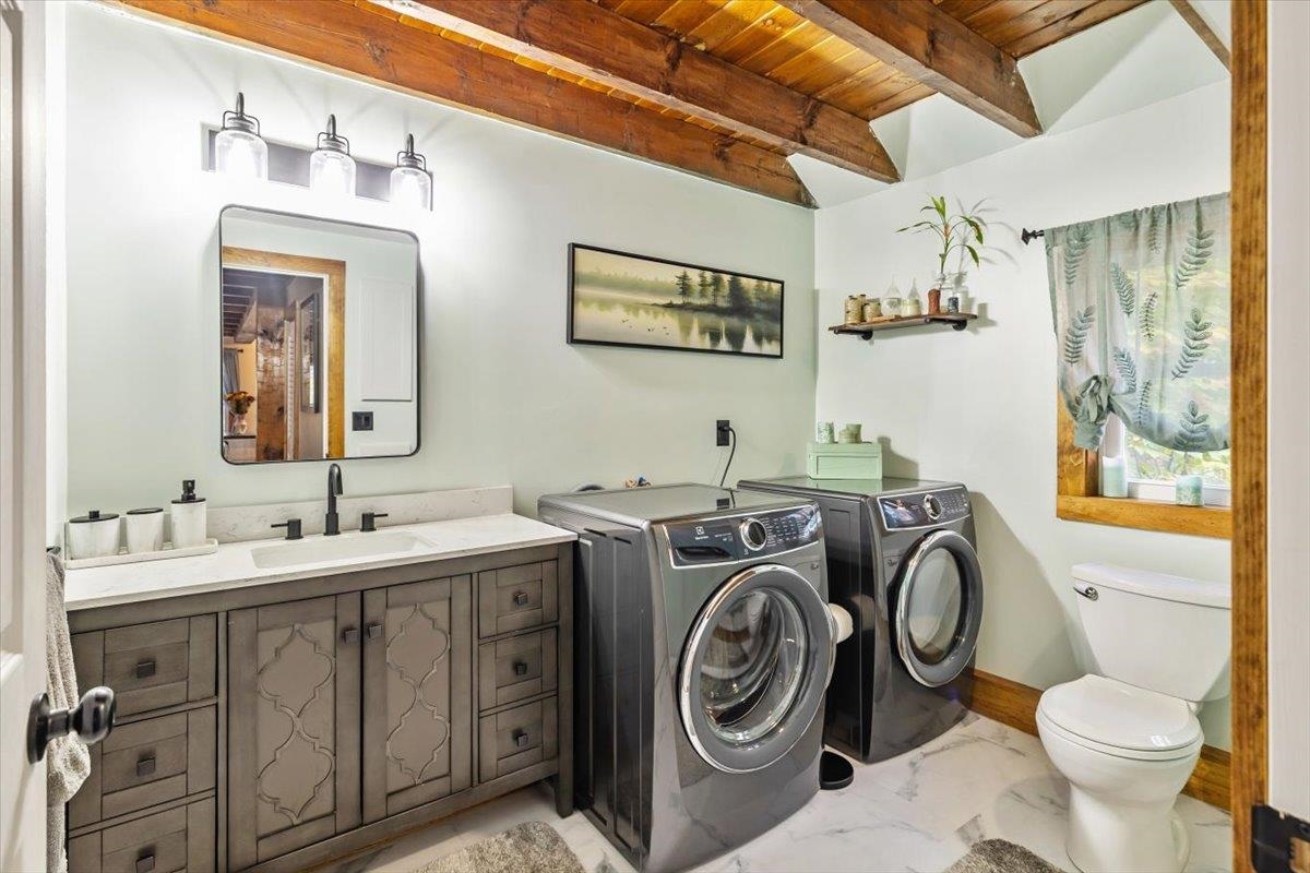 - Cathedral Ceiling, Kitchen/Living, Natural Light, Natural Woodwork, 1st Floor Laundry