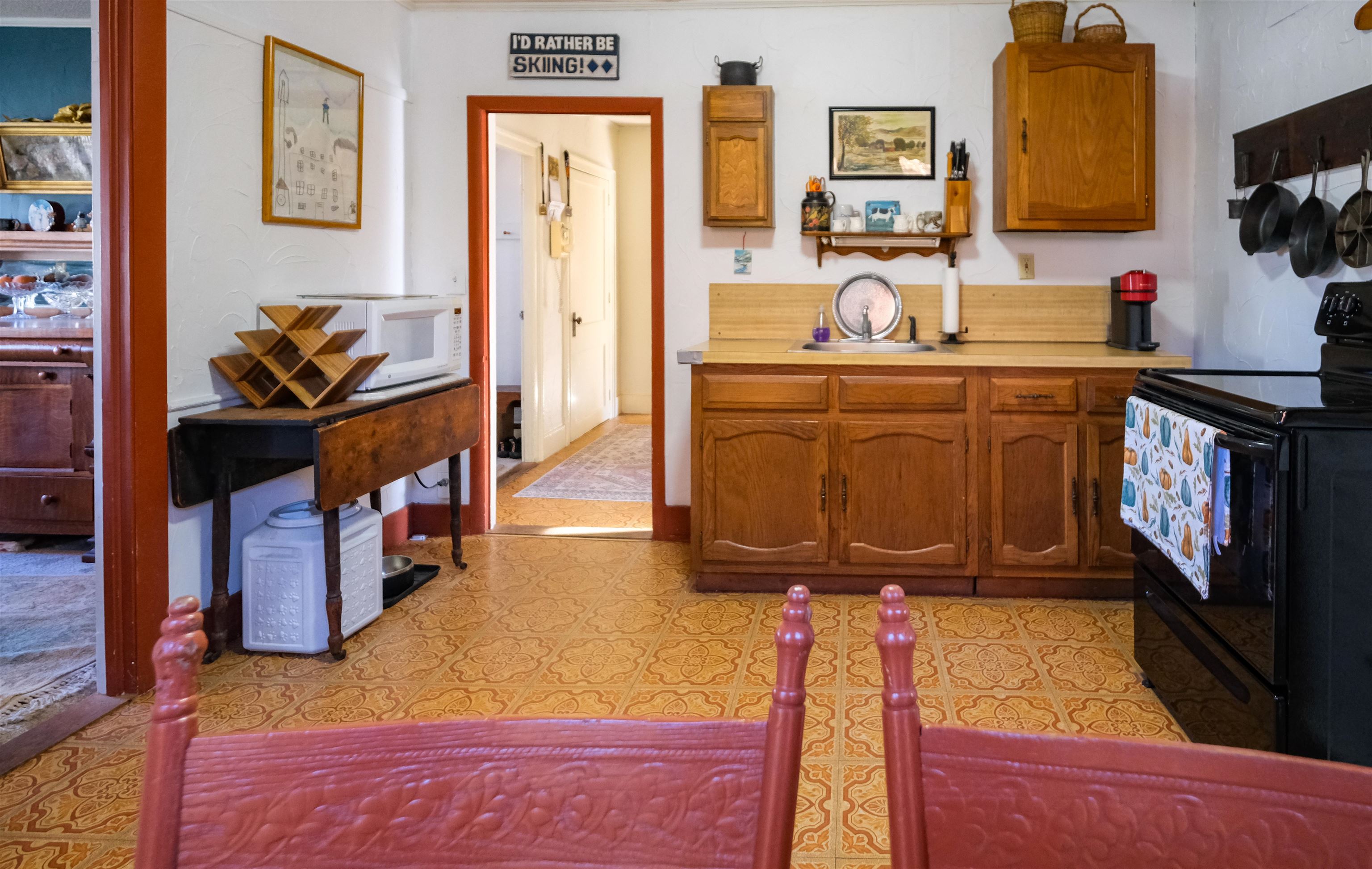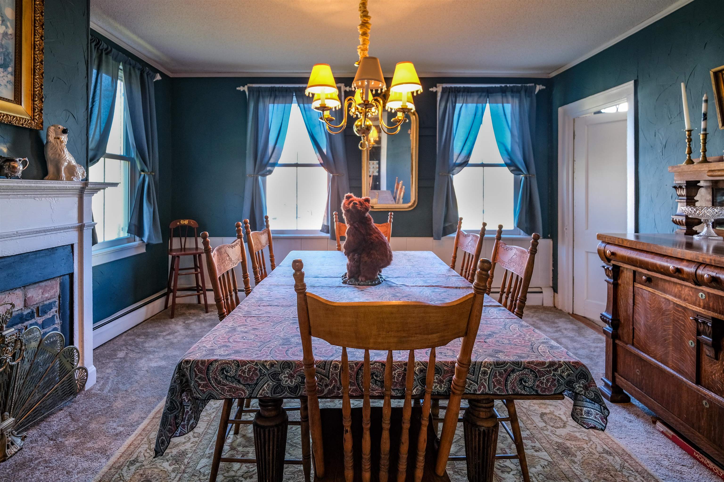 - Dining Area, Wood Fireplace, 3+ Fireplaces, Furnished, Kitchen/Dining, Natural Light, Natural Woodwork, Indoor Storage, Wood Stove Insert, Walkup Attic