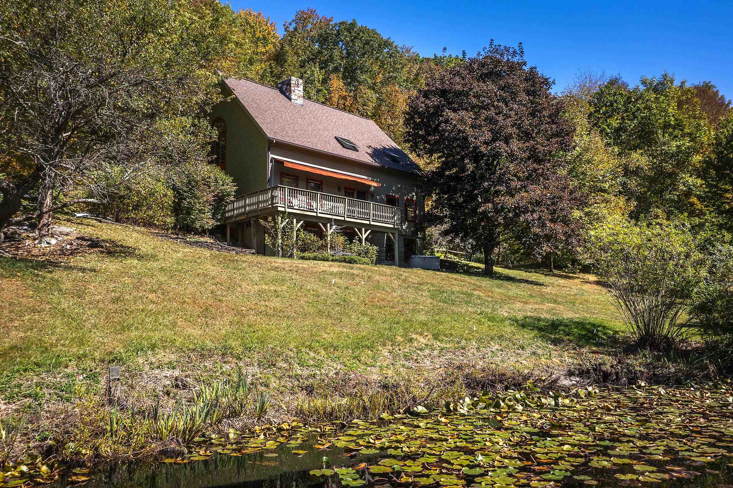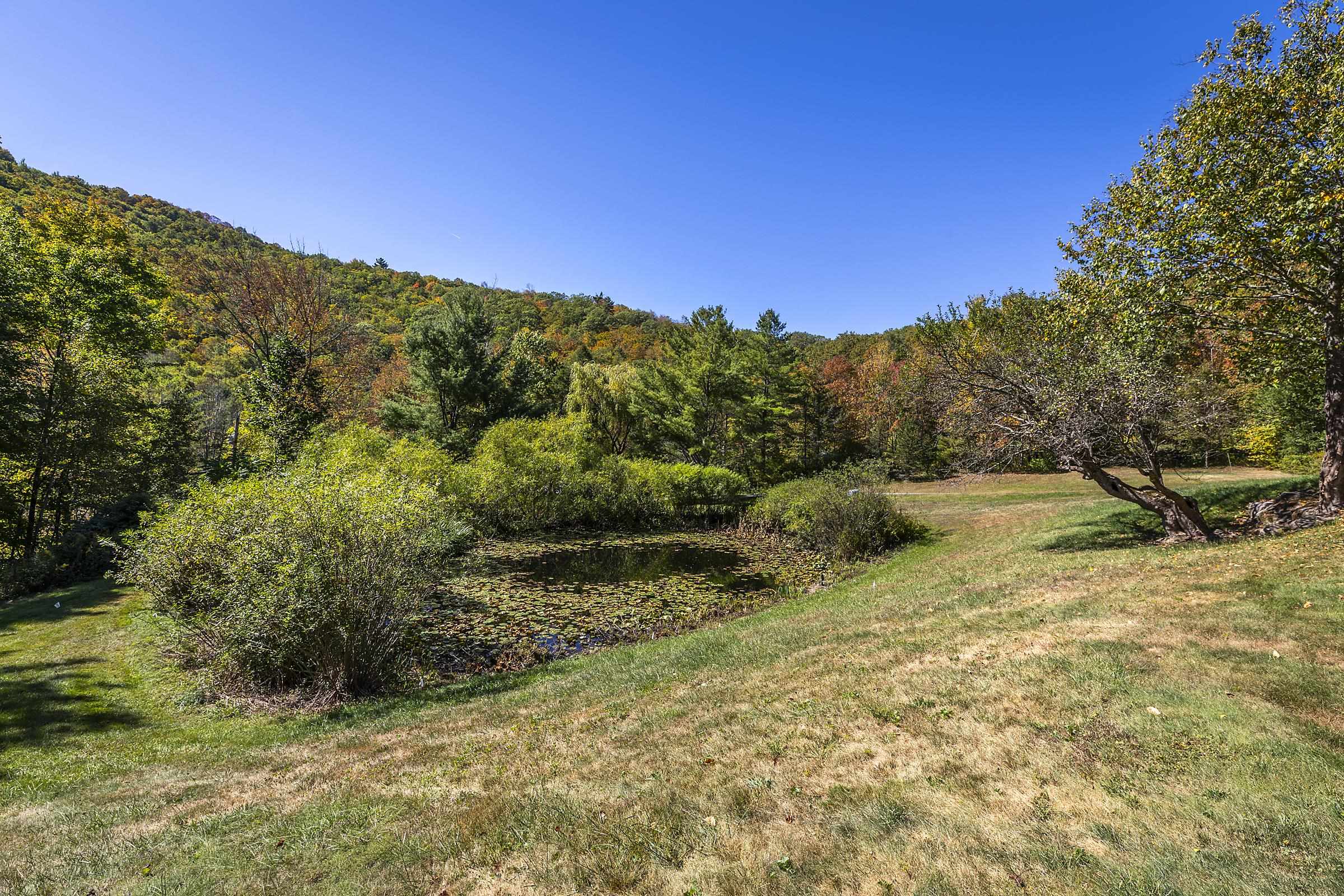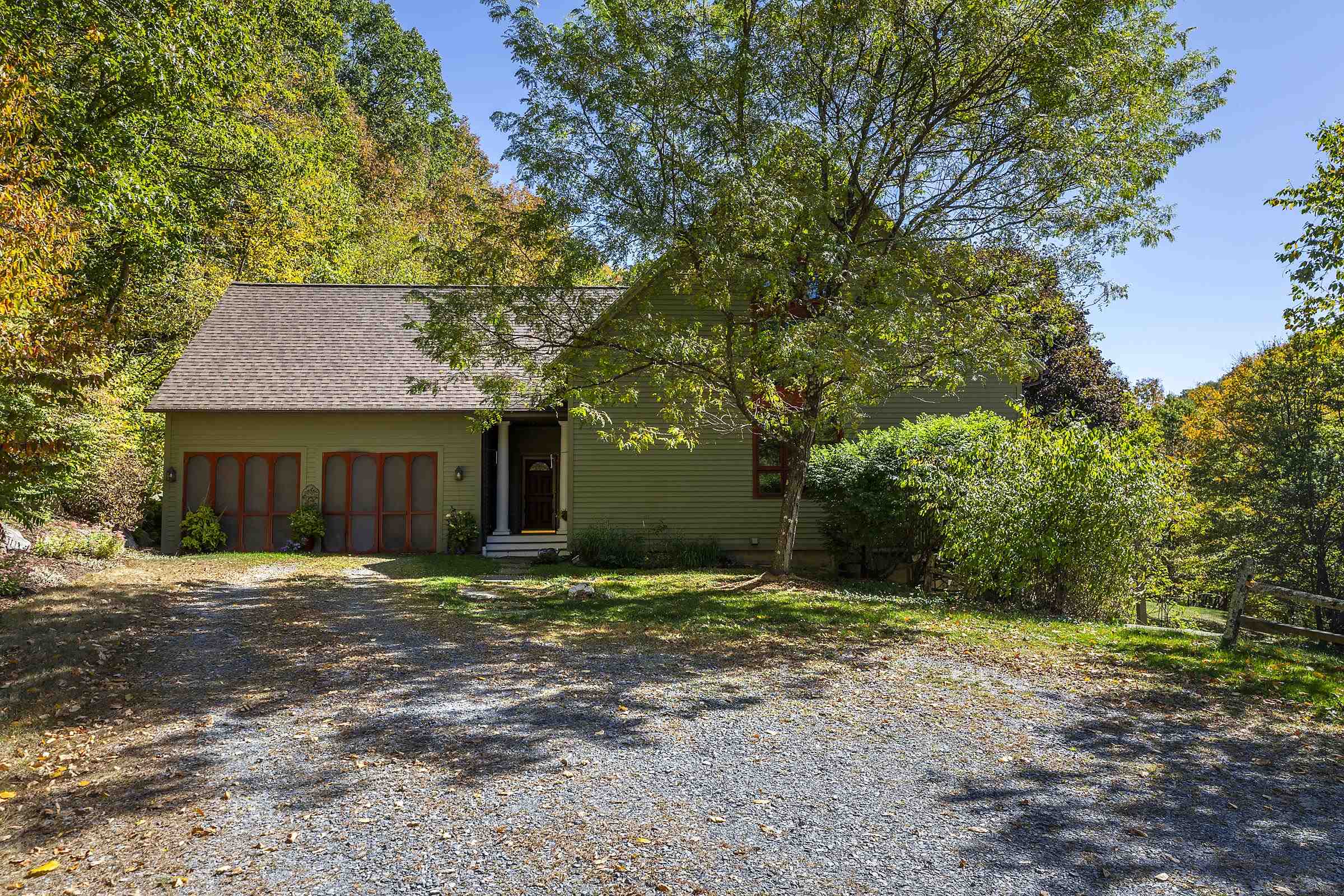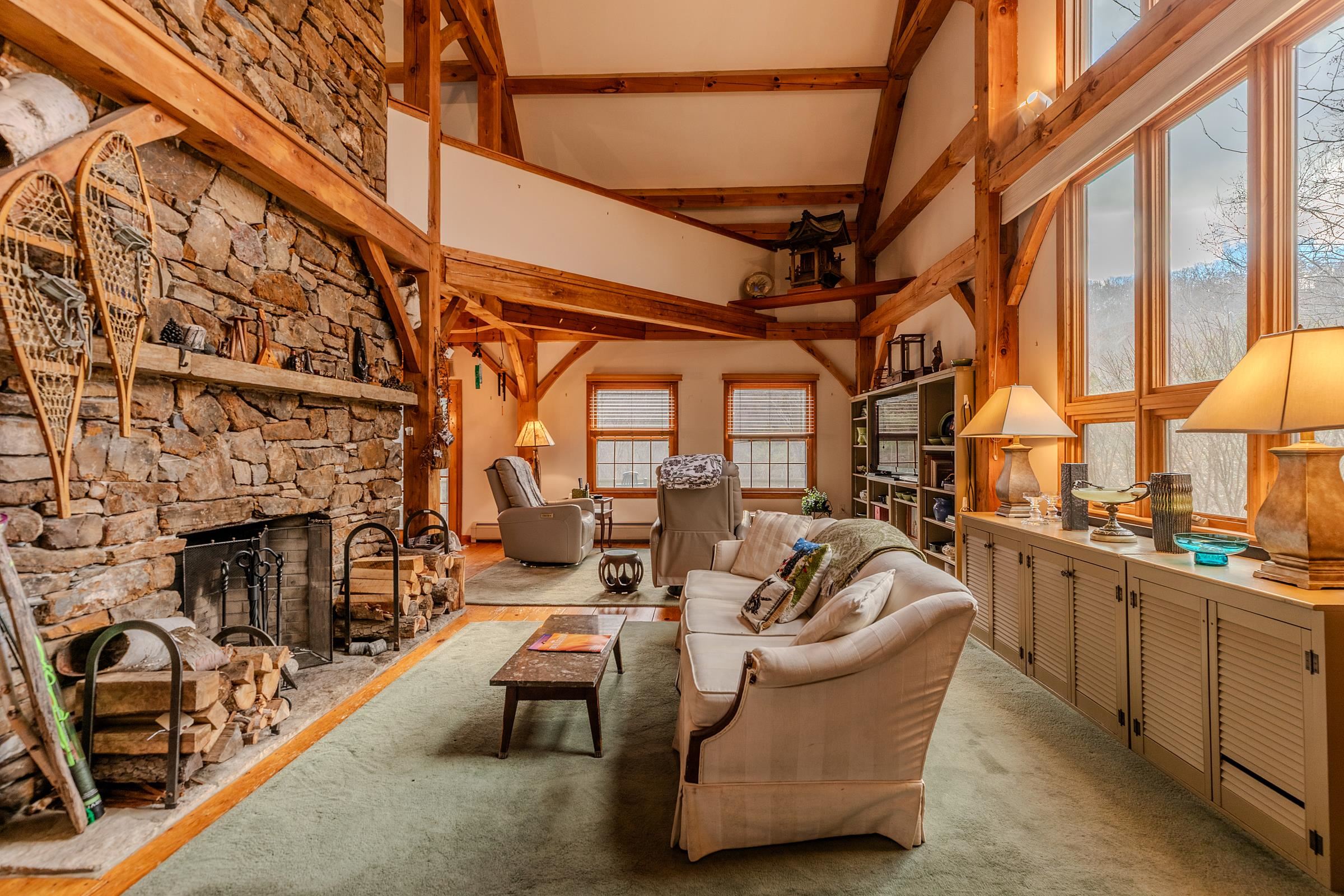 Private, Quiet, and Solidly built timeless Post & Beam 2, 200 SF residence on 10.05 acres offering South and Westerly sunlight all day long ending with lovely sunsets! Overlooking a spring fed pond and a mix of open terrain and deciduous slope side forest with trails. The house offers main level all open 40' X 32' great room living / dining/ kitchen with a massive center 2.5 story stone fireplace. Wonder up the cherry staircase to a lovely loft 23' X 15' that suffices as another seating area or office... there's two bedrooms and bath. The third level offers a sizable overflow room or BR. Lower walk-out room is currently the primary suite with slate floor, 3/4 bath and spacious office sitting room that closes off with pocket doors. The 30.5' X 19' storage room above the 2 bay attached garage has direct access from the mudroom. Great for an artist studio, gym/yoga space, bunk room or guest over flow. Step outside to enjoy a spacious deck, and a patio complete with a relaxing hot tub—perfect for unwinding or entertaining guests. House includes a full-house generator for uninterrupted comfort. Ideal as a full-time residence, mountain escape, or remote work sanctuary, this property offers limitless possibilities for those seeking beauty, solitude, and craftsmanship that stands the test of time.