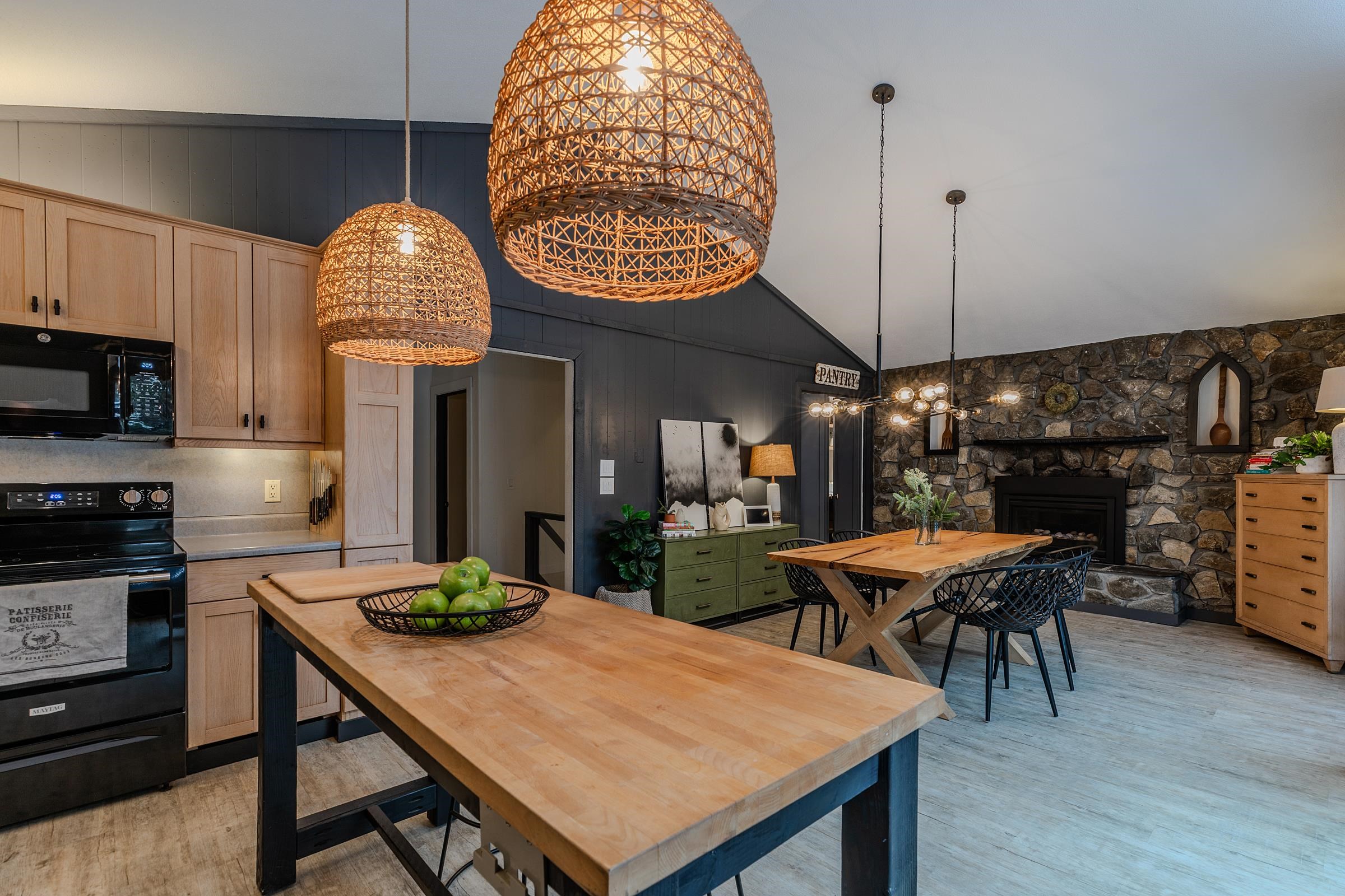 - Cathedral Ceiling, Dining Area, Gas Fireplace, Wood Fireplace, 3+ Fireplaces, Home Theater Wiring, Kitchen/Dining, Kitchen/Living, LED Lighting, Natural Light, Natural Woodwork