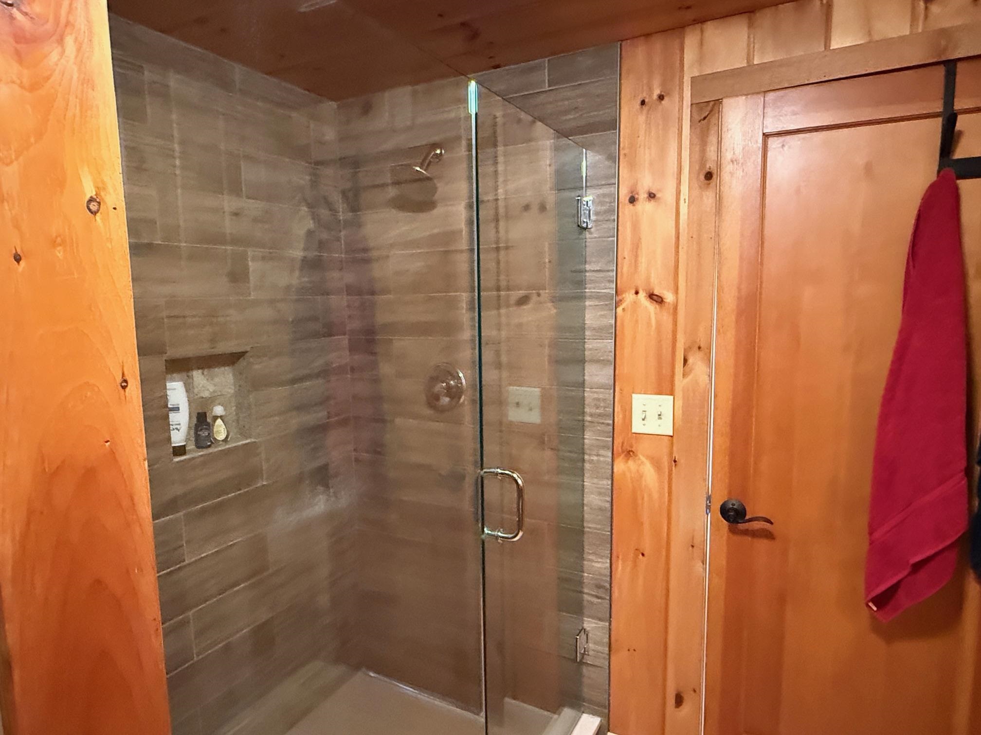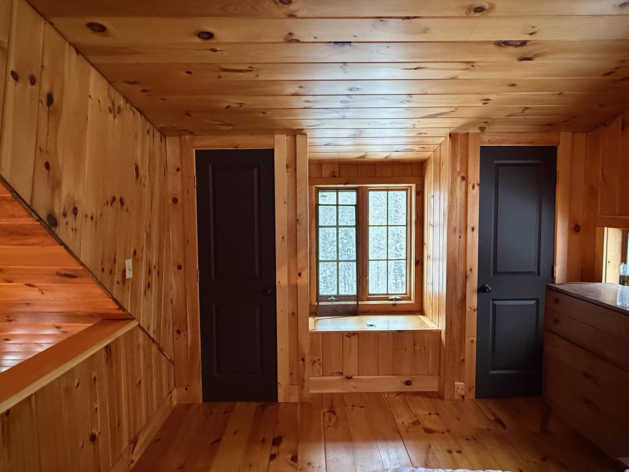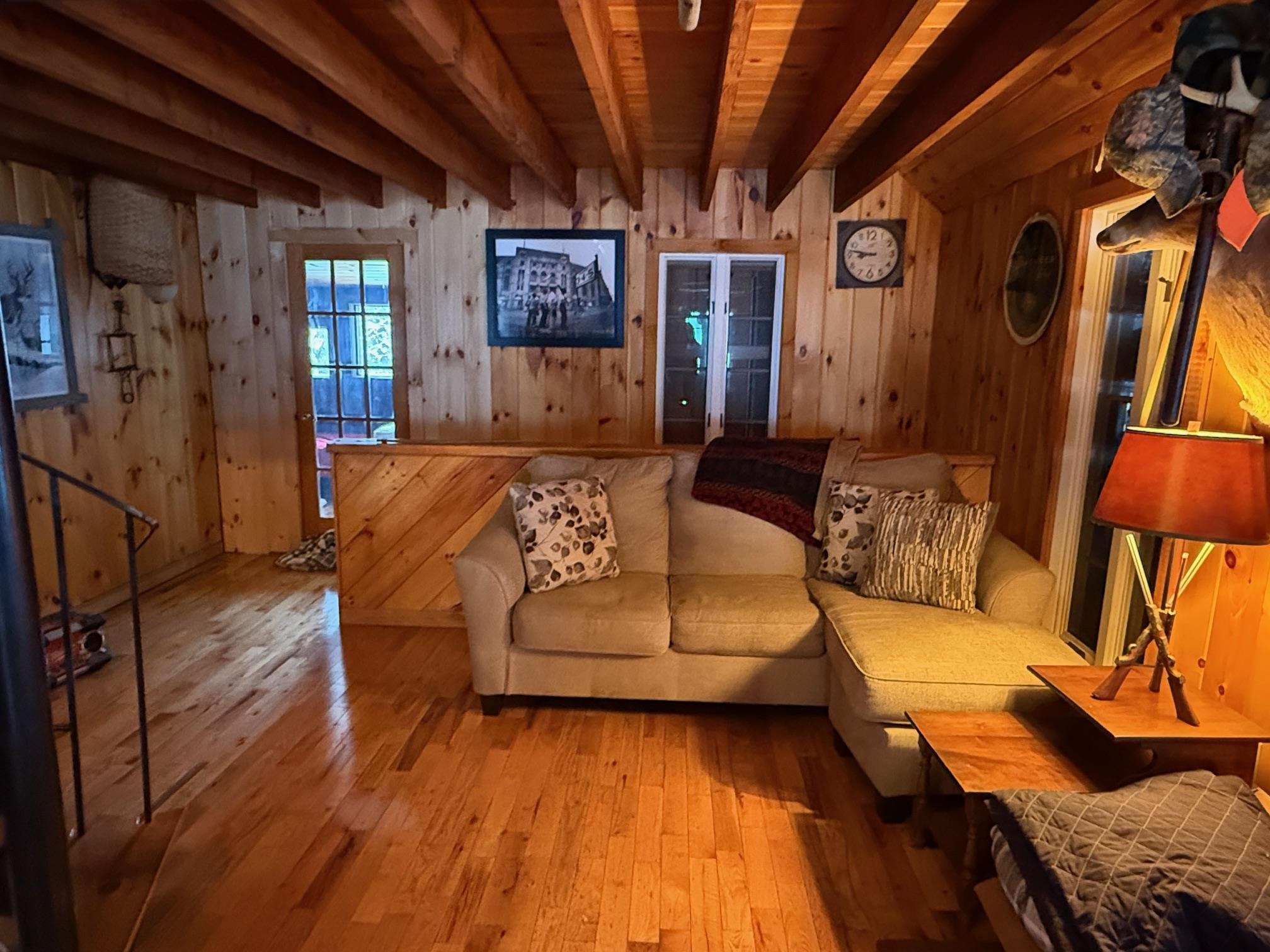 Charming Adirondack-style home set on 2.5 private acres, offering a warm, rustic aesthetic with thoughtful updates throughout. The main level features wood floors, an open cathedral ceiling with exposed beams, and a cozy woodstove anchoring the living space. The kitchen is ideal for entertaining with a large bar area, live-edge countertops, and an inviting open layout. An updated bathroom with a tiled walk-in shower adds modern comfort. A spacious bedroom loft with two closets overlooks the main living area, while the lower walkout basement includes a bunk room, perfect for guests or flexible living space. Outdoor enjoyment is enhanced by a large screened-in porch, deck, and sunroom, ideal for relaxing in every season. Conveniently located near Mount Snow for downhill skiing and Prospect Mountain for cross-country skiing, this home is perfect as a full-time residence or Vermont getaway.