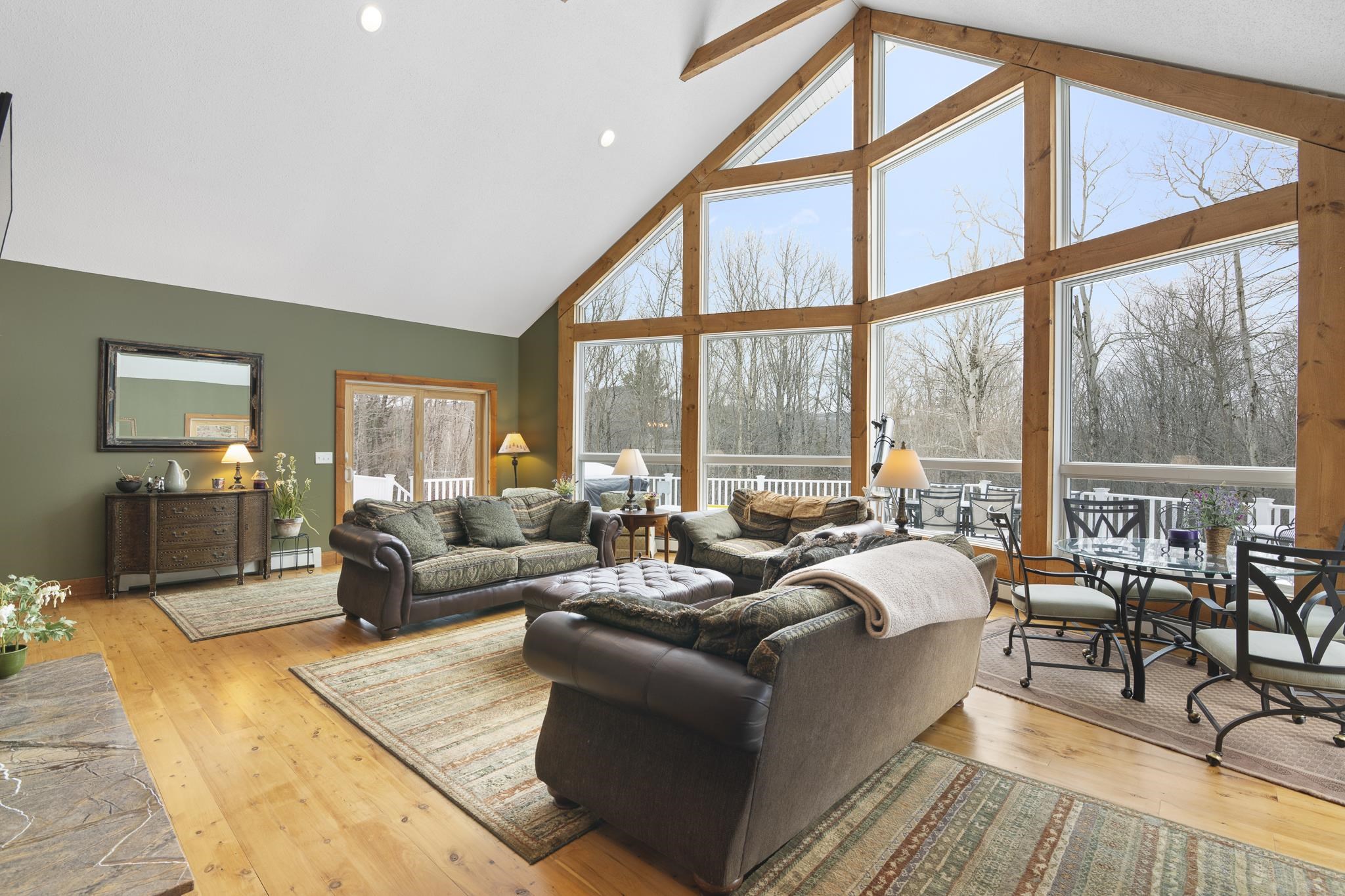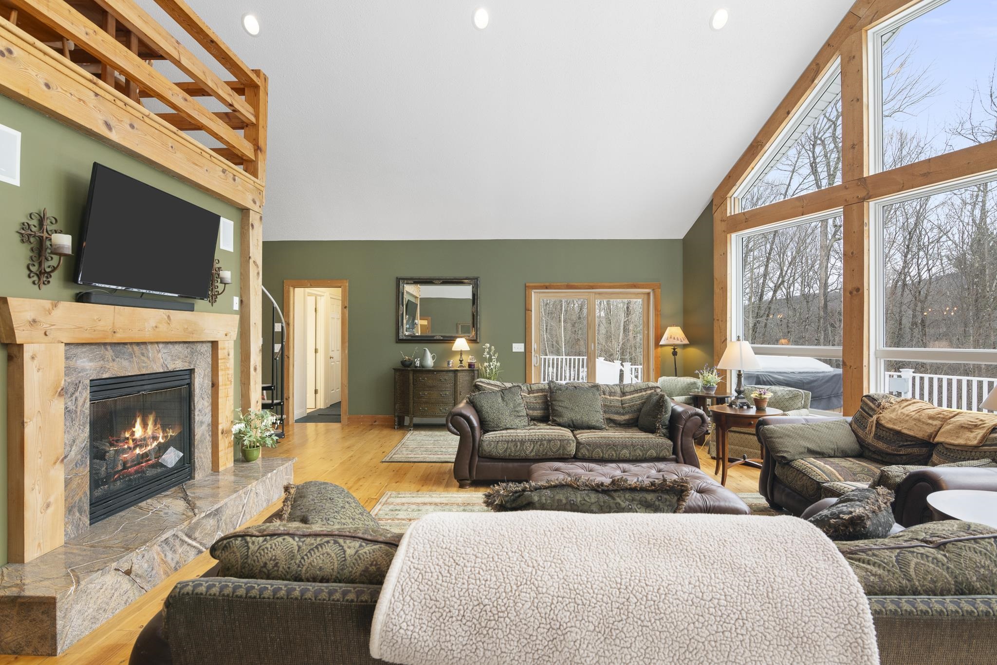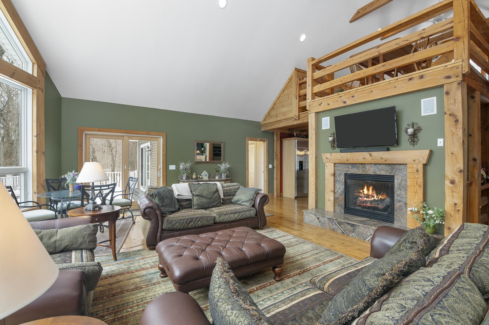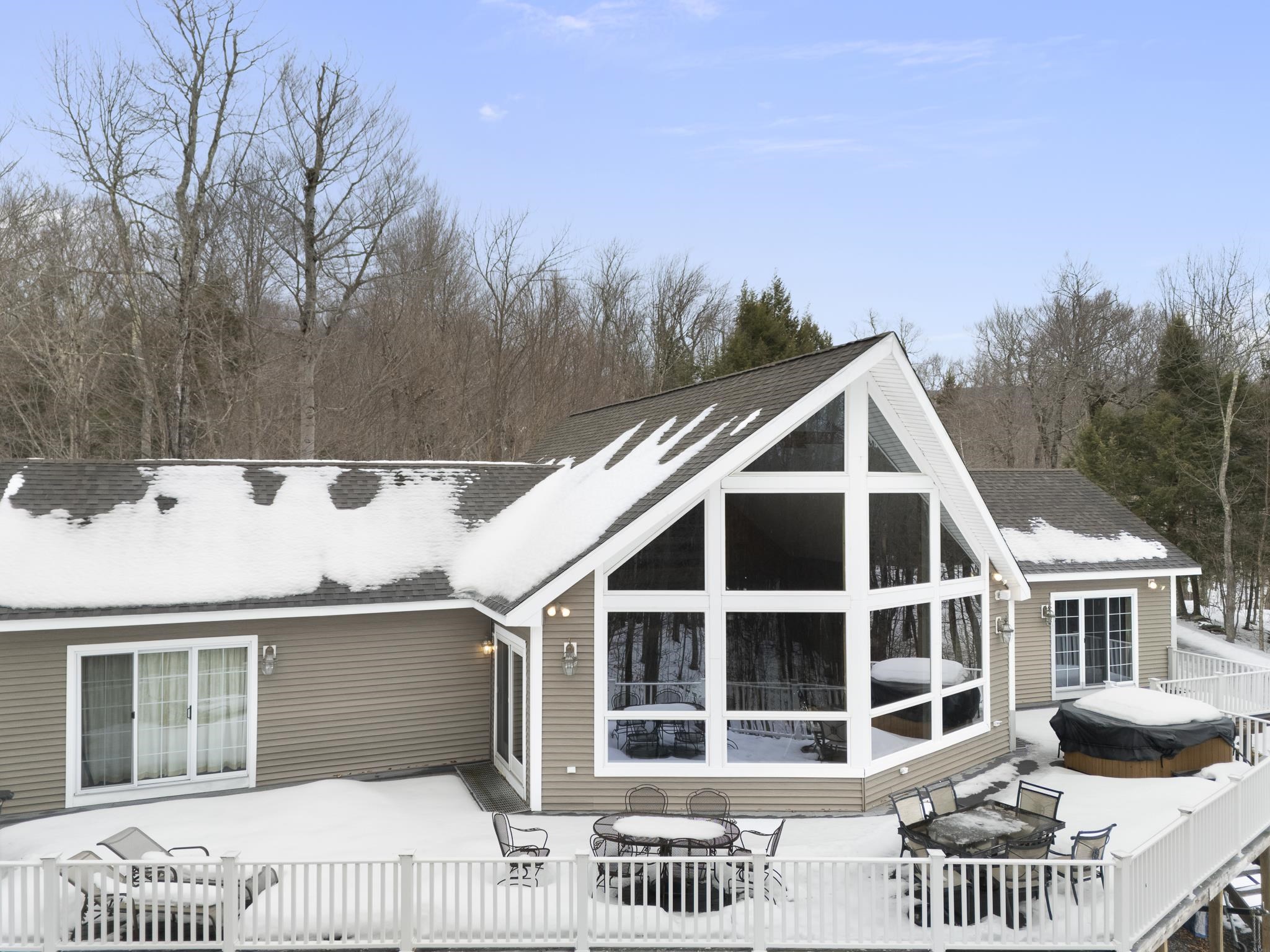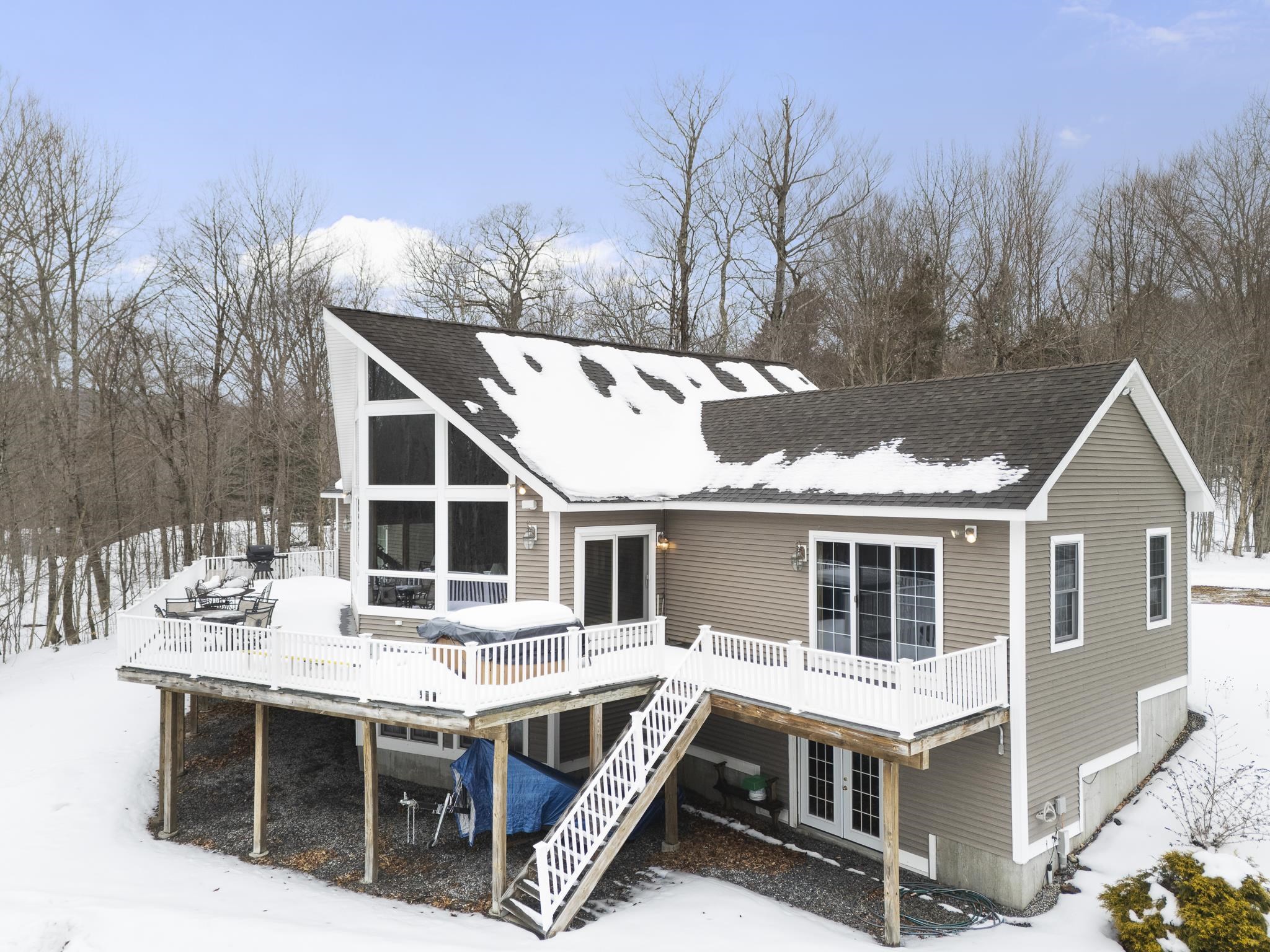 Tucked away on 6 private acres in Dover, Vermont, this beautifully crafted 4-bedroom, 4-bath home offers the perfect blend of rustic charm, comfort, and space for year-round enjoyment. A dramatic great room with soaring ceilings, exposed timber framing, a stone fireplace, and a wall of windows creates a warm and inviting gathering space filled with natural light and woodland views. The open-concept layout flows seamlessly into a well-appointed kitchen and dining area, ideal for entertaining family and friends after a day on the slopes or trails. Multiple levels of living space provide both privacy and flexibility, including a spacious lower-level game and media room complete with a bar area and pool table perfect for hosting or relaxing. Step outside to expansive decks overlooking the peaceful, wooded setting, offering plenty of room for outdoor dining, soaking in the hot tub, or simply enjoying the quiet Vermont landscape. A detached two-car garage provides great storage for vehicles and recreational gear. Ideally located just minutes to Mount Snow, snowmobile trails, hiking, and all the attractions of the Deerfield Valley, this property is a perfect Vermont retreat whether for a full-time residence, second home, or investment property.