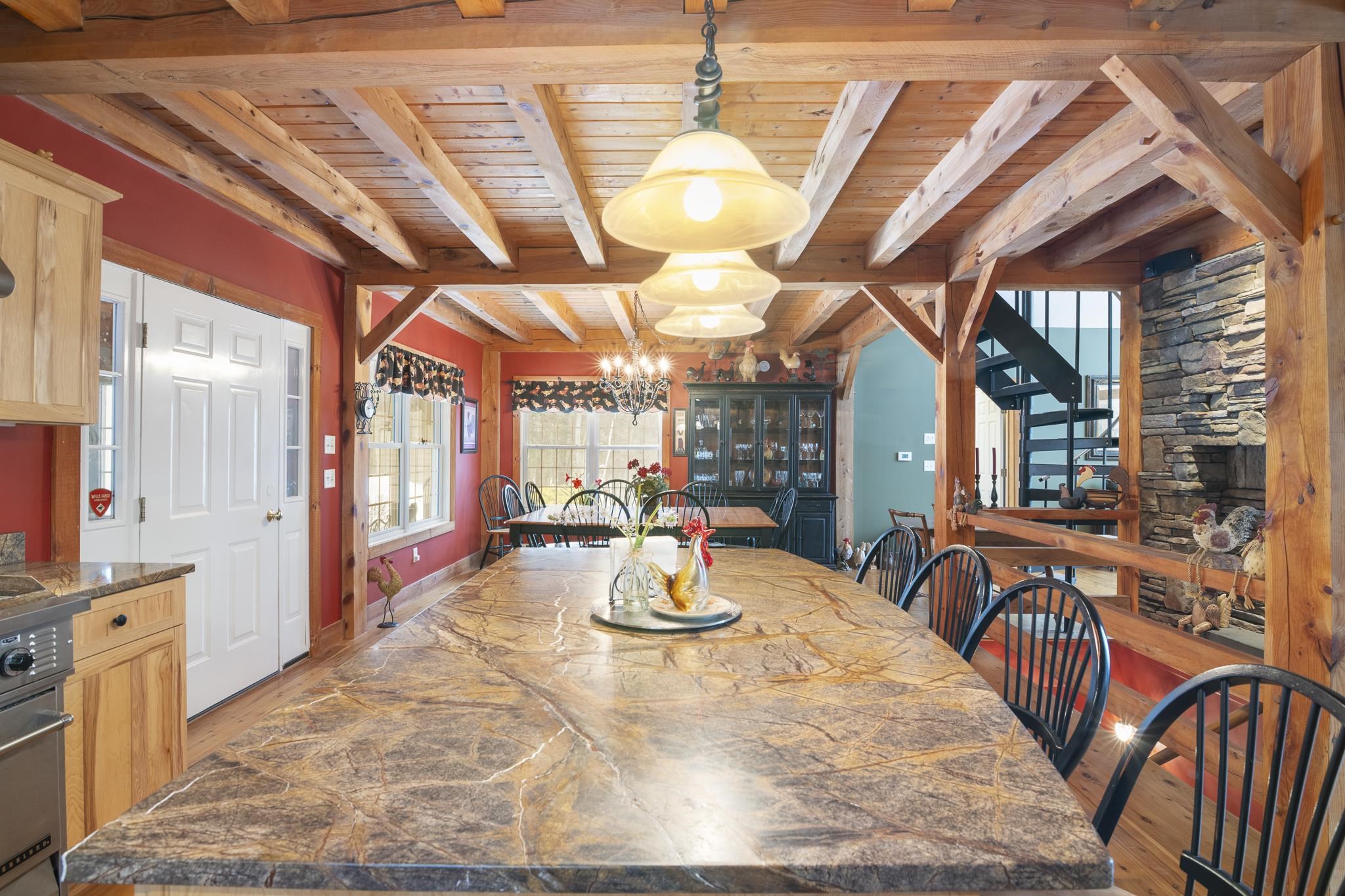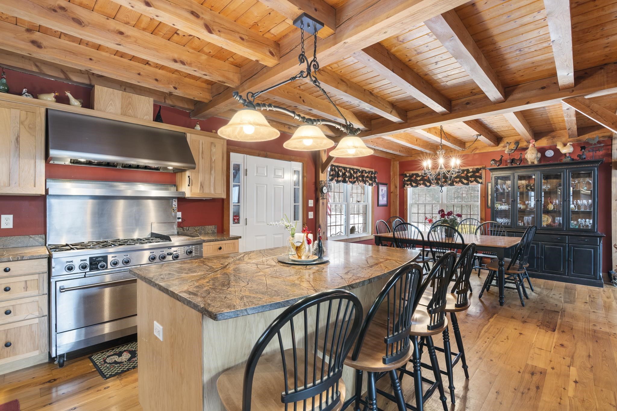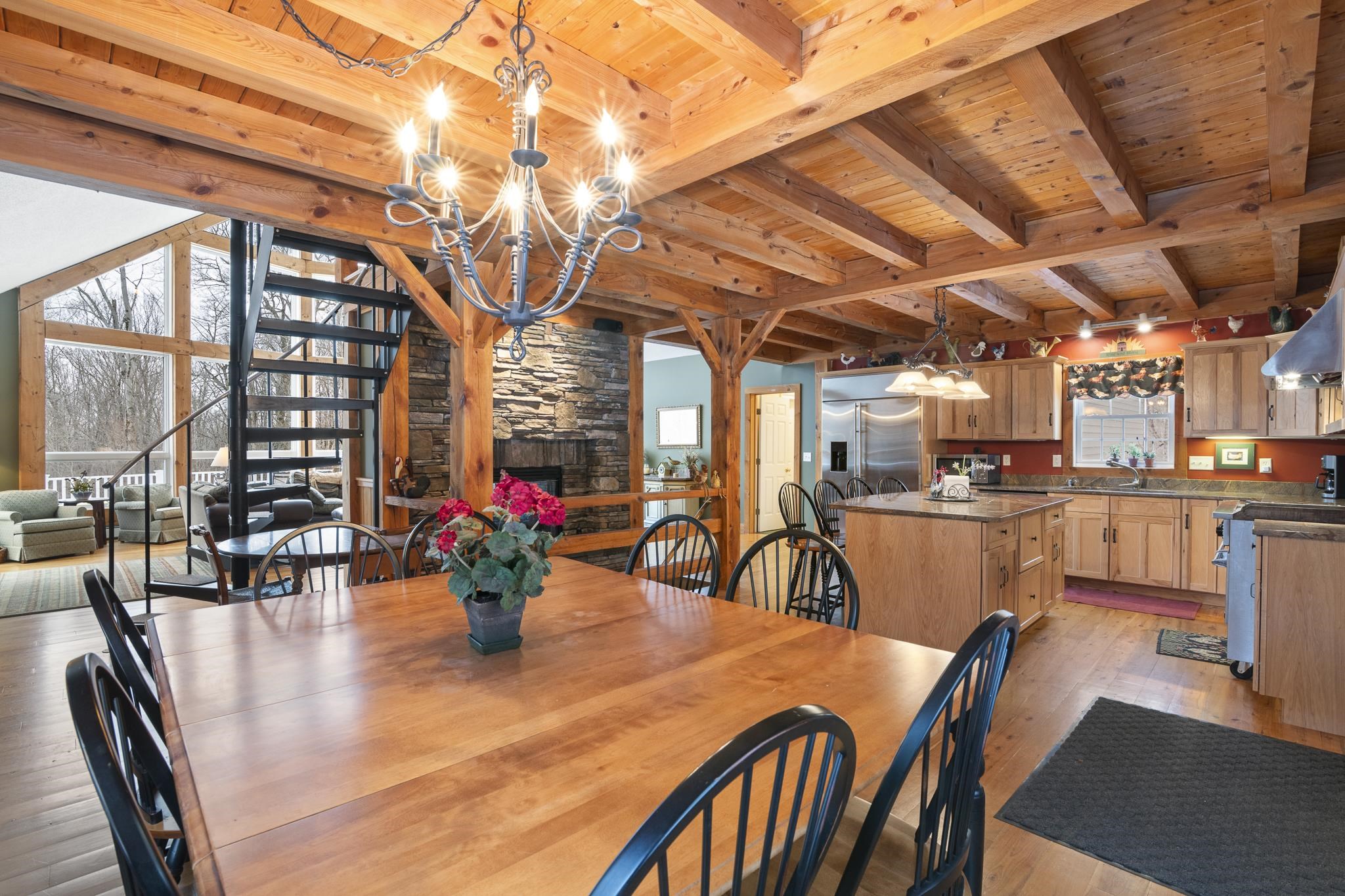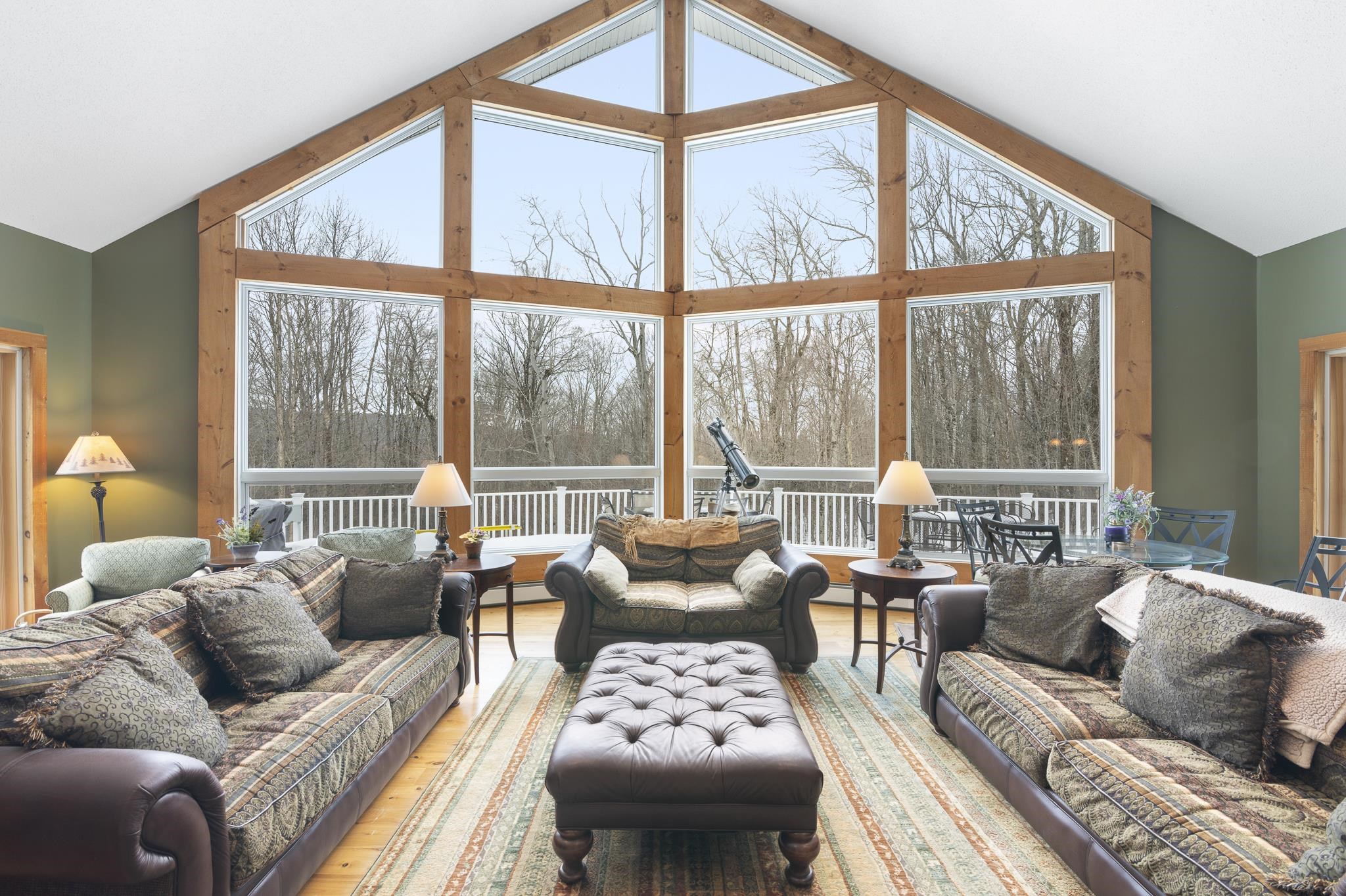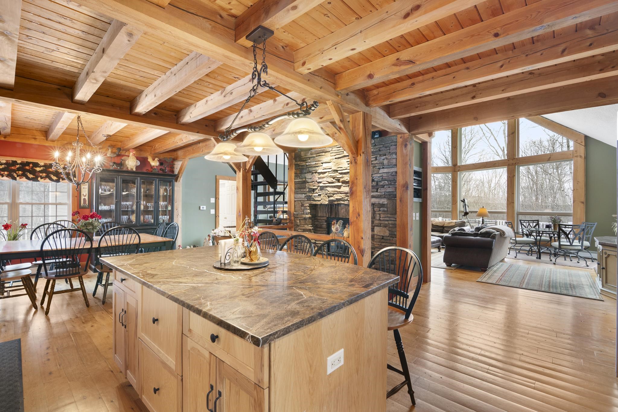 Tucked away on 6 private acres in Dover, Vermont, this beautifully crafted 4-bedroom, 4-bath home offers the perfect blend of rustic charm, comfort, and space for year-round enjoyment. A dramatic great room with soaring ceilings, exposed timber framing, a stone fireplace, and a wall of windows creates a warm and inviting gathering space filled with natural light and woodland views. The open-concept layout flows seamlessly into a well-appointed kitchen and dining area, ideal for entertaining family and friends after a day on the slopes or trails. Multiple levels of living space provide both privacy and flexibility, including a spacious lower-level game and media room complete with a bar area and pool table perfect for hosting or relaxing. Step outside to expansive decks overlooking the peaceful, wooded setting, offering plenty of room for outdoor dining, soaking in the hot tub, or simply enjoying the quiet Vermont landscape. A detached two-car garage provides great storage for vehicles and recreational gear. Ideally located just minutes to Mount Snow, snowmobile trails, hiking, and all the attractions of the Deerfield Valley, this property is a perfect Vermont retreat whether for a full-time residence, second home, or investment property.