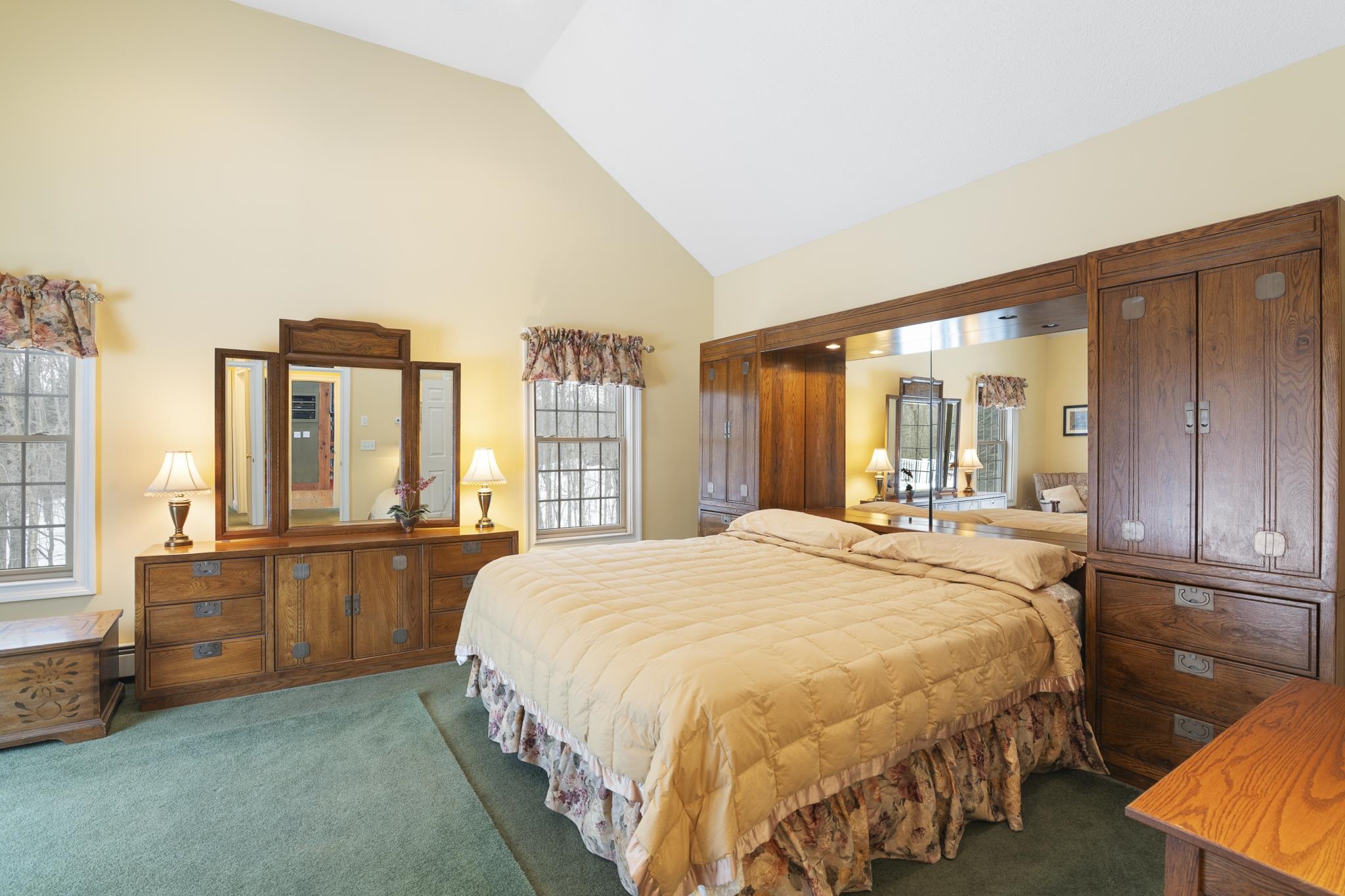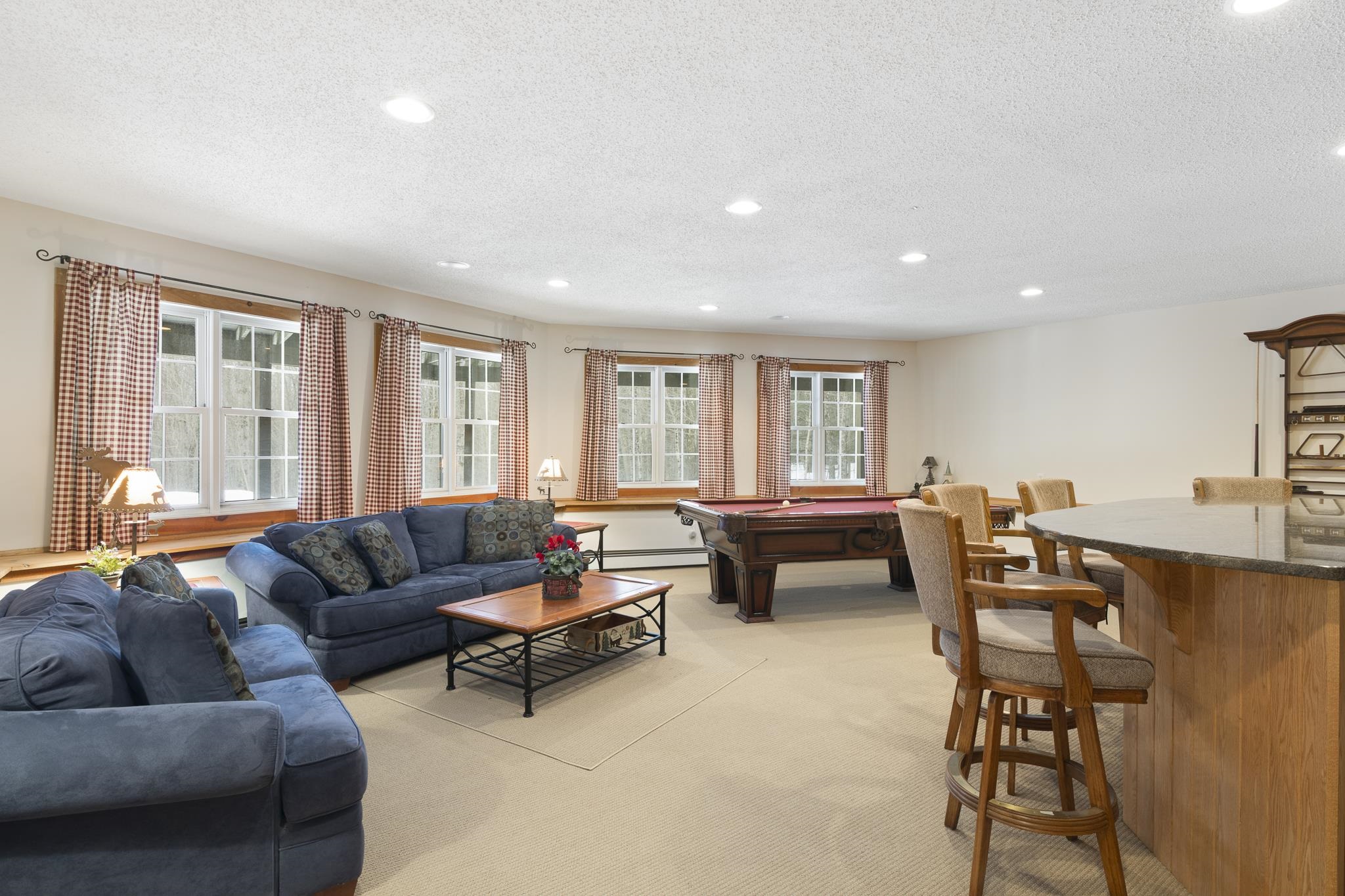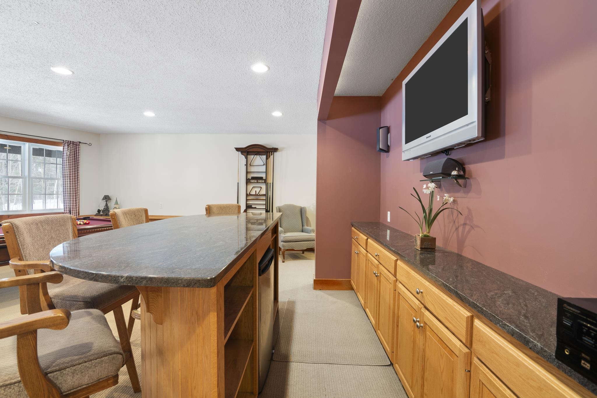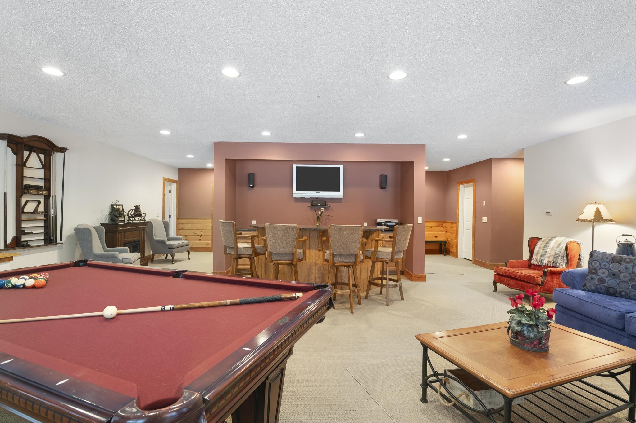 - Bar, Cathedral Ceiling, Dining Area, Gas Fireplace, 1 Fireplace, Furnished, Kitchen Island, Kitchen/Dining, Primary BR w/ BA, Natural Light, Natural Woodwork, Soaking Tub, Vaulted Ceiling, Walk-in Closet, Wet Bar, Basement Laundry