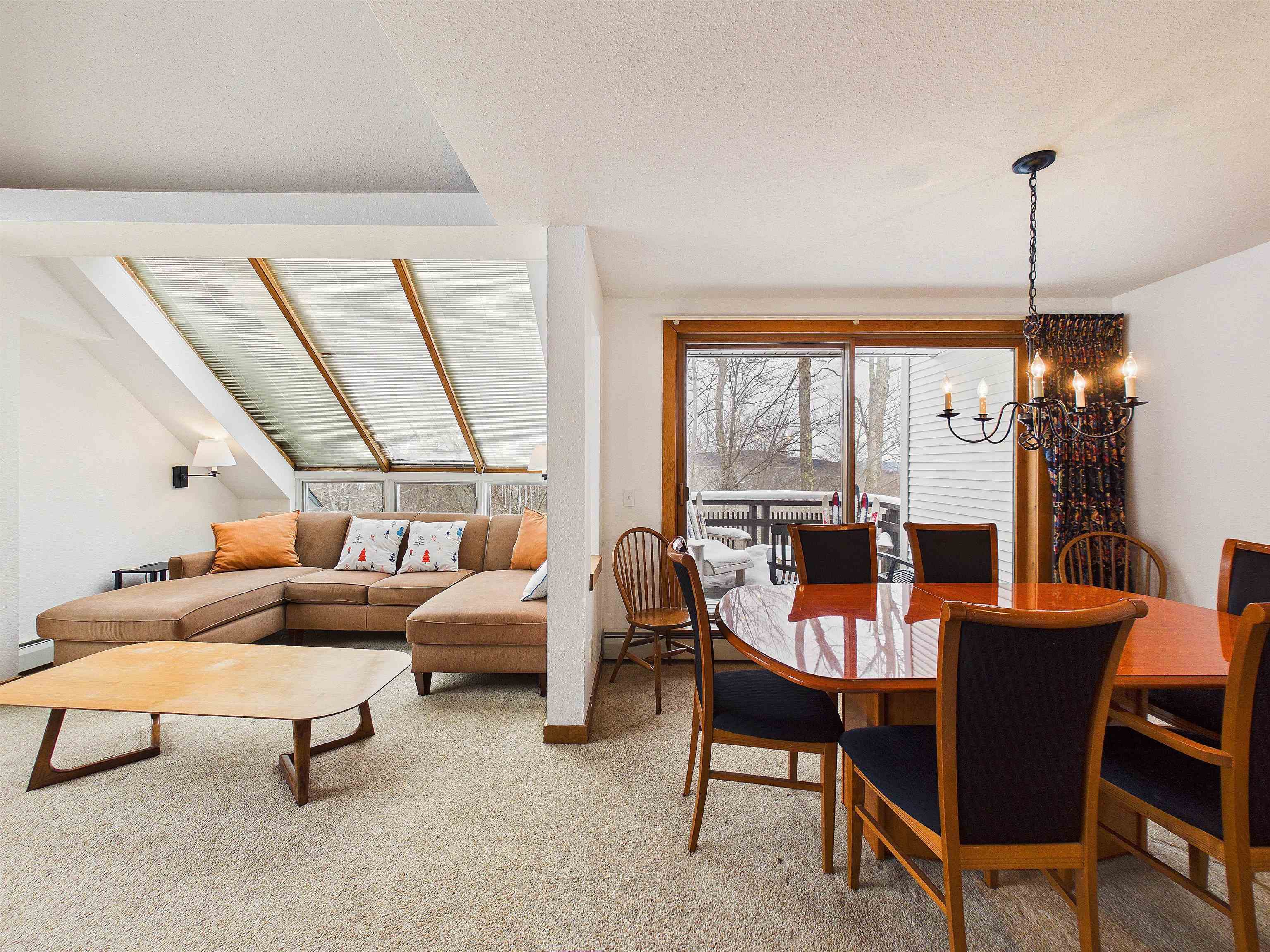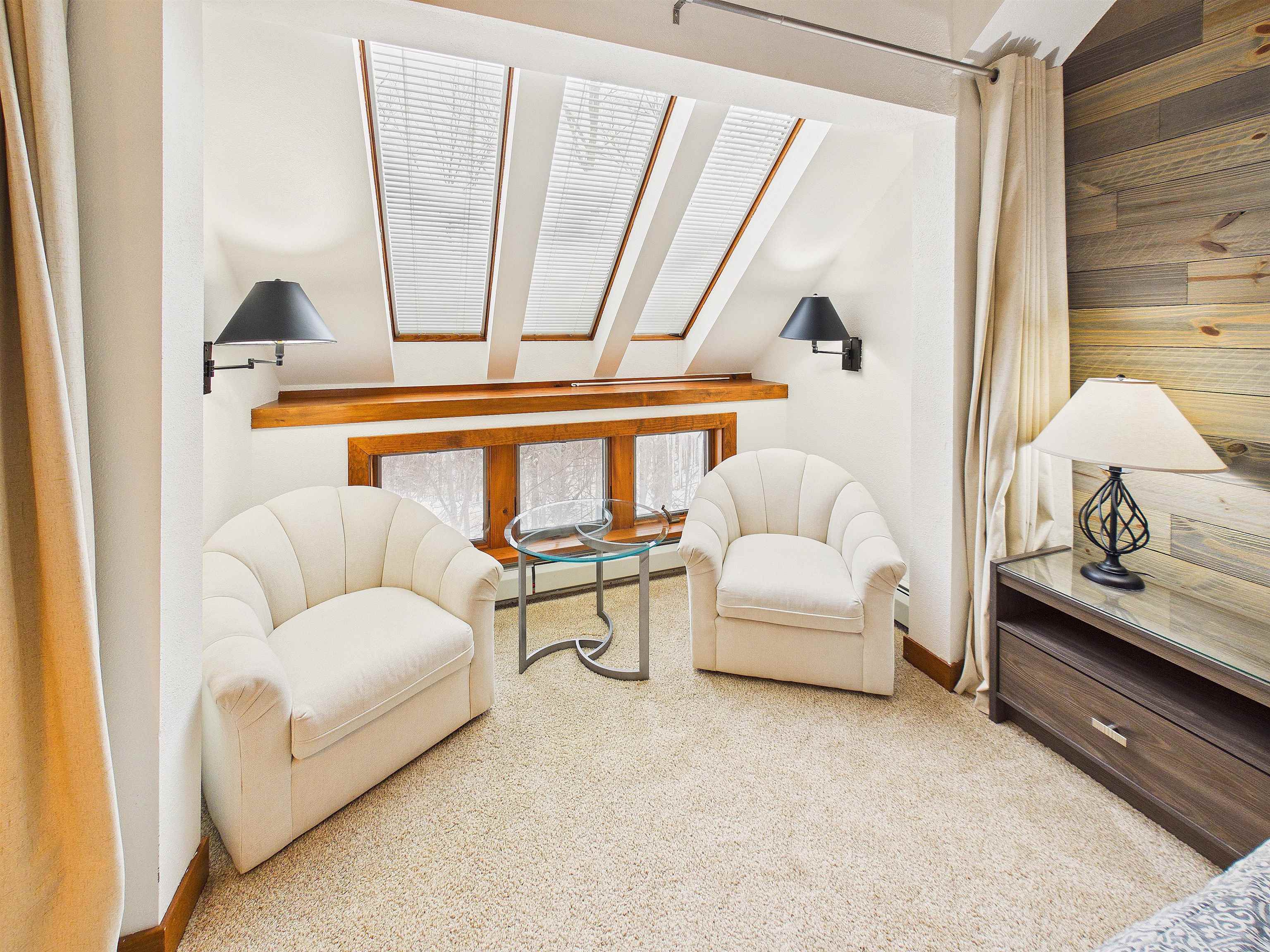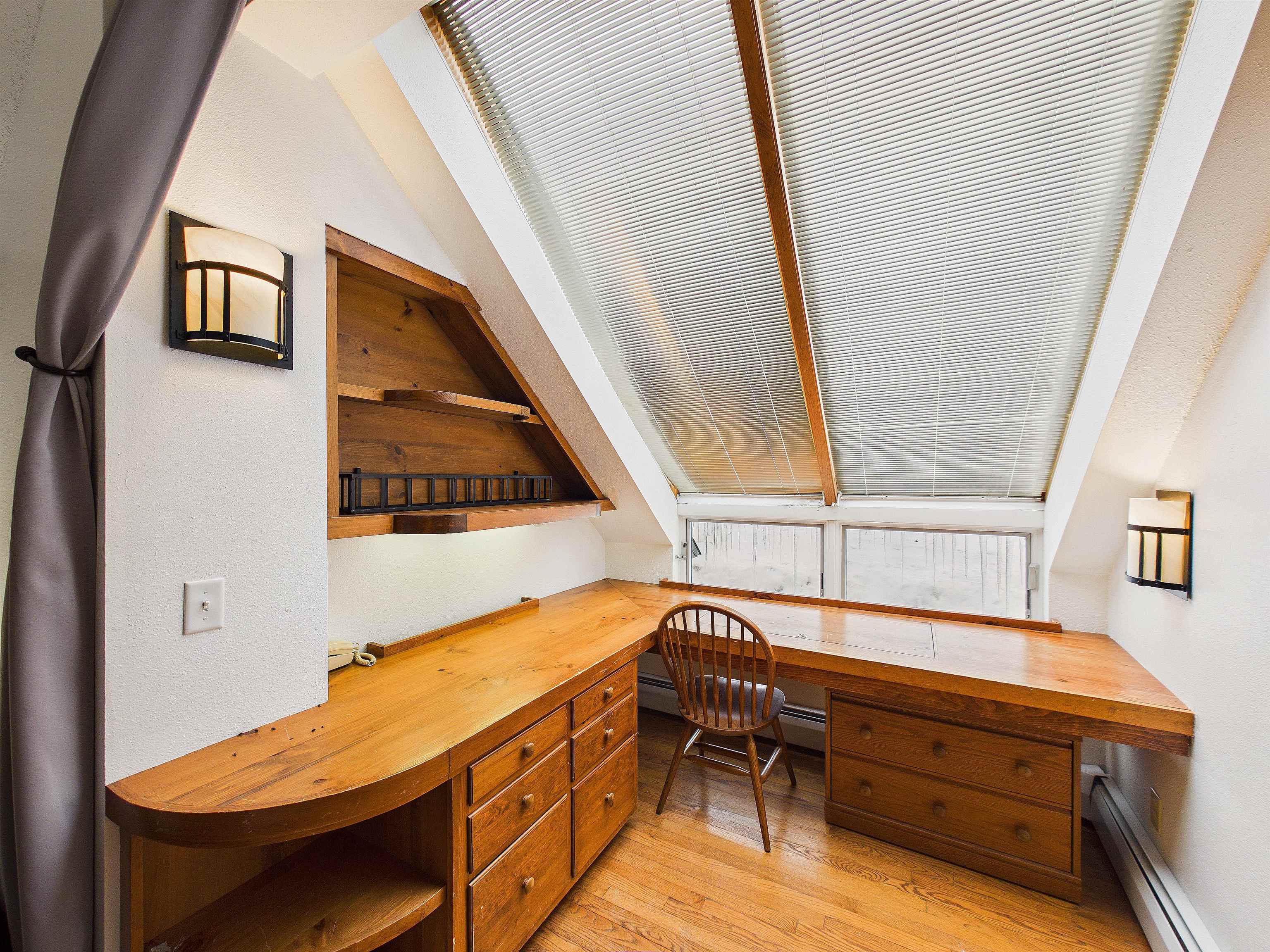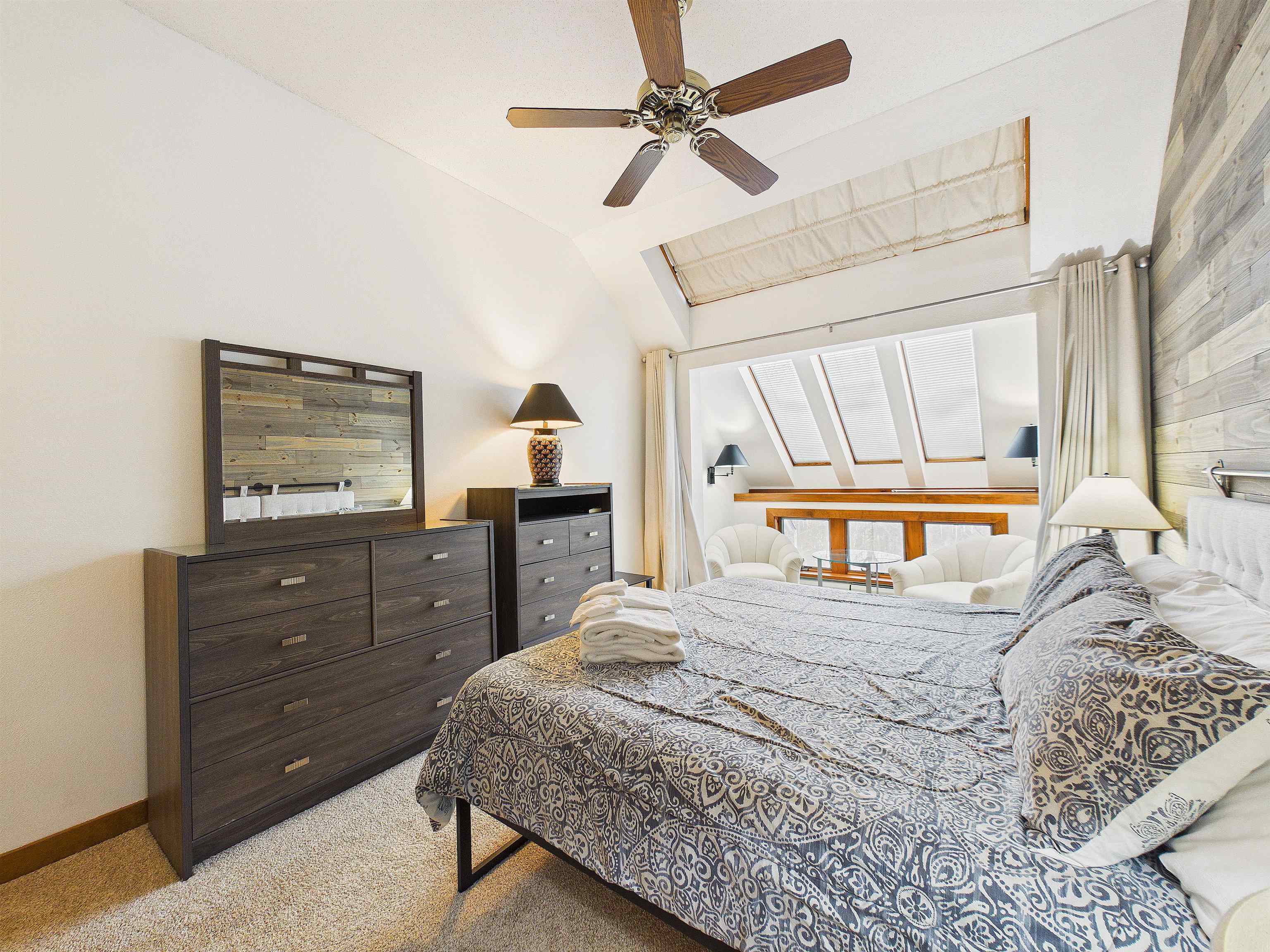 - Blinds, Ceiling Fan, Dining Area, Fireplace Screens/Equip, Wood Fireplace, 1 Fireplace, Furnished, Kitchen/Living, Living/Dining, Primary BR w/ BA, Natural Light, Skylight, Basement Laundry