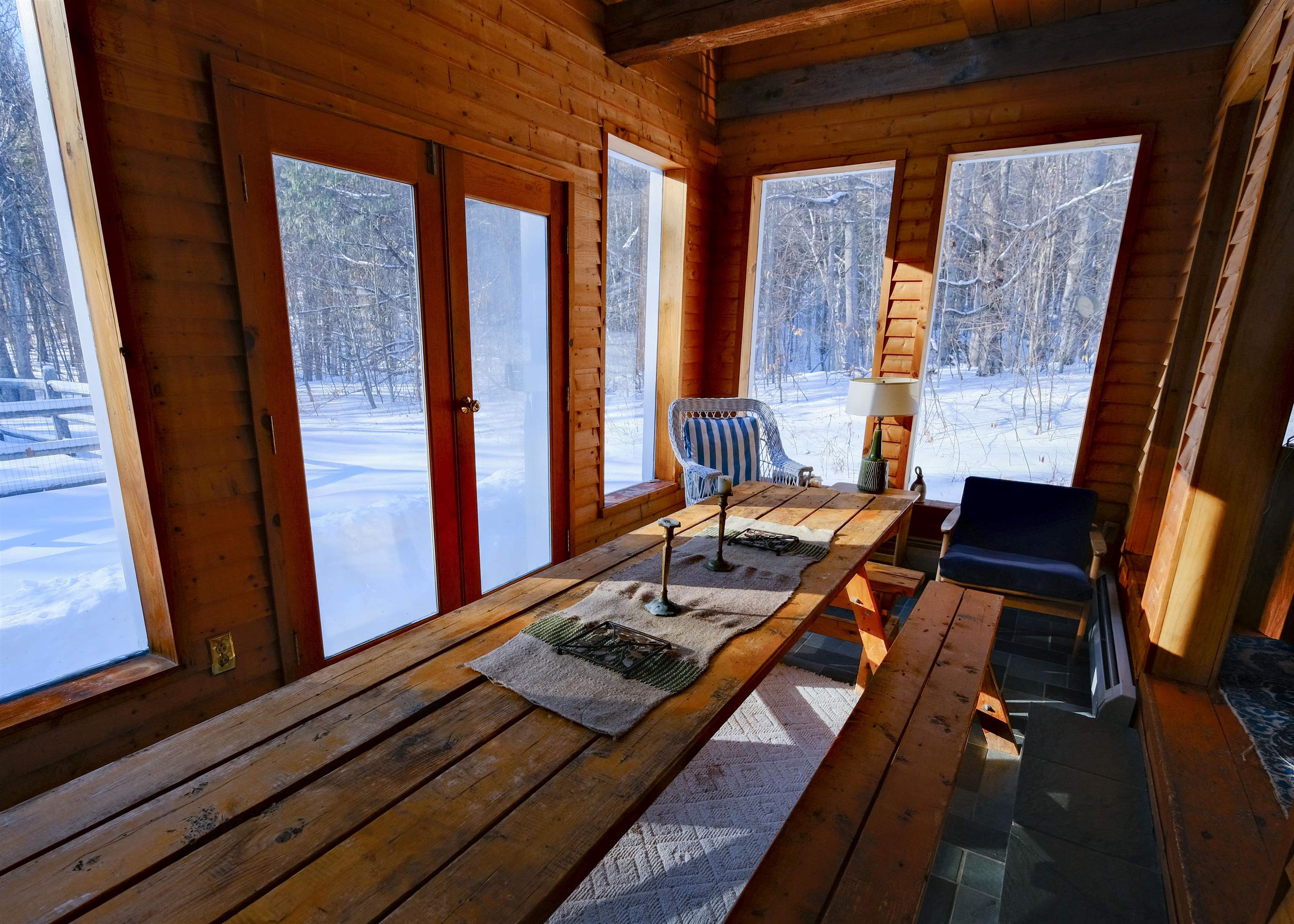 - Ceiling Fan, Dining Area, Furnished, Hearth, Kitchen/Dining, Kitchen/Living, Living/Dining, Primary BR w/ BA, Natural Light, Natural Woodwork, Skylight, Indoor Storage, Vaulted Ceiling, Window Treatment, Wood Stove Hook-up, 1st Floor Laundry