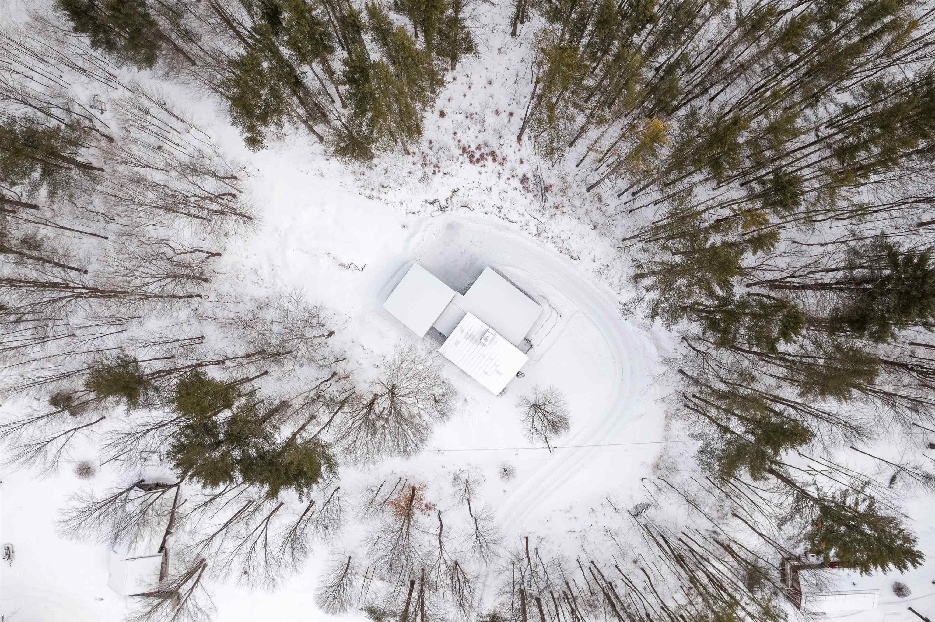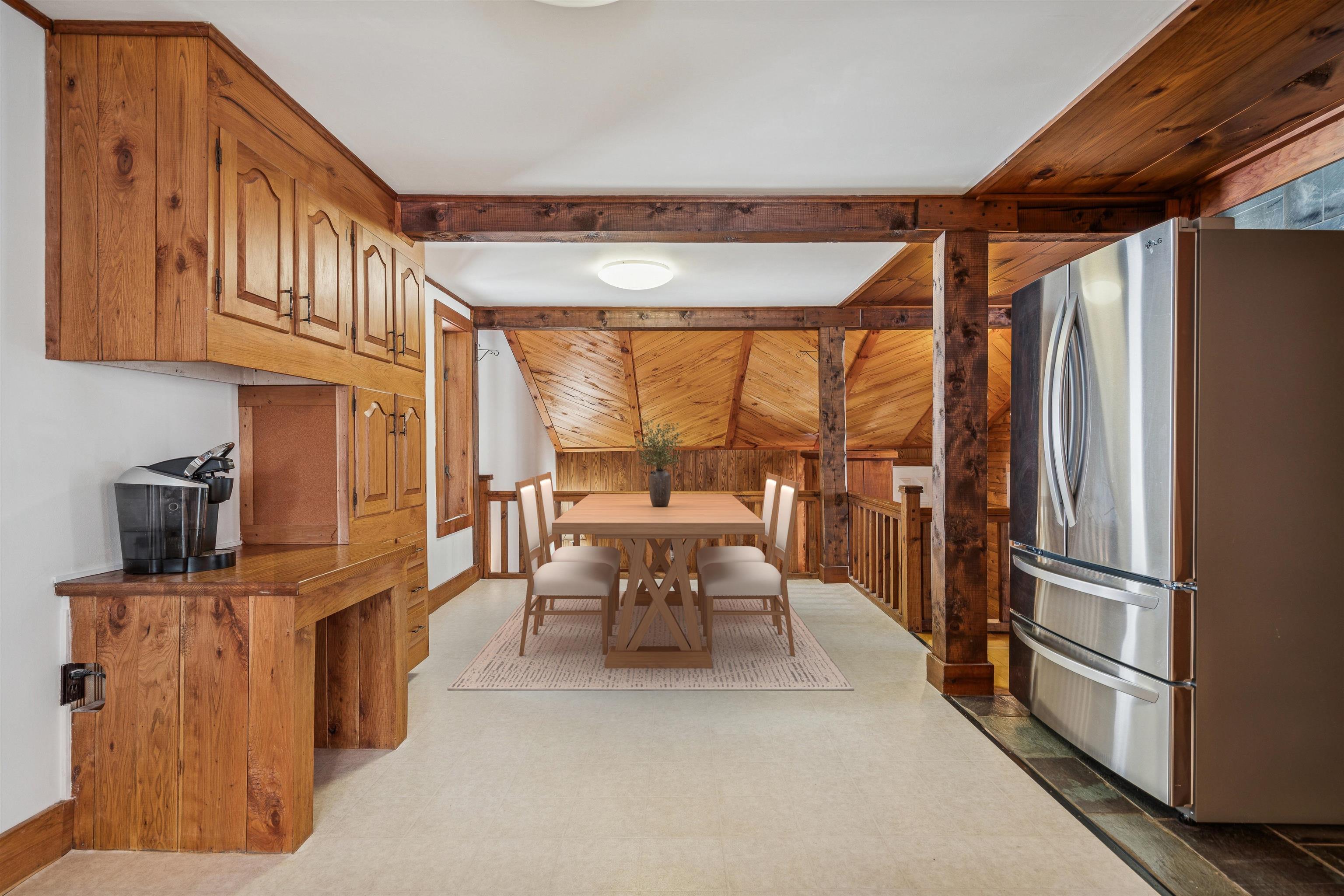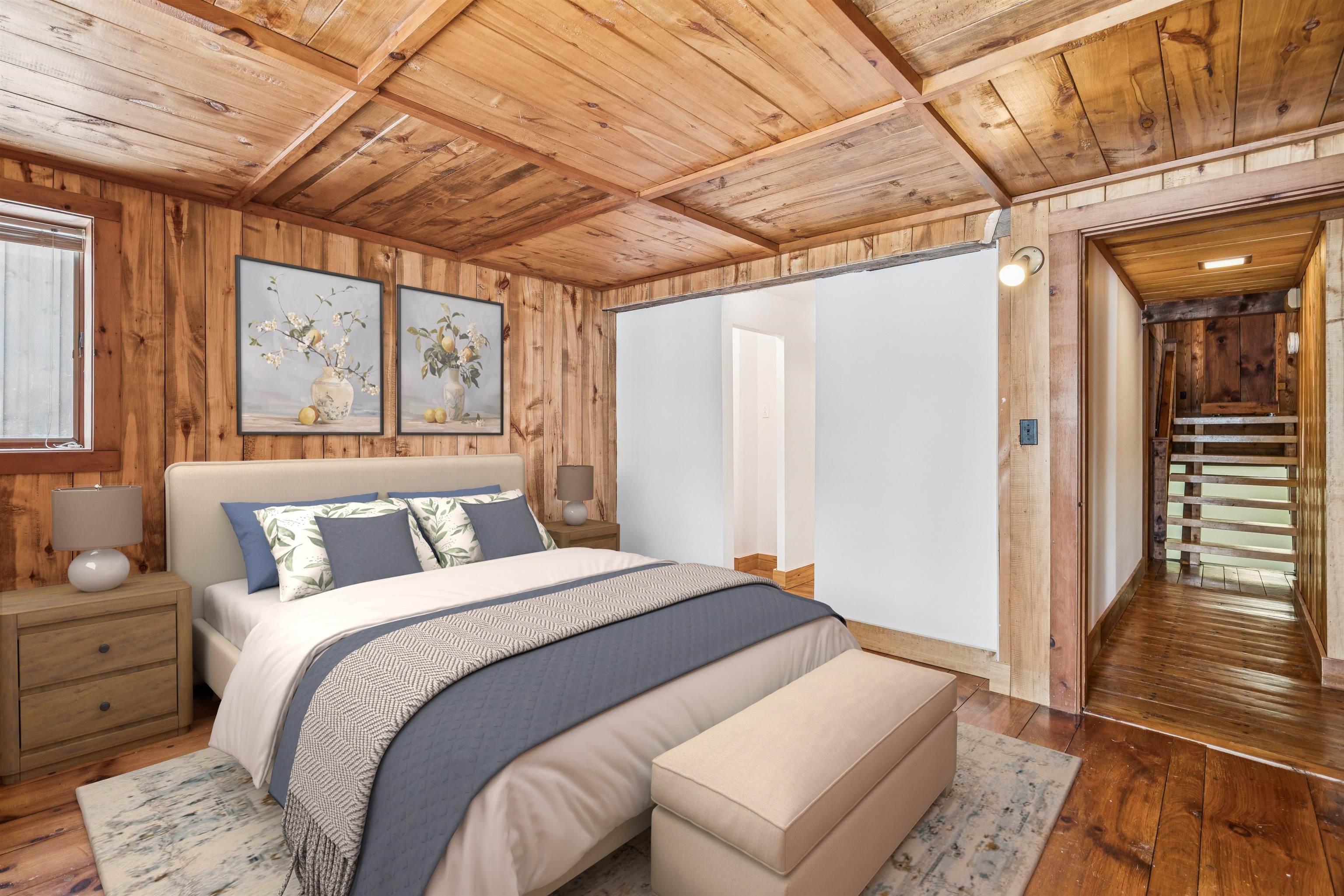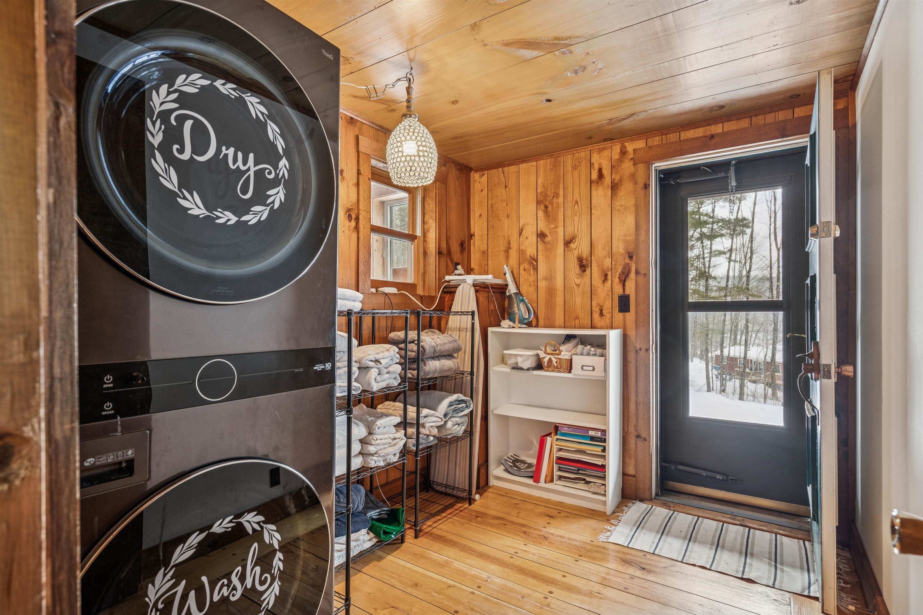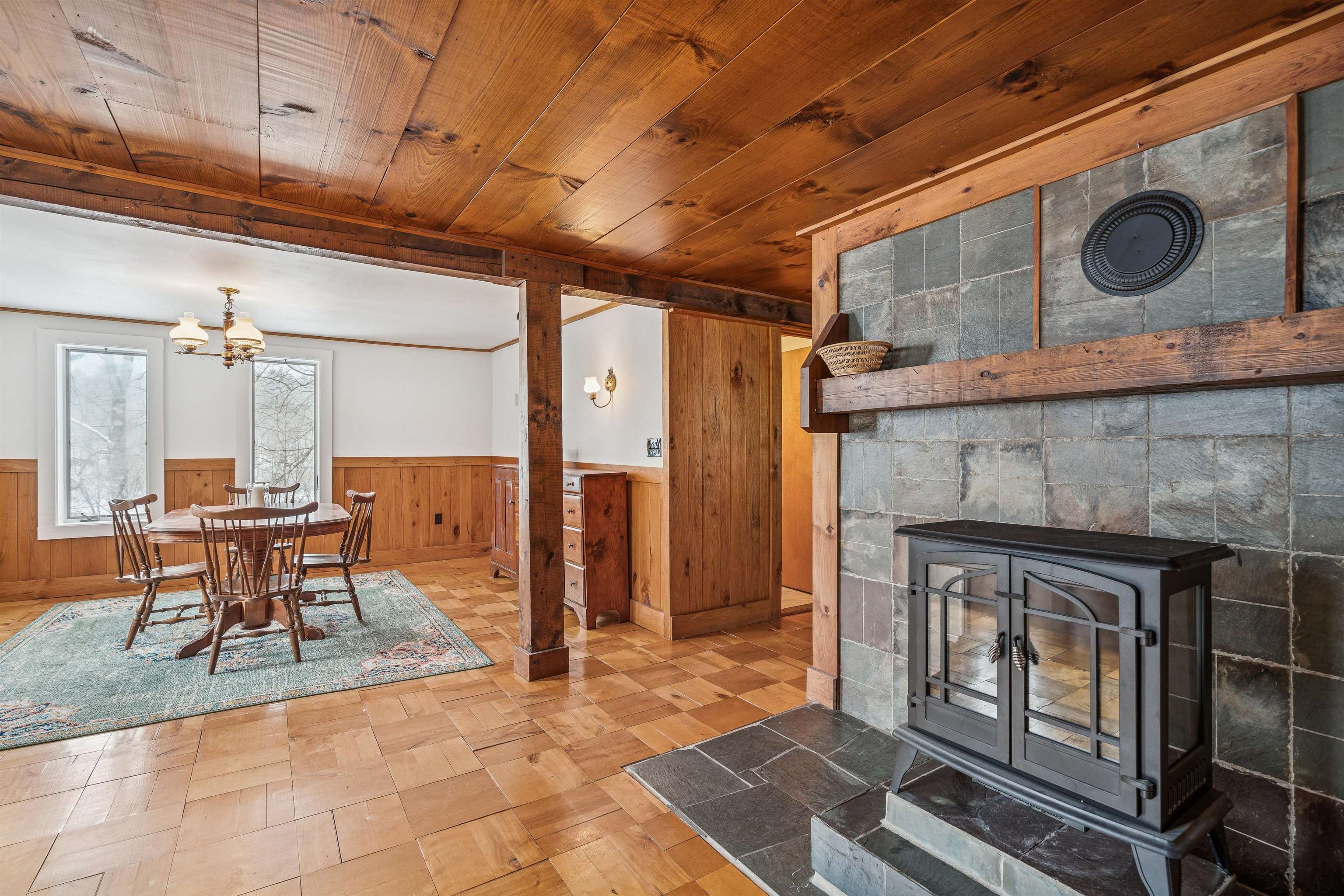 Inspired by the organic architecture of Frank Lloyd Wright, this contemporary gem sits on 14.2 surveyed wooded acres. It feels private yet is less than 10 minutes to Woodstock. The interior has a warm, open floor plan rich with wood character and natural light. Recent upgrades include renovated bathrooms, highlighted by a newly added third bath as an ensuite from the primary bedroom featuring a custom-tiled walk-in shower and oversized vanity. Easily accessible laundry, new carpet in the playroom, upgraded refrigerator dishwasher are just some of the upgrades. Extensive tree work was done to keep the forest healthy. Enjoy the sun-drenched solarium/greenhouse or relax on the side porch and look at the sunset. With a massive attic above the garage that could be potentially finished, and a full cement basement with storage rooms well suited to be a workshop the expansion possibilities are endless.