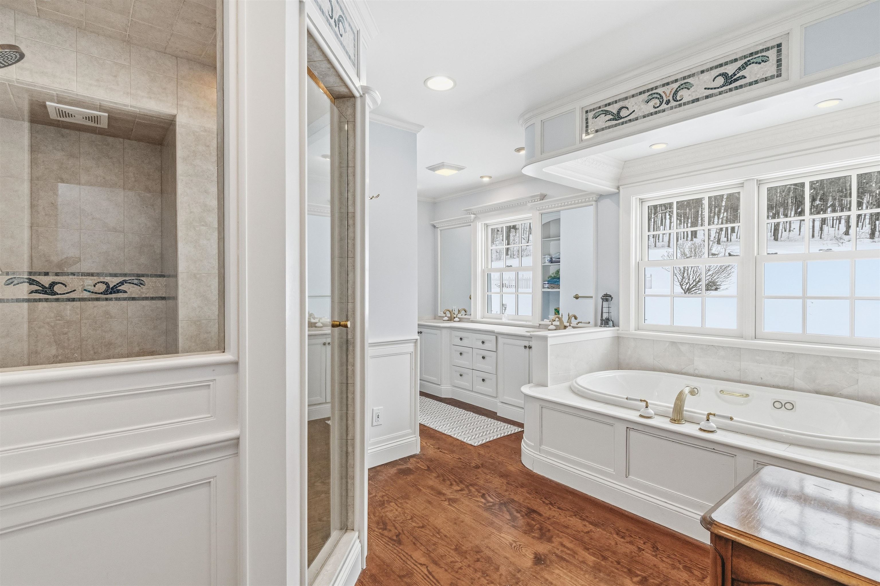 Located two minutes from highly desirable Waterbury Village, this beautifully maintained home on 20+ acres blends luxury, privacy, and convenience. This 4000+ sf, four-bedroom, 3 full bath home checks all the boxes for your primary or home away. A custom-tiled, radiantly-heated great room crowned with cathedral ceilings, skylights, and oversized Pella windows greets visitors with natural light and beautiful views of the surrounding woods. Outfitted for entertaining, the chef’s kitchen offers two islands, two ovens and sinks, a gas range, and dual breakfast bars. A hearth area next to the kitchen with a wood-burning fireplace provides a cozy space for warmth and conversation. Hardwood floors run throughout the main living spaces. The main floor boasts a den with a Hearthstone stove and continues into a large family room with an oversized fireplace. A private office adjacent to the living areas provides plenty of space for a work-from-home lifestyle. The first floor finishes with a full bath with a shower and a converted laundry/mudroom area with tons of storage space for ski/snowboard equipment. Upstairs, the master bedroom boasts hardwood floors, a third wood-burning fireplace, two walk-in closets for easy organization, one of which could be reconverted into the fourth bedroom or nursery. The luxurious master bathroom provides a step-in shower and a jetted soaking tub accented with custom mosaic tile trim overlooking wooded property. You’ll find an oversized bedroom that flows into a study area, a second bedroom and a full bathroom. At the end of the open hallway lies the large owner’s suite with a luxurious master suite. Step outside to a manicured landscape with a wraparound porch leading to a heated in-ground pool, an ideal setting for summer relaxation, alfresco dining, or stargazing. A two-level, two car garage was built recently with unfinished space for future living space or in-law suite. The acreage offers privacy, elevated views, and room to roam.