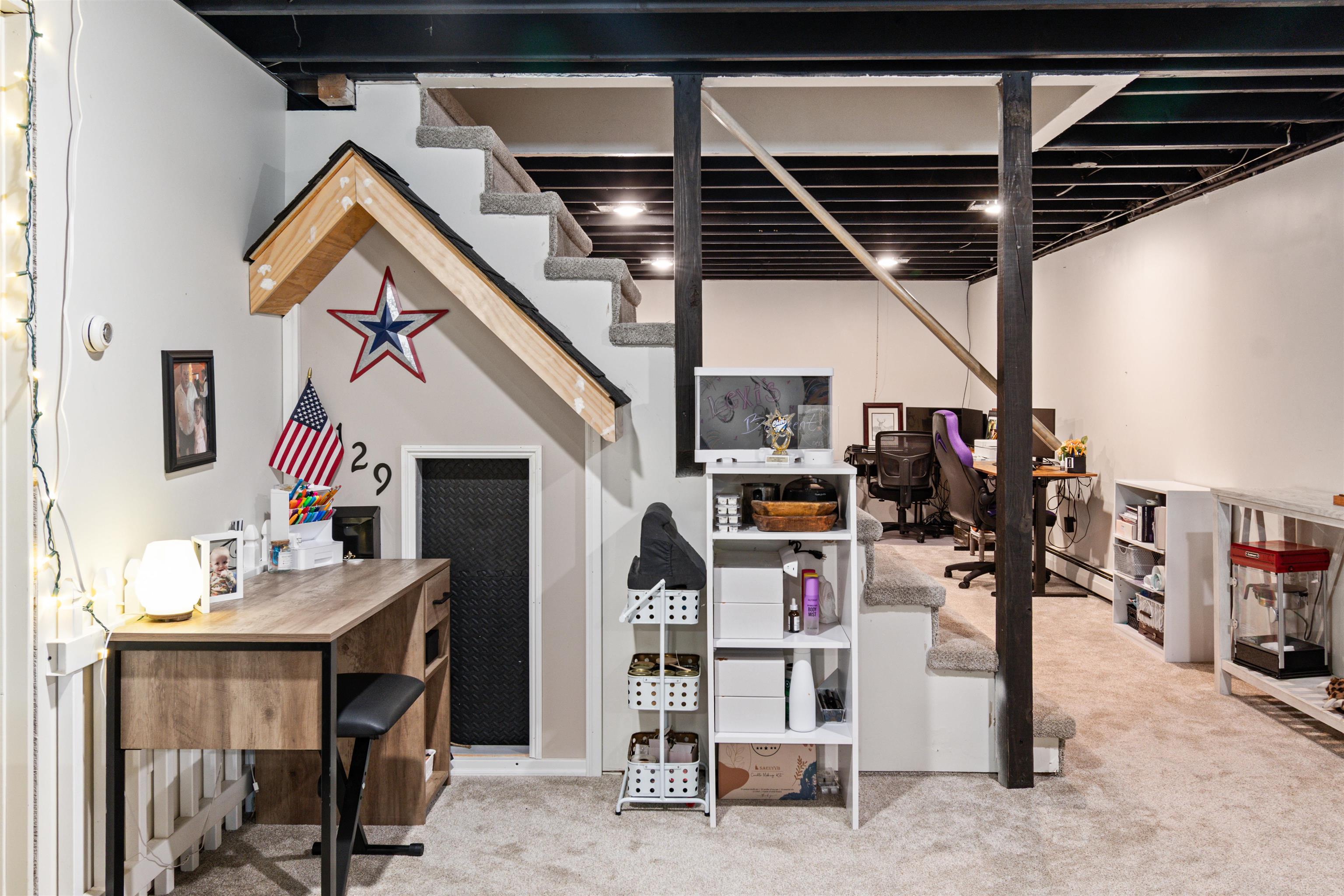 - Bulkhead, Concrete Floor, Finished, Partially Finished, Interior Stairs, Storage Space, Interior Access, Exterior Access, Basement Stairs