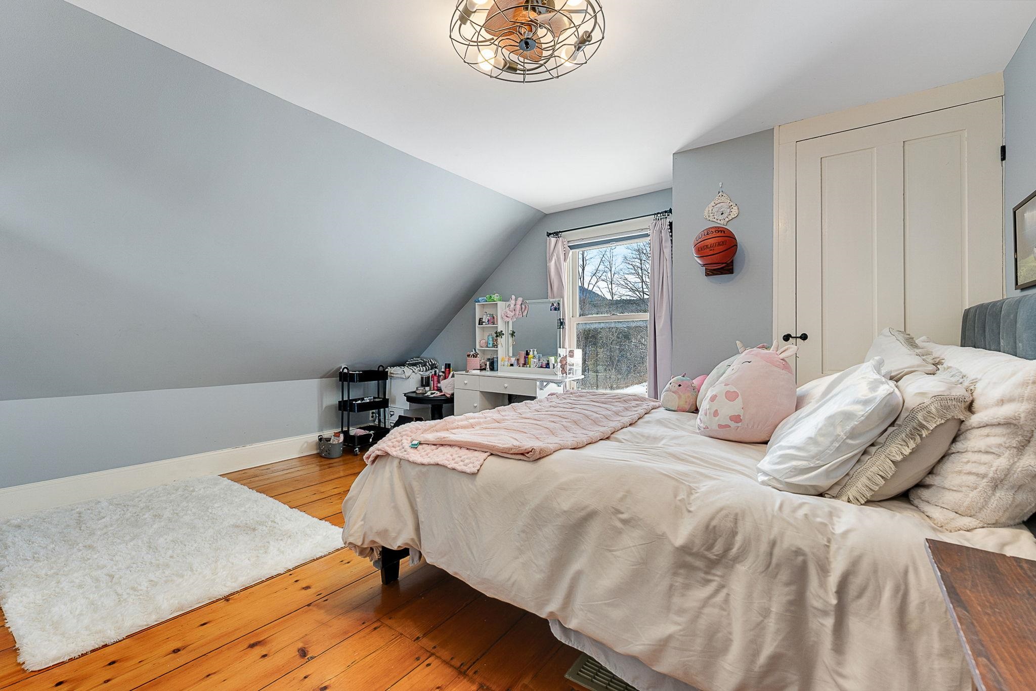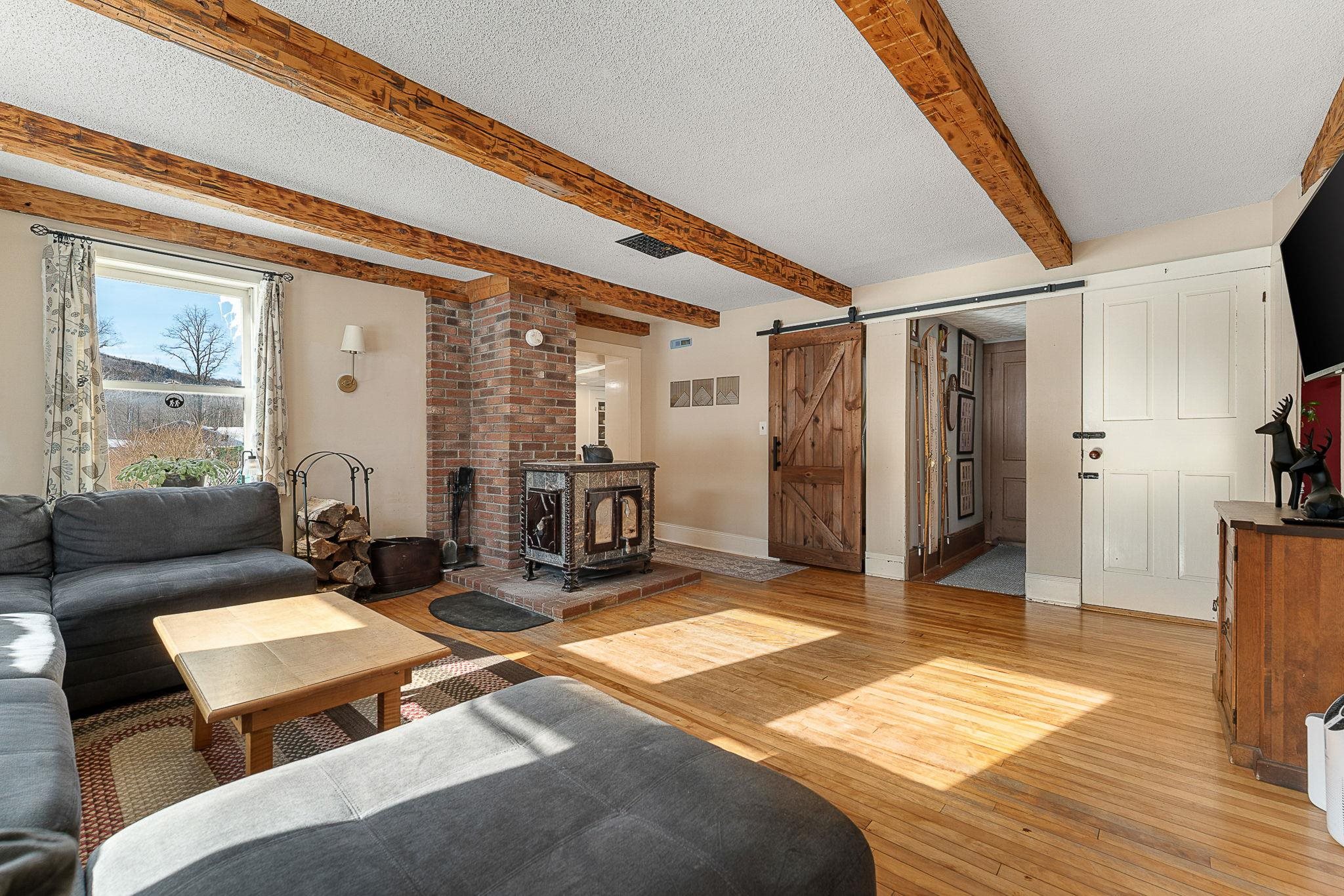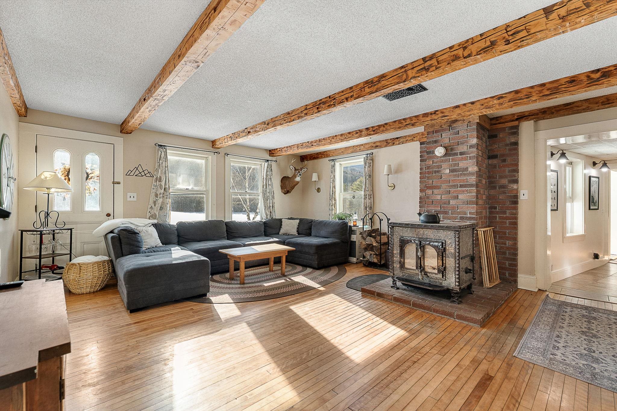 Timeless charm meets country comfort in this classic Cape-style farmhouse set on just under 4.5 acres with southern exposure and sweeping mountain views. This home features wide-plank wood floors, exposed beams, and sun-filled living spaces throughout. The main level offers exceptional flexibility with a first-floor primary bedroom, home office, dining room, sunroom, and a cozy living room anchored by a wood stove. The updated kitchen includes open shelving and generous workspace, while the attached garage leads to a convenient mudroom with laundry and ¾ bath. Owners have done a lot of work to the electrical and plumbing since they have owned it, making it truly move it ready. Upstairs are three additional rooms, a half bath, and bonus space for storage or future expansion. Outside, enjoy a true Vermont retreat with mature trees surrounding the property, established gardens, a chicken coop, fire pit, and a new swim-up pool with deck. Located near the Lamoille River and Rail Trail, with easy access to skiing, hiking, and the villages of Jeffersonville and Johnson—plus a reasonable commute to Burlington. Sellers are motivated—don’t miss this special property.