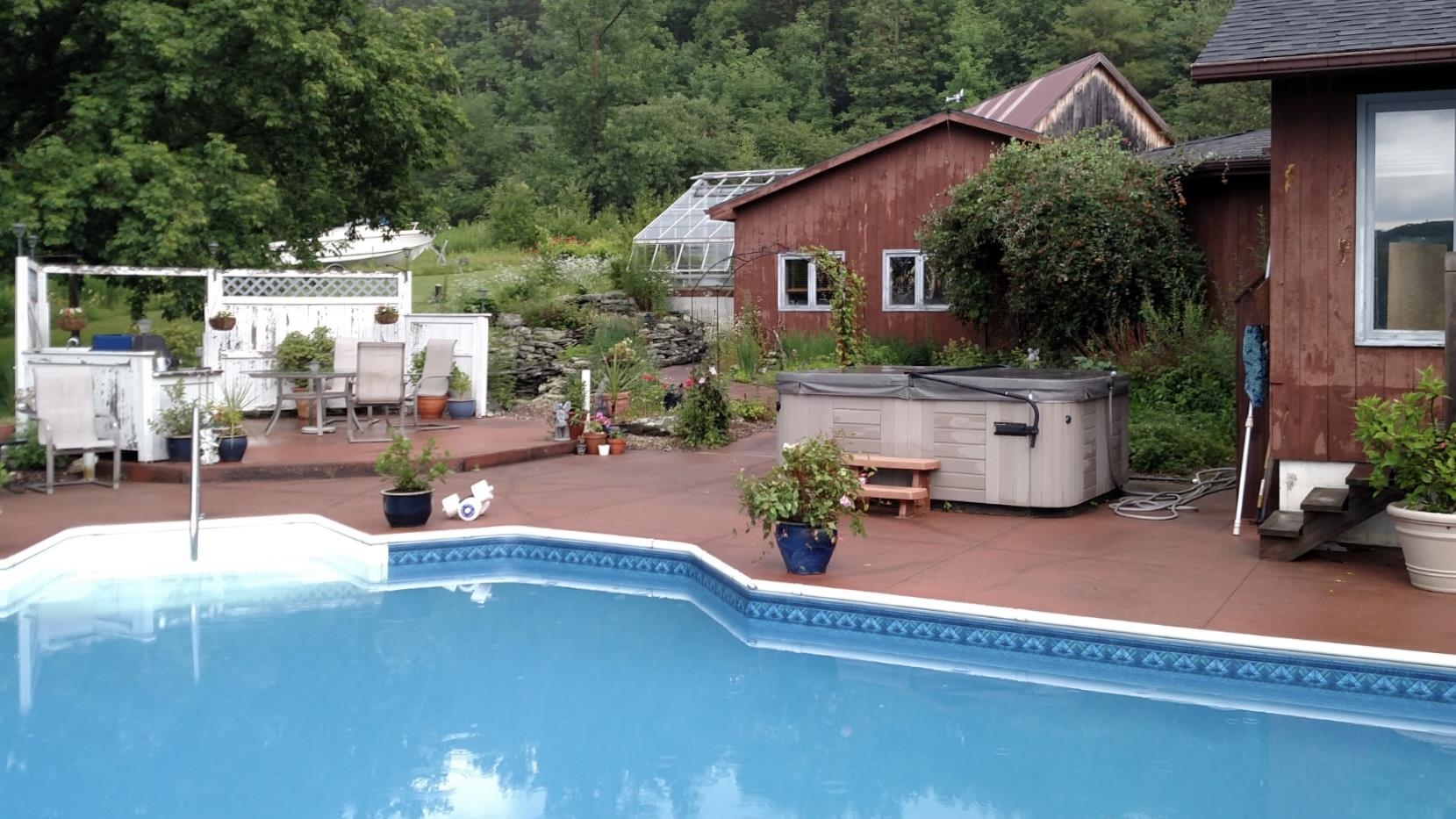 This countryside retreat was thoughtfully designed and built by the original owner and comprises over 3, 000+ living space, a 24’x48’ barn, workshop, pond with small waterfall, a 21’x14’ greenhouse, a 21’x41’ inground pool, custom patio with hot tub, perennials galore and stunning mountain views all perched on 4.68 acres. A true Vermont slice of heaven. The home offers extensive space to grow, with a welcoming breezeway to store all of your Vermont outdoor attire including a custom heated storage bench, an attached heated garage with storage above, and a separate in-home office space overlooking your backyard oasis. In the main living area of the home, you will find a fully equipped kitchen with appliances ranging from 2-6 years new. There is a breakfast bar that transitions you into the formal dining room that offers a custom buffet built in. A large, cozy living room is situated to overlook the pool and grounds, as well as enjoy evening sunsets over the mountains. Down the hallway you will find two suitably sized bedrooms and a ¾ bathroom. This is also where you will find the Southern facing primary suite with a combination W/D, large windows immersing you in nature, and an attached bathroom with soaking tub and shower. The basement is mostly finished into a state-of-the-art game and lounge room, with 3 additional finished bonus rooms and a spare laundry room with W/D. The barn, built in 2002, has a ready to use 12’x24’ workshop space that is insulated, heated, and plumbed with a sink. The remainder of the barn has plenty of room for horse stalls and tack room, or other animals to create your Vermont Homestead. The greenhouse or “Pit House” sits below grade for added insulation and has automatic and manual venting systems, two sources of water, cedar bench tops, hot water tank, and plumbing for a misting system. This property has the potential to be a hobby farm, small garden center, pottery shop, art studio, wood working facility, or just your private sanctuary!