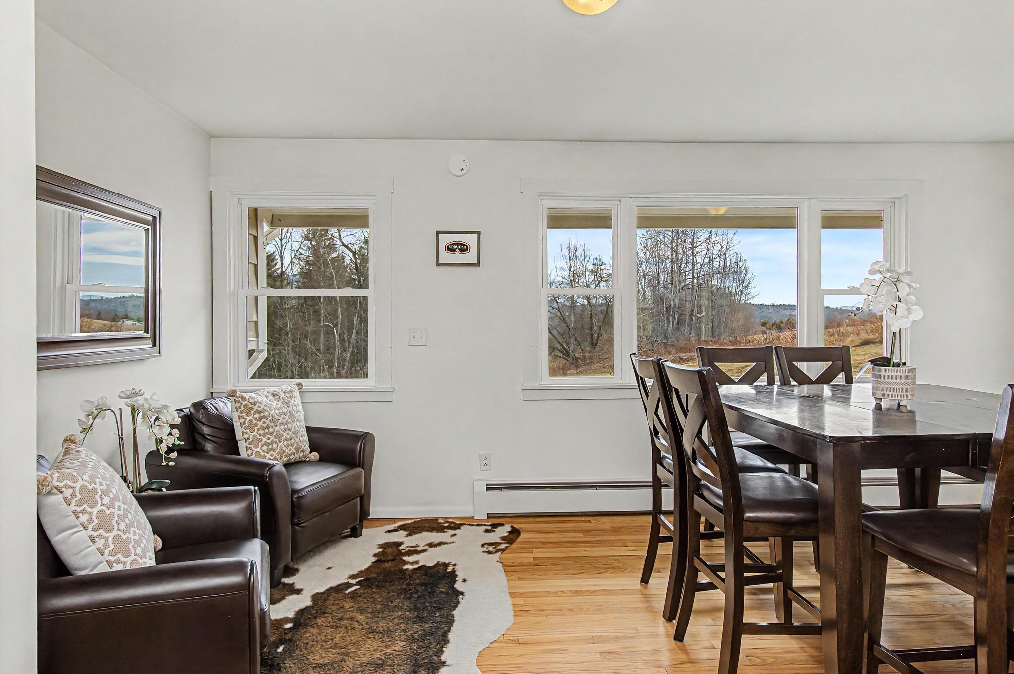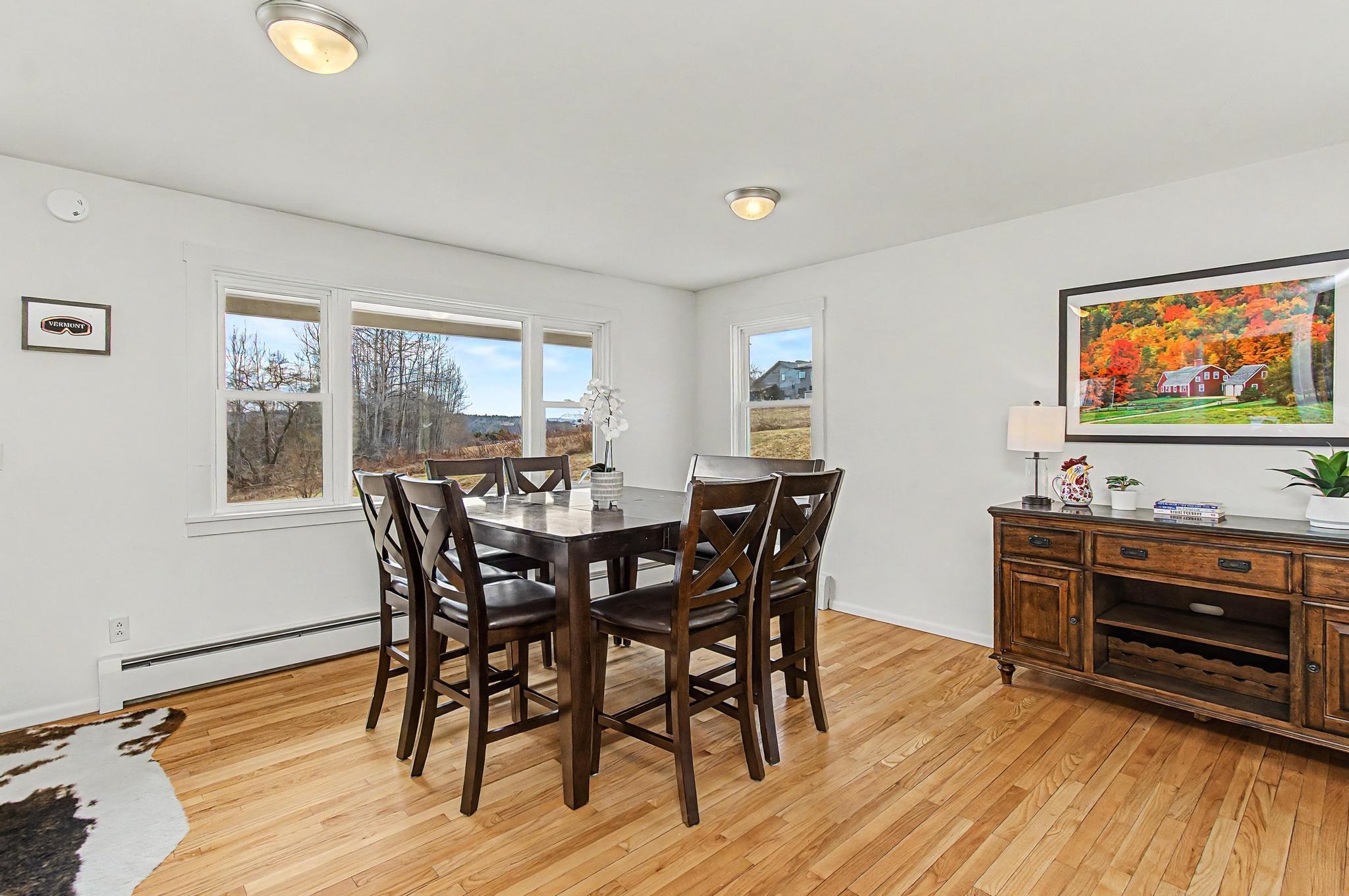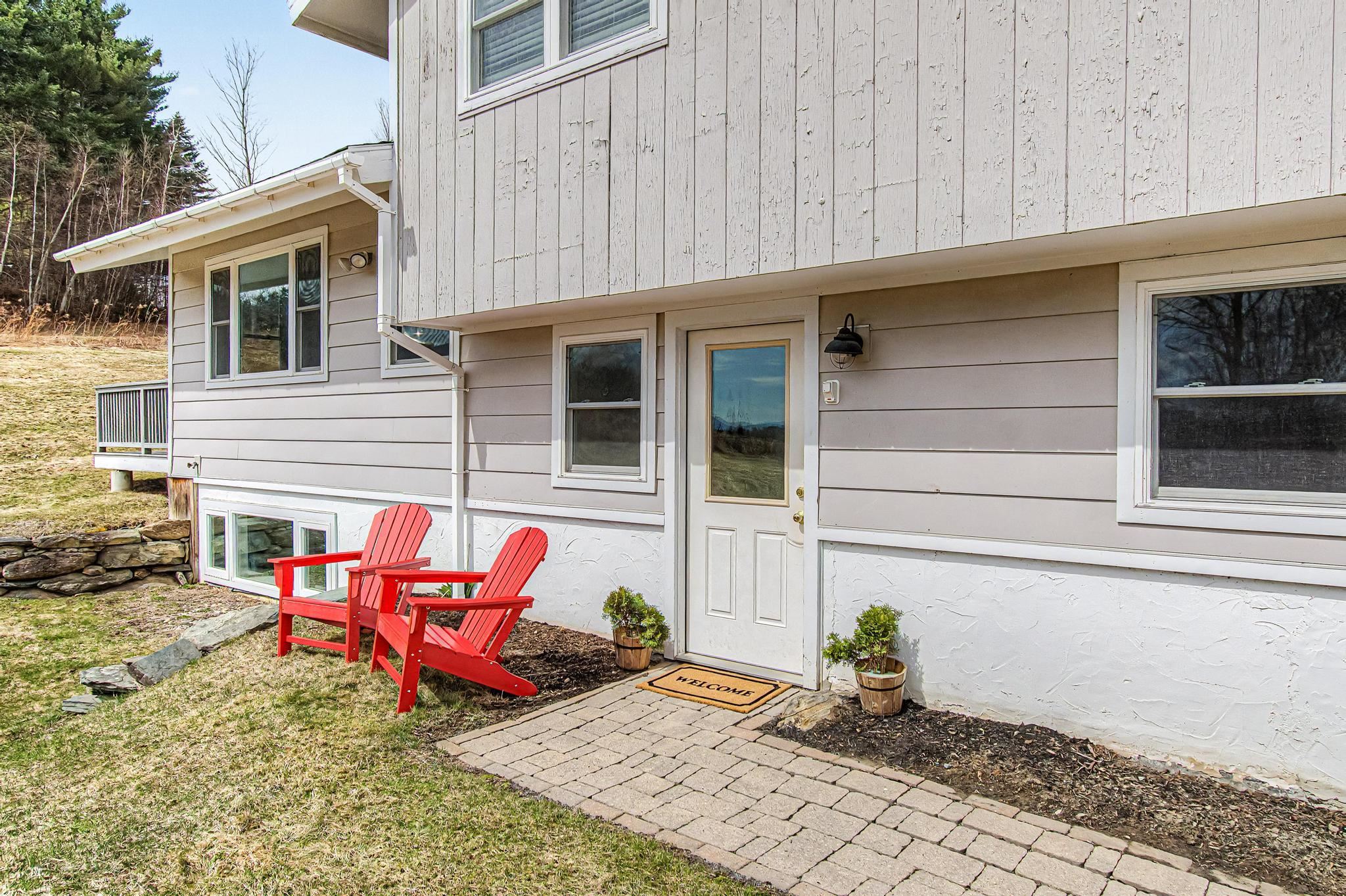 Set along one of Stowe’s most desirable corridors, this Weeks Hill Road property offers a combination of elevated positioning, pastoral views and everyday functionality. Situated on a 1.18-acre lot with southwest-facing exposure, the home looks out across rolling hills and the surrounding valley, with an open lawn framed by a natural landscape backdrop that enhances both privacy and setting. Inside, the home features a functional and efficient layout with clearly defined living and dining areas. A subtle change in elevation between spaces creates a sense of separation while maintaining an easy, natural flow. The living area is filled with natural light and offers flexibility for a variety of furniture arrangements, while the adjacent dining area connects seamlessly to the kitchen and a spacious rear deck—ideal for indoor-outdoor living. Hardwood flooring runs throughout the main living spaces and bedrooms, complemented by clean, neutral finishes that make the home move-in ready while offering a blank canvas for personalization. Multiple bedrooms provide flexible options for guests, rental use, or a home office, with practical layouts and ample closet storage. Two full bathrooms support comfortable daily living. The rear deck extends the living space outdoors, offering room for seating and grilling, with direct access to the yard below. The home’s elevated position not only enhances the views but also adds to the sense of privacy, creating an inviting environment for relaxing or entertaining. Conveniently located with easy access to Stowe Village, recreation trails, and ski areas, this property presents an excellent opportunity to enjoy all that Stowe has to offer from a peaceful, scenic setting.