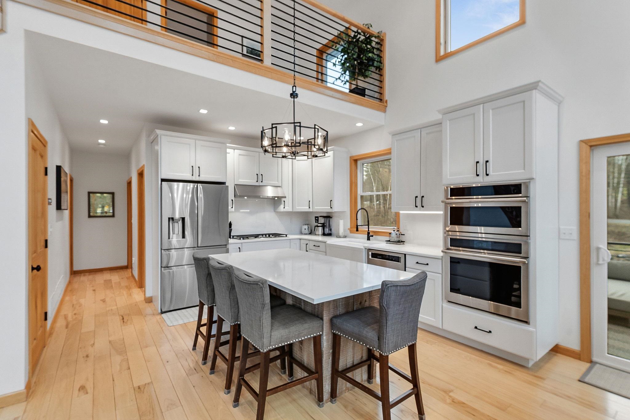 - Blinds, Cathedral Ceiling, Ceiling Fan, Dining Area, Draperies, 1 Fireplace, Furnished, Kitchen Island, Enrgy Rtd Lite Fixture(s), LED Lighting, Primary BR w/ BA, Natural Light, Natural Woodwork, Walk-in Closet, Basement Laundry, Smart Thermostat