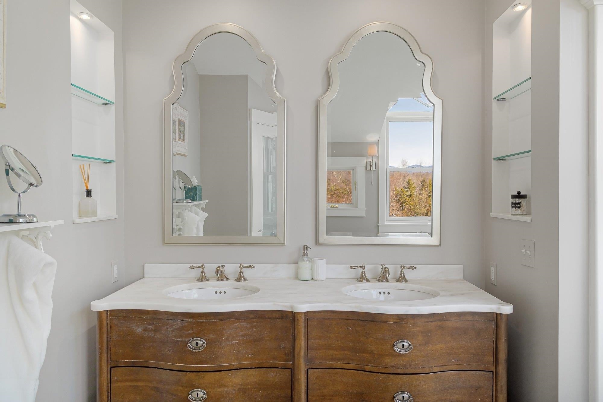 Tucked within one of Stowe’s most exclusive enclaves, 615 Bryan Road offers a rare blend of complete privacy and views of Mount Mansfield, creating an elevated mountain lifestyle that feels worlds away, yet sits just minutes from the vibrant heart of Stowe Village. Spanning over 4, 000 square feet, the home is thoughtfully designed to balance expansive, light-filled gathering spaces with more intimate retreats. At its center, a professional-grade kitchen flows seamlessly into the dining area and vaulted great room where a custom timber mantel and wood-burning fireplace anchor a timeless Vermont aesthetic. A generous covered porch extends the living space outdoors, overlooking a serene, swimmable pond fed by a continuous freshwater source and framed by mature perennial gardens—an ideal setting for quiet mornings or relaxed entertaining. The home offers exceptional privacy for both owners and guests, with well-appointed en-suite bedrooms and refined finishes throughout. The primary suite is a true retreat, featuring a private sitting area, reading nook, and a spa-like bath with a soaking tub positioned to capture views of Mount Mansfield, along with a custom marble shower with hand-set marble and onyx mosaic that add texture, depth, and craftsmanship to the space. Wellness and comfort are seamlessly integrated, with a gym, indoor sauna, steam shower, outdoor hot tub, and seasonal outdoor shower. Direct access to the nearby Pinnacle trails enhances the home’s appeal for outdoor enthusiasts. Additional features include a dedicated home office, fieldstone walkways, whole-property generator, advanced security system, and integrated Sonos audio. Whether utilized as a year-round residence, a high-end investment, or a refined retreat, 615 Bryan Road is a rare offering that delivers a blend of privacy, sophistication, and proximity to the very best of Stowe.